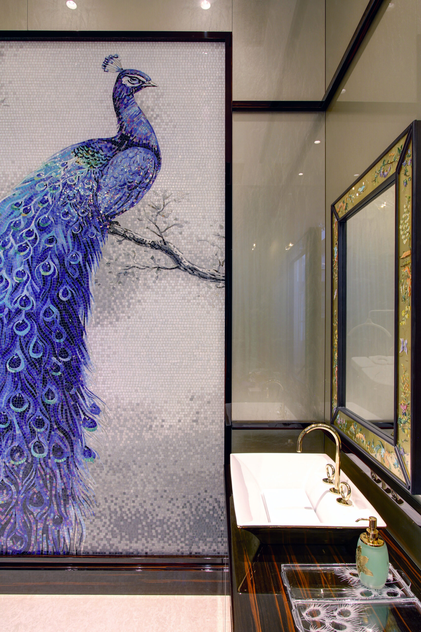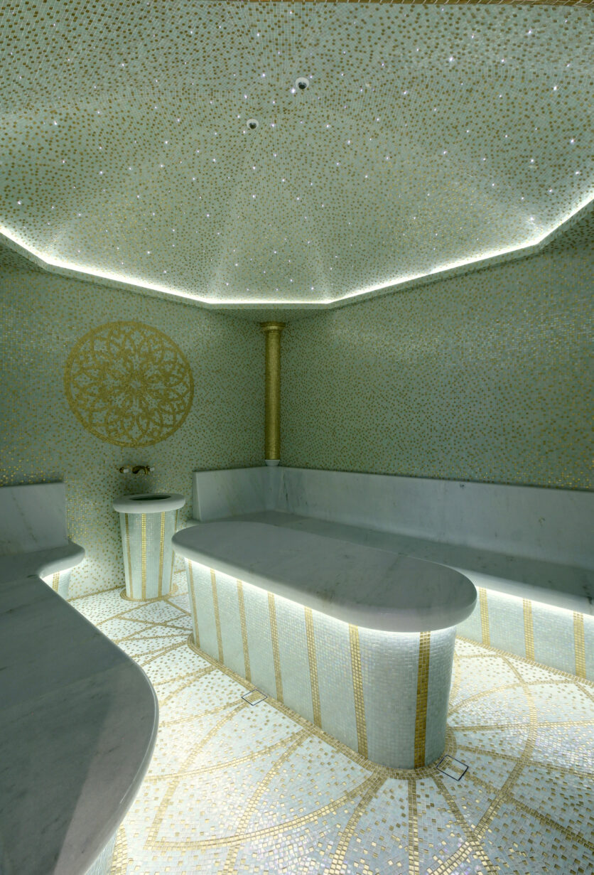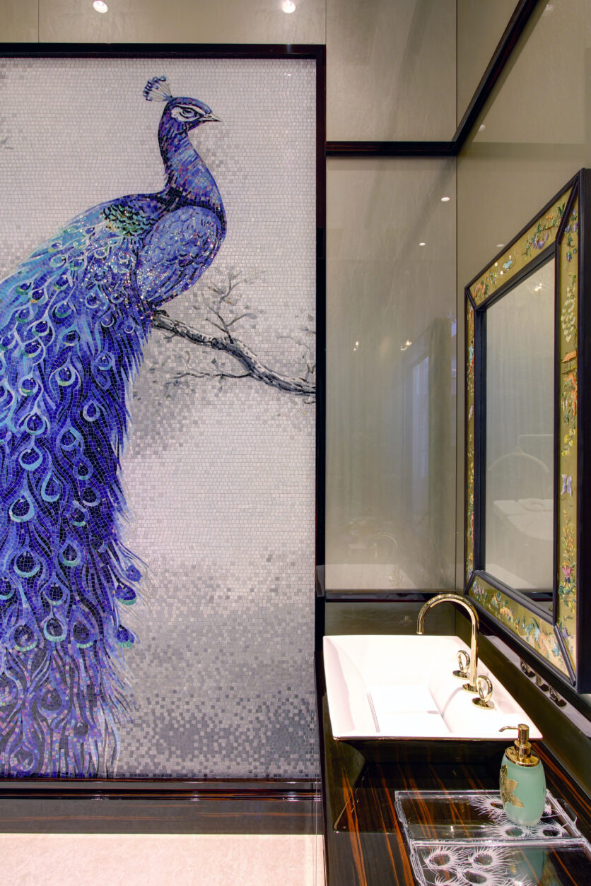 Nei bagni, l’intervento assume un tono più intimo grazie a delicate decorazioni floreali che introducono un elemento naturale stilizzato. Due grandi pannelli artistici, uno dedicato alla figura di un pavone e l’altro a una composizione di uccelli esotici, arricchiscono rispettivamente la sala massaggi e la zona doccia, portando nella quotidianità un gesto poetico e scenografico. La scelta dei materiali rivela l’identità di Friul Mosaic: vetro pregiato, inserti in vetro con foglia d’oro e marmo dialogano in superfici vibranti, capaci di modulare la luce e creare atmosfere cangianti. L’hammam si distingue per un mosaico dai toni sfumati, costruito su un disegno geometrico che genera profondità e luminosità, mentre i pannelli artistici, di circa sei metri quadrati ciascuno, sono interamente in vetro per valorizzare ogni riflesso e microdettaglio. A completare il percorso estetico e materico interviene la pavimentazione geometrica in marmo e vetro tagliato a getto d’acqua, un equilibrio raffinato che definisce l’intero progetto come un esempio di integrazione tra arte, tecnica e design.