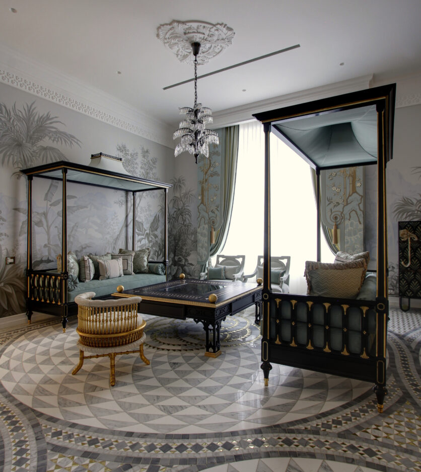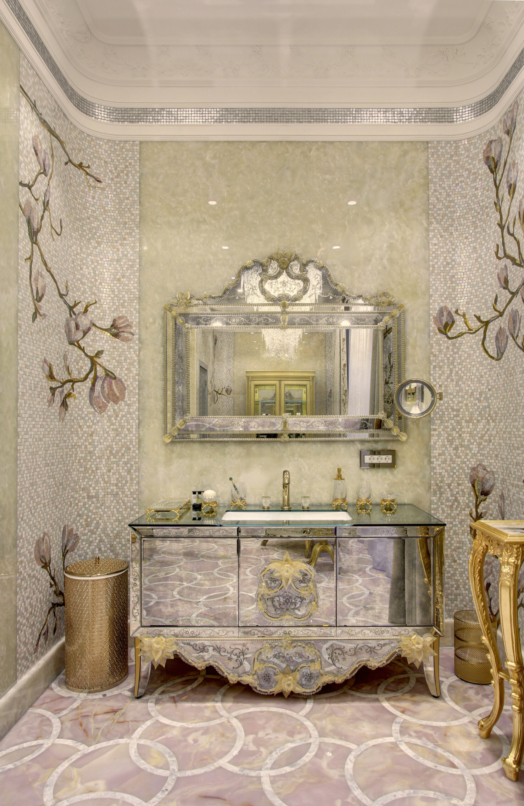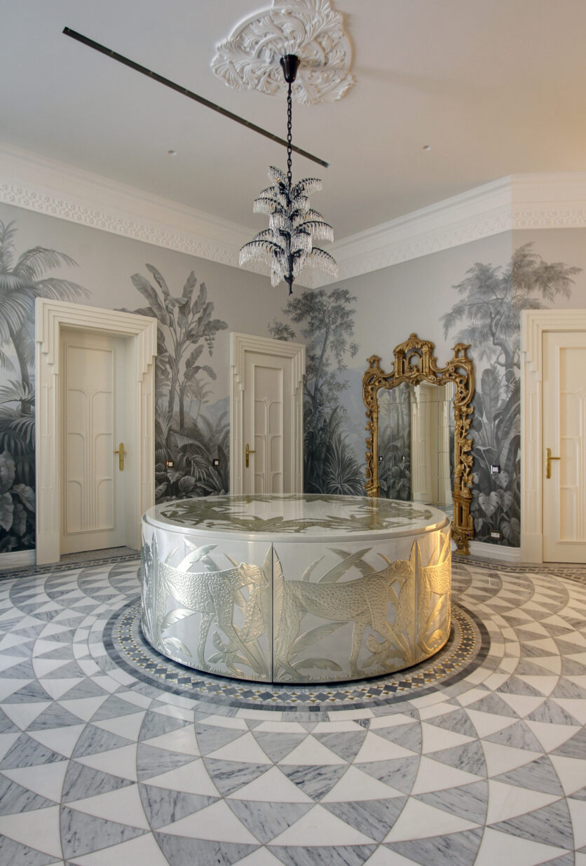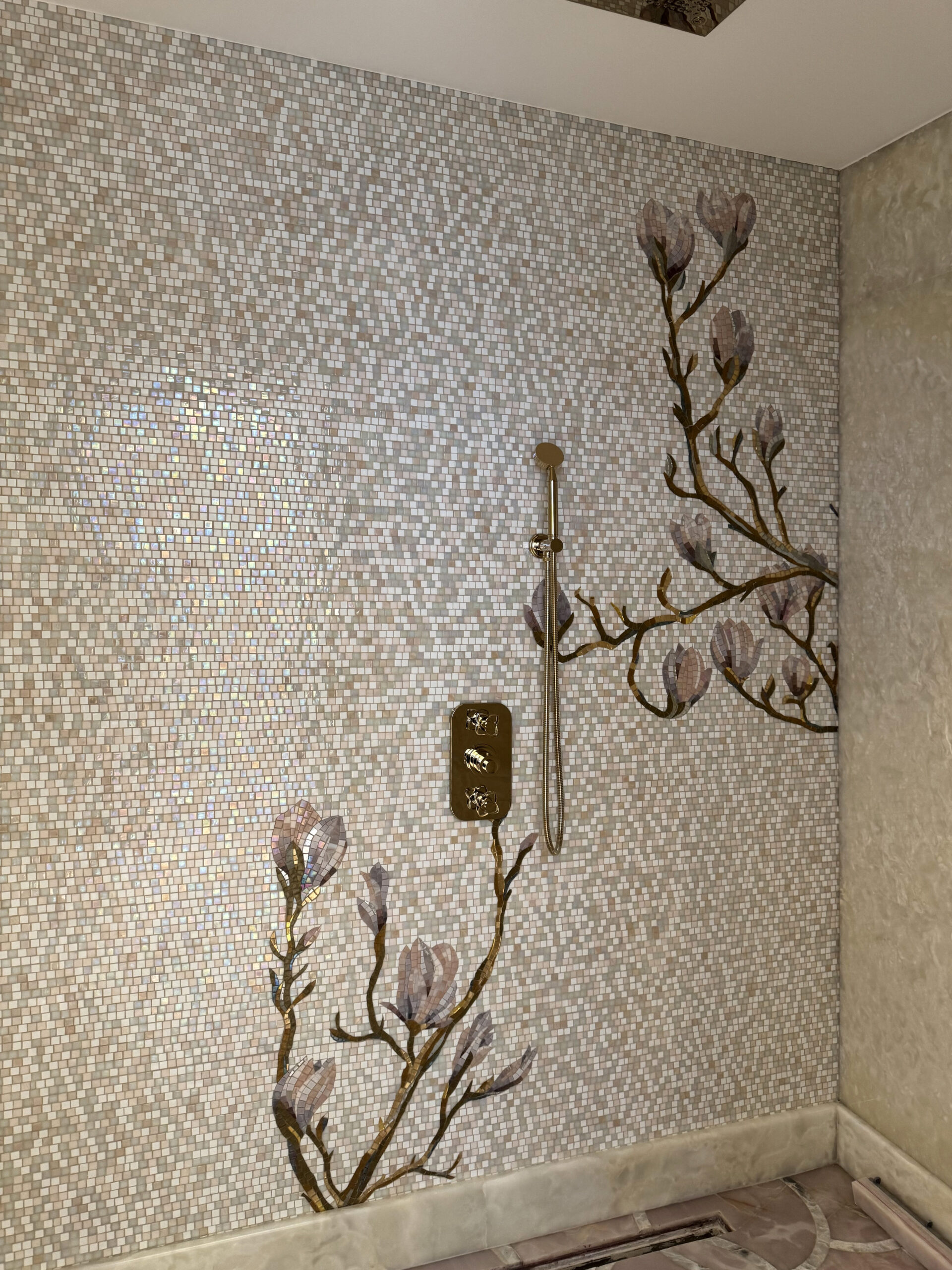 Nei bagni, l’intervento assume un tono più intimo grazie a delicate decorazioni floreali che introducono un elemento naturale stilizzato. Due grandi pannelli artistici, uno dedicato alla figura di un pavone e l’altro a una composizione di uccelli esotici, arricchiscono rispettivamente la sala massaggi e la zona doccia, portando nella quotidianità un gesto poetico e scenografico. La scelta dei materiali rivela l’identità di Friul Mosaic: vetro pregiato, inserti in vetro con foglia d’oro e marmo dialogano in superfici vibranti, capaci di modulare la luce e creare atmosfere cangianti. L’hammam si distingue per un mosaico dai toni sfumati, costruito su un disegno geometrico che genera profondità e luminosità, mentre i pannelli artistici, di circa sei metri quadrati ciascuno, sono interamente in vetro per valorizzare ogni riflesso e microdettaglio. A completare il percorso estetico e materico interviene la pavimentazione geometrica in marmo e vetro tagliato a getto d’acqua, un equilibrio raffinato che definisce l’intero progetto come un esempio di integrazione tra arte, tecnica e design.