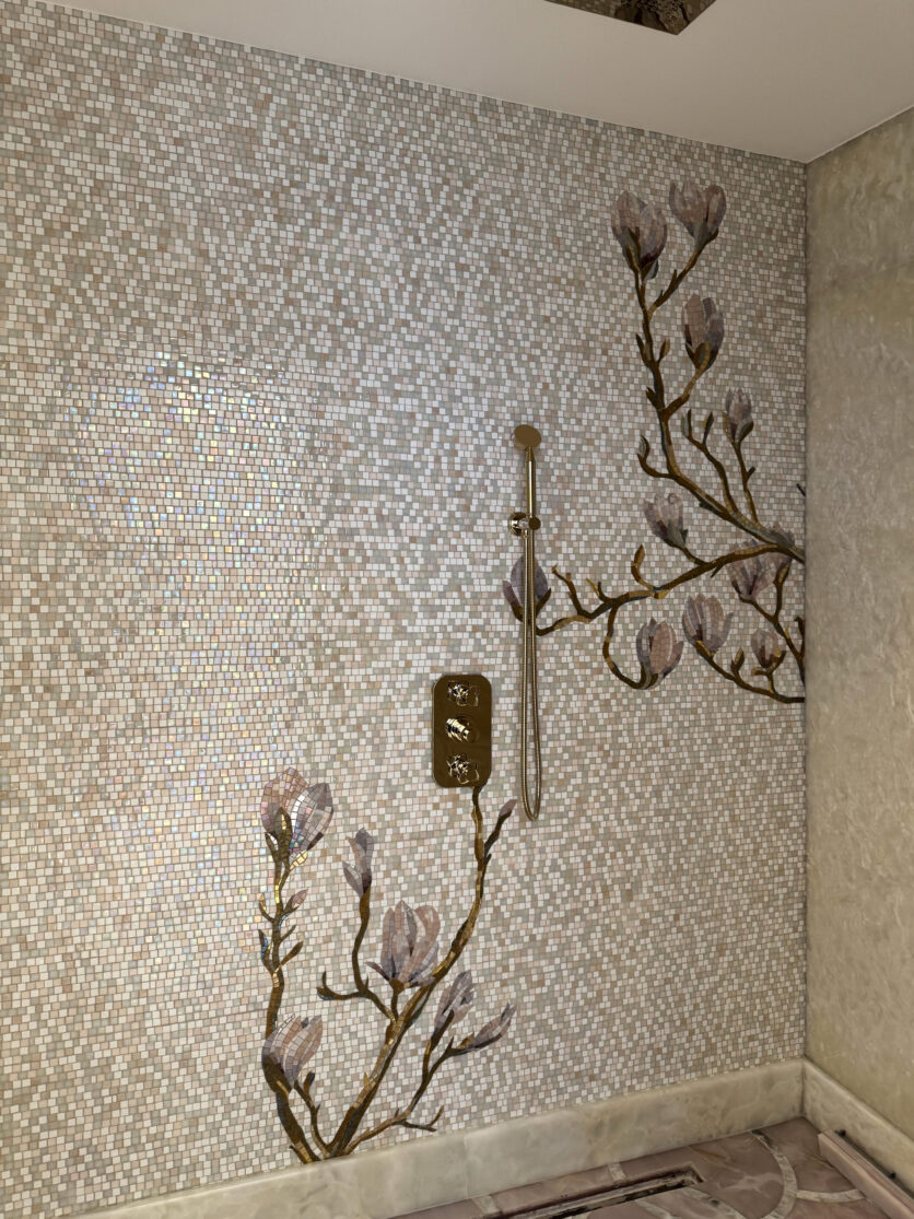 Completato tra il 2023 e il 2024, il progetto affidato a Friul Mosaic rappresenta un dialogo riuscito tra maestria artigianale e innovazione tecnica. L’azienda ha firmato un intervento su misura all’interno di una villa privata che fonde eleganza decorativa e precisione progettuale, dando vita a un insieme di ambienti in cui raffinati mosaici in vetro e la pavimentazione a motivi geometrici costruiscono un racconto visivo coerente.