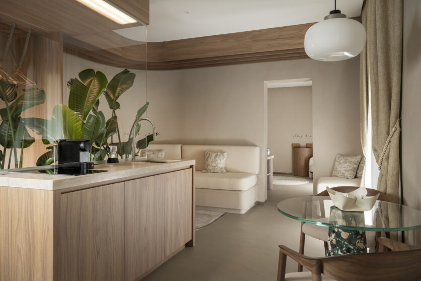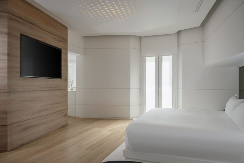 In questo contesto, il contributo di Gruppo Saviola è stato determinante. Le suite della struttura sono state realizzate utilizzando il Pannello Ecologico®, materiale simbolo dell’azienda prodotto con legno 100% riciclato e riciclabile. Questa scelta rappresenta una sintesi perfetta tra bellezza e consapevolezza ambientale, dimostrando come l’uso di risorse circolari possa convivere con l’eleganza del design contemporaneo. Ogni ambiente diventa così espressione di uno stile sostenibile, in cui le superfici e i decori ispirati al legno naturale, alle tinte neutre e alle suggestioni della natura restituiscono un’atmosfera accogliente e raffinata.
