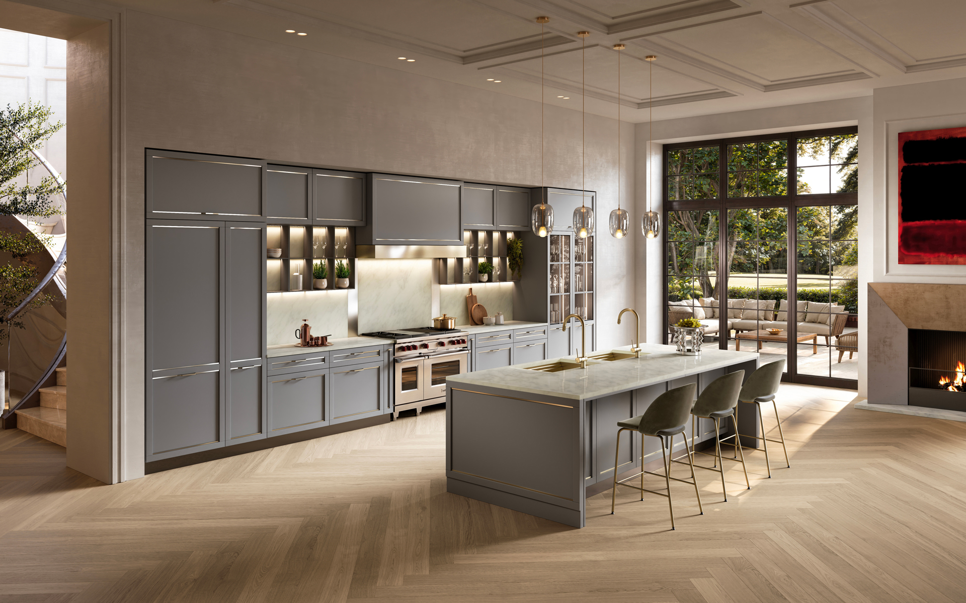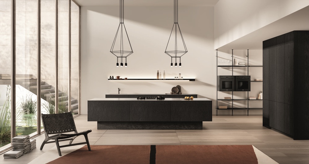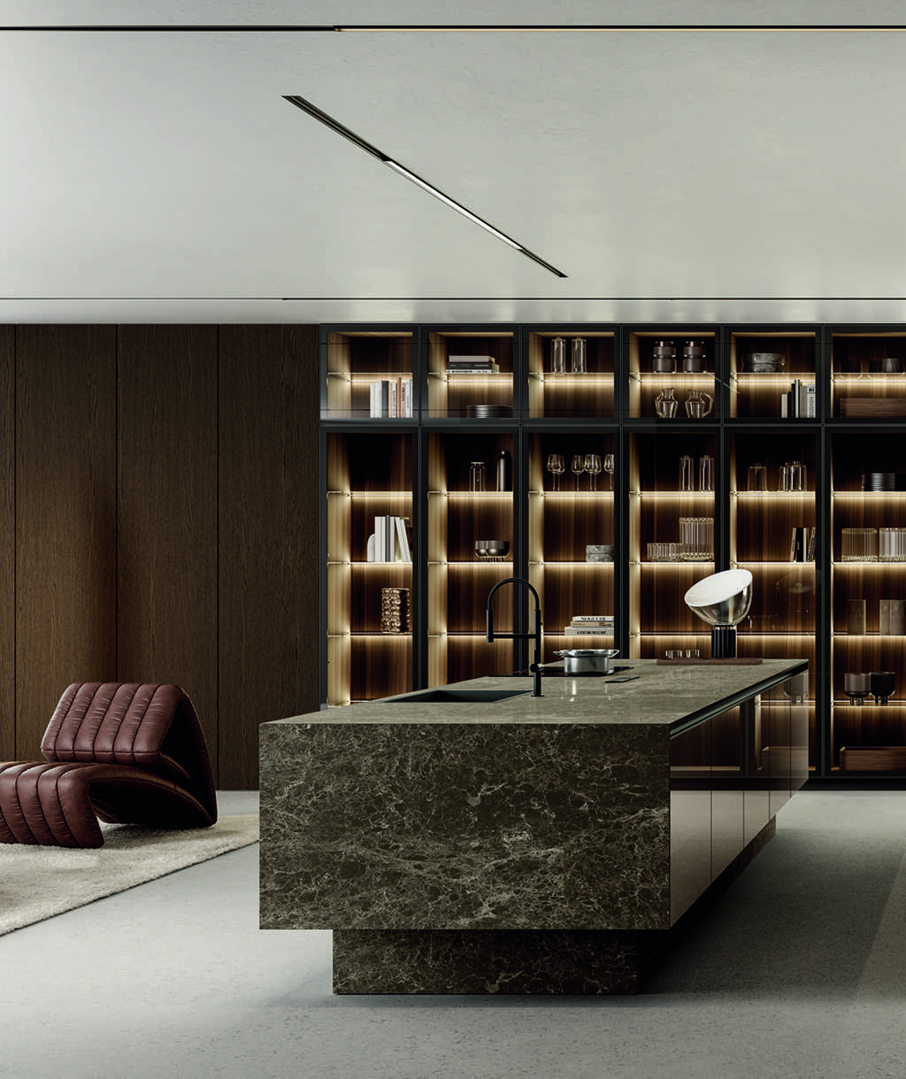 Natural Rationalism propone un equilibrio tra rigore progettuale e matericità naturale, dando vita a spazi essenziali in cui superfici organiche e dettagli curati definiscono un’idea di benessere misurato, con la cucina al centro come elemento di connessione tra rappresentazione ed operatività. Questo fulcro si sviluppa attraverso una composizione articolata in due ambiti distinti ma complementari: da un lato una zona più formale e scenografica, caratterizzata da linee pulite e dalla presenza dell’isola ONDA, nata dalla collaborazione con Zaha Hadid Architects, che introduce un segno fluido e iconico; dall’altro una parte più funzionale e operativa, organizzata con soluzioni tecniche avanzate e materiali raffinati. A collegare questi due mondi è una continuità progettuale fatta di finiture, superfici e dettagli che si estende anche agli ambienti circostanti, come il living, dove il linguaggio ONDA prosegue attraverso elementi che evocano il movimento dell’acqua. Ne deriva uno spazio armonico e coerente, in cui forma, funzione ed emozione convivono, trasformando la cucina in un luogo centrale capace di mettere in relazione estetica e quotidianità.