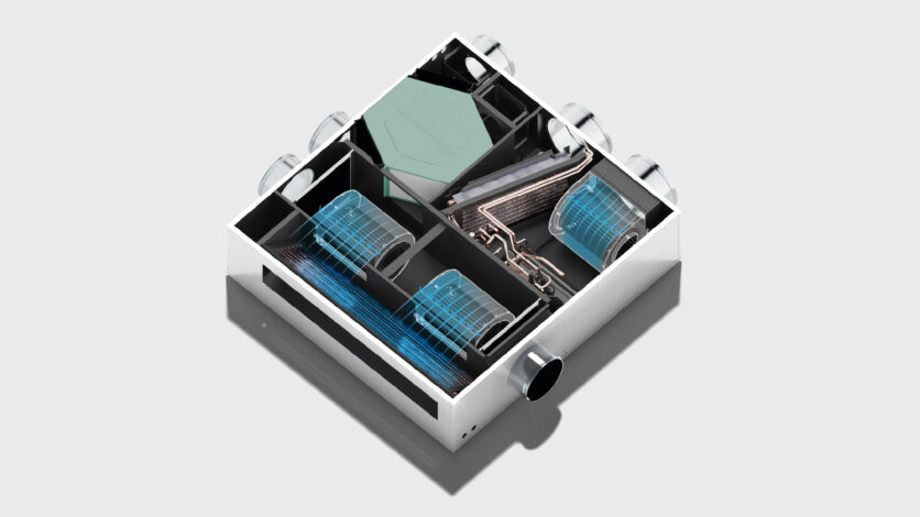 Thanks to its ability to constantly renew indoor air without the need to open windows, the system helps maintain a healthy environment with filtered, oxygen-rich air, while eliminating carbon dioxide, fine dust, odours and volatile organic compounds. In addition, it uses the energy contained in the exhaust air as a source to power an internal heat pump, heating or cooling rooms efficiently, with the correct degree of humidity and significant energy savings when outside conditions allow.