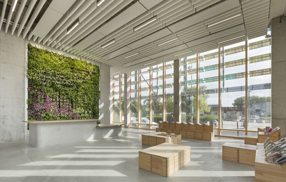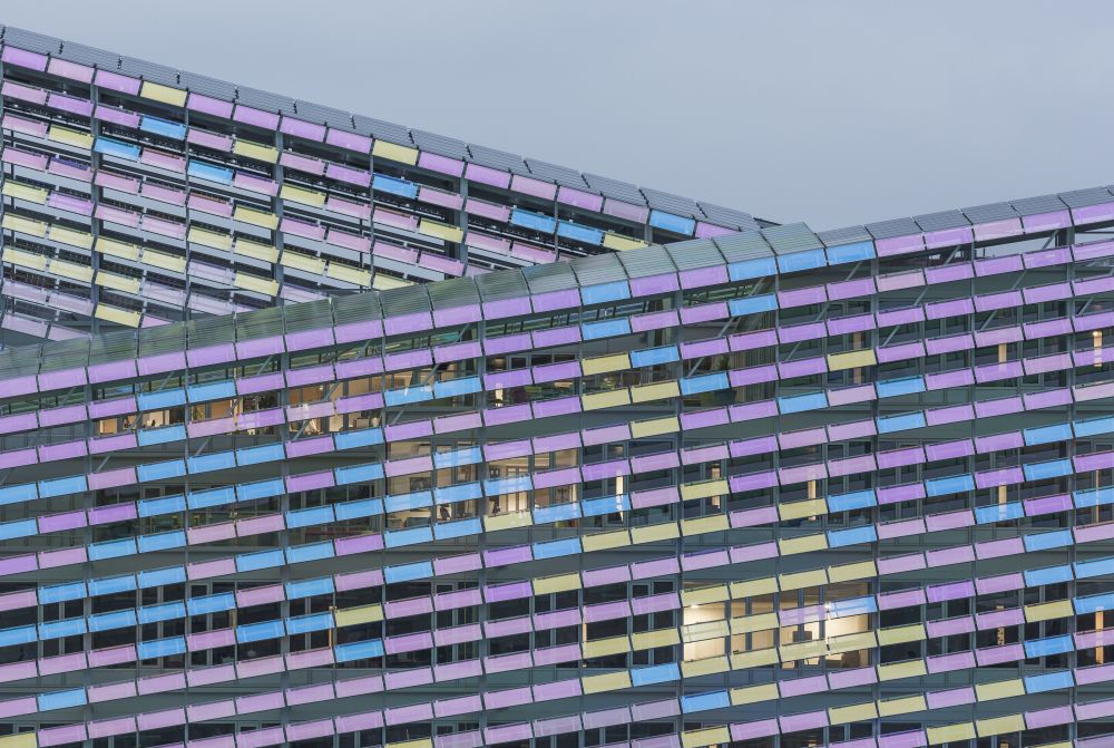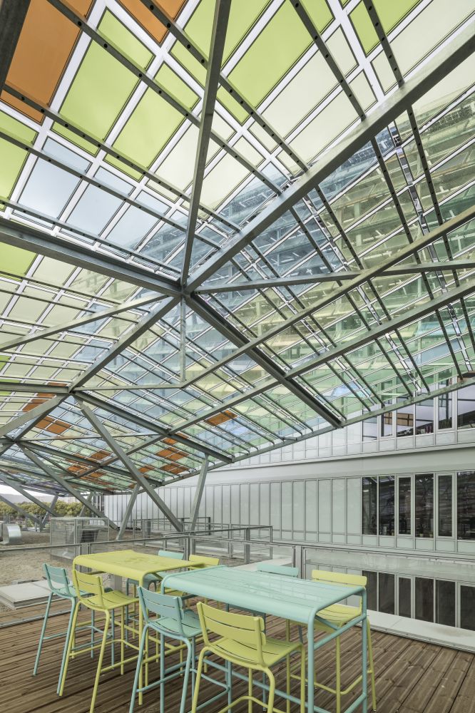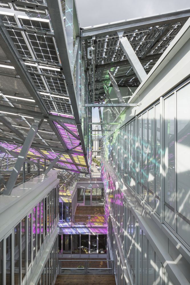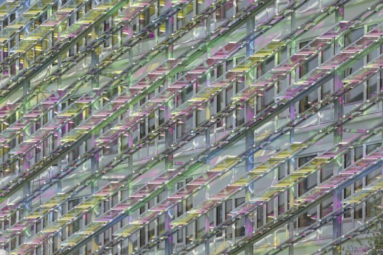 The building’s terrace is home to the iridescent panels and produces a unique atmosphere depending on the movement of the sun’s rays. The short façades express the mask of the building and the result is an outer shell enveloped in a world of colours. The studio said that it had been inspired by the works of Claude Monet, thereby proposing an example of architecture that changes according to its relationship with light and with natural elements.