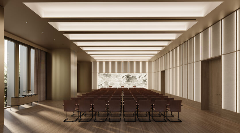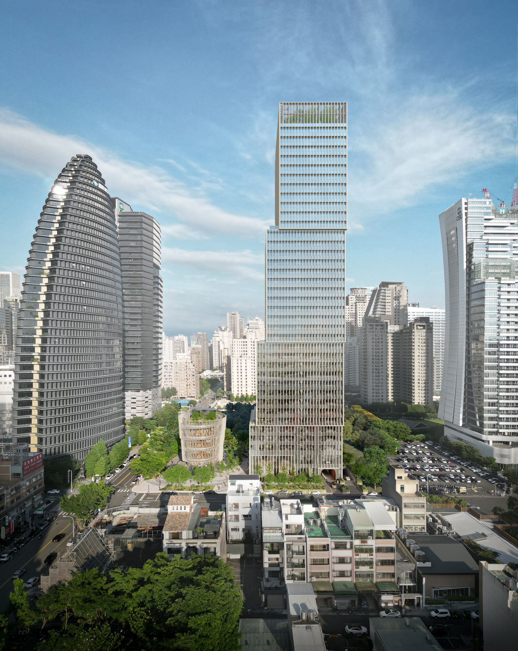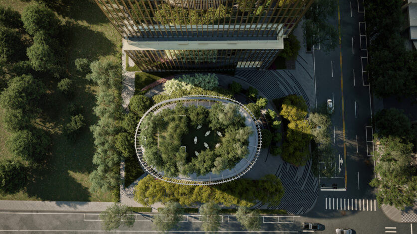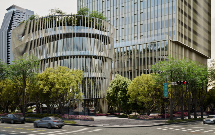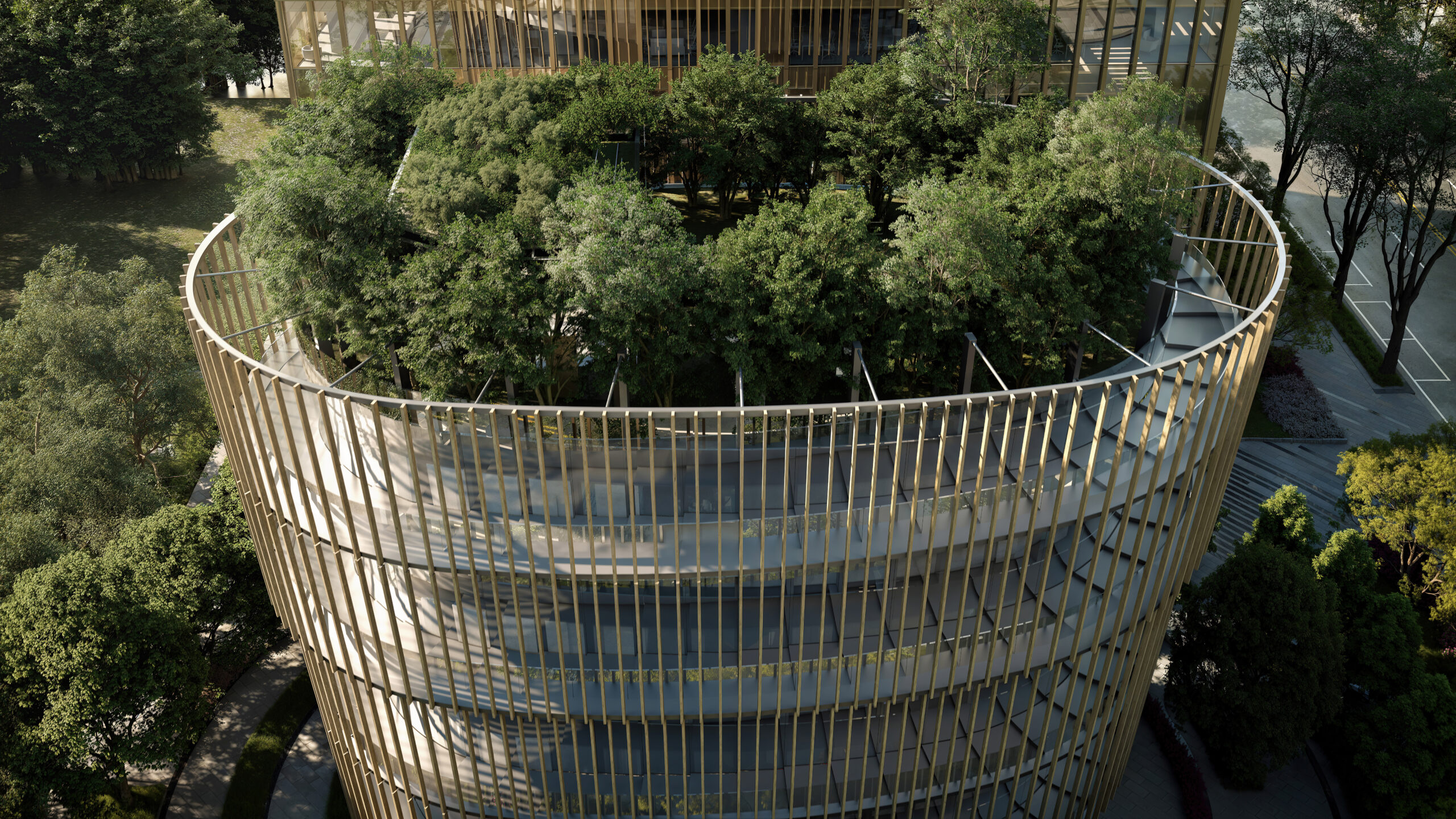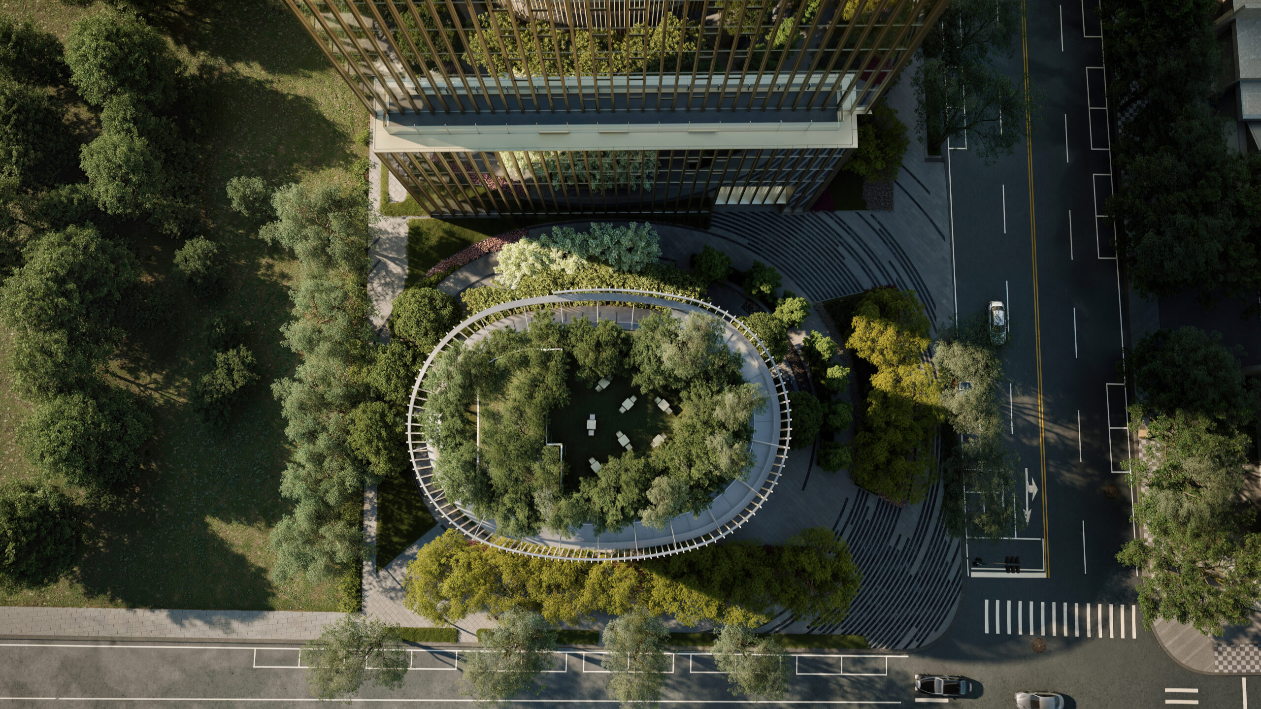 Al piano terra, un atrio a doppia altezza accoglie i visitatori con rivestimenti in vetro custom e pietra naturale Grigio Olivo, in continuità materica con i volumi sovrapposti della torre. I piani superiori ospitano uffici luminosi con viste panoramiche, mentre uno spazio multifunzionale dedicato a eventi e conferenze offre la possibilità di diverse configurazioni, da ballroom a sala meeting. Accanto alla torre, una Galleria commerciale di quattro piani si ispira alla forma di un cesto di bambù. Il volume ellittico, scandito da pilastri in pietra e scale esterne a spirale, integra giardini pensili e percorsi fluidi tra interno ed esterno. Lo spazio pubblico tra torre e Galleria diventerà una piazza accogliente e verde, concepita come nuovo punto di incontro per la comunità.