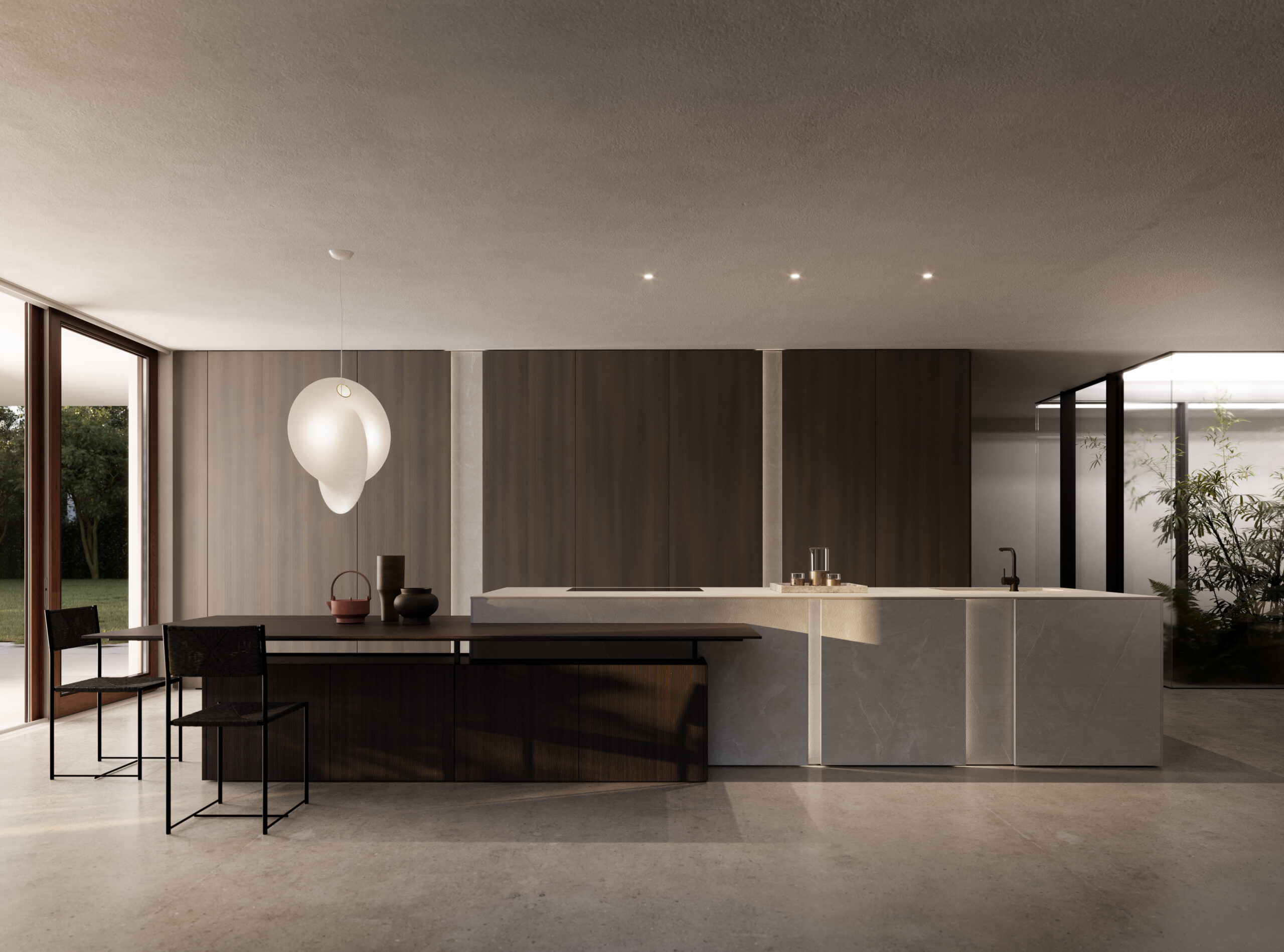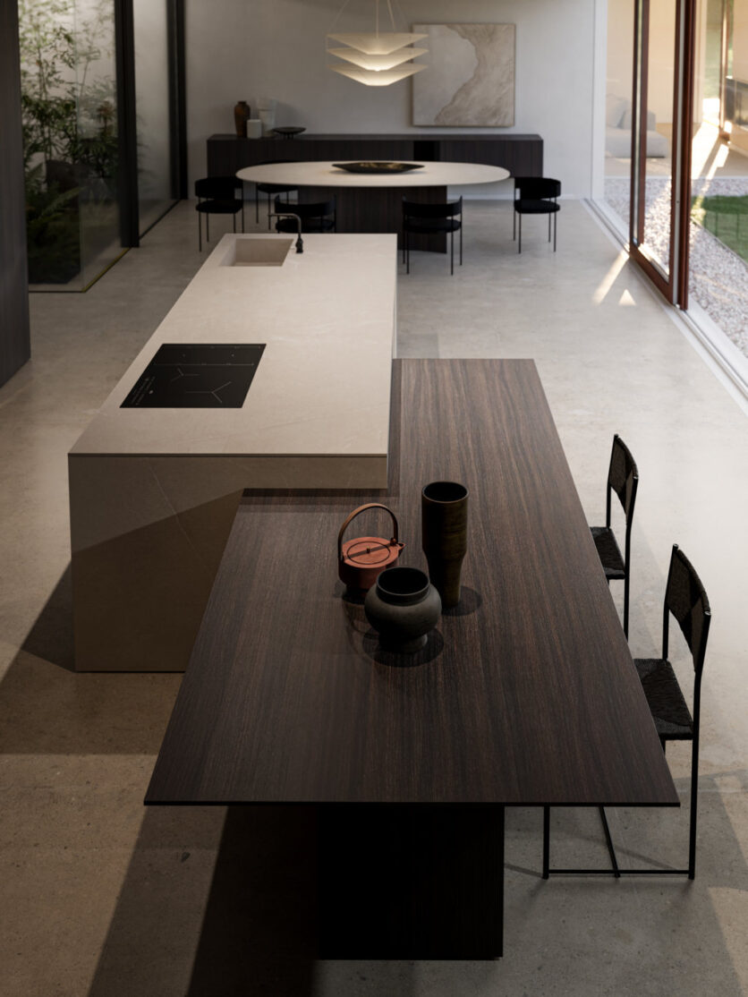 L’isola e il rivestimento a parete, realizzati in gres Gold Pearl, si presentano come superfici essenziali e vibranti di texture, dove pieni e vuoti si alternano in un ritmo calibrato. La luce, elemento chiave della composizione, ne disegna i contorni e amplifica la profondità.