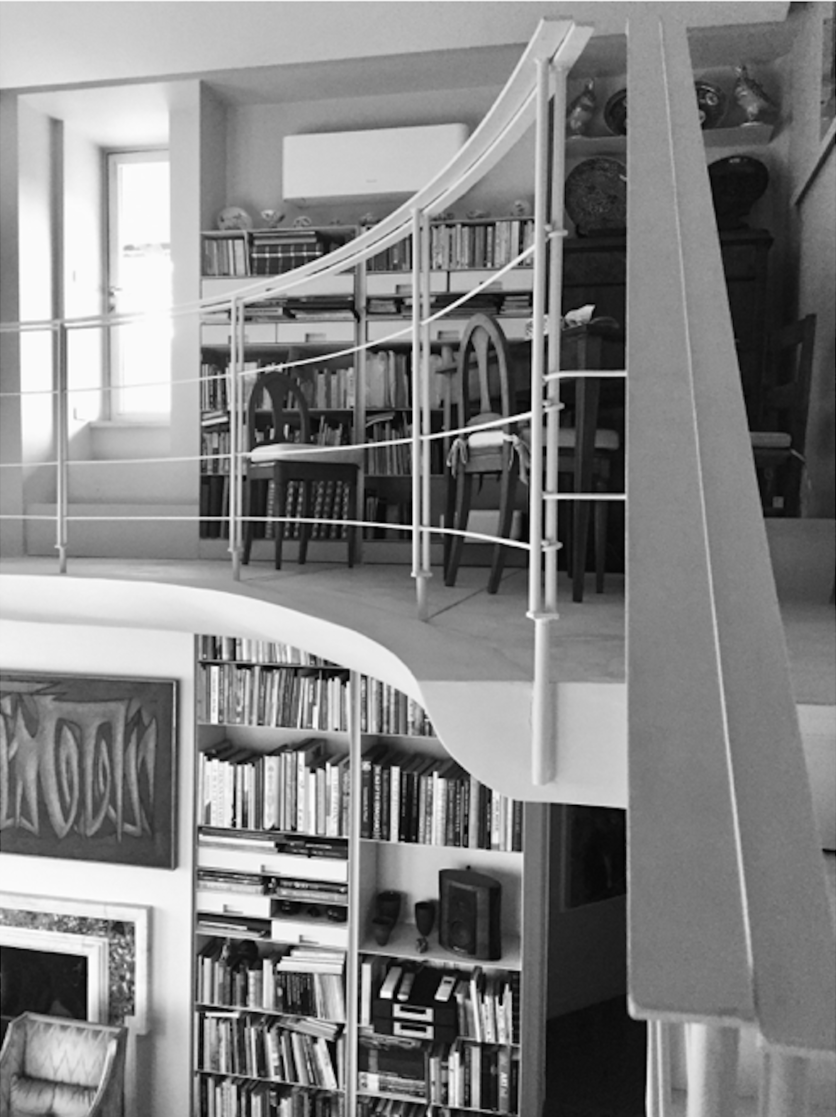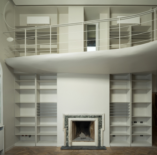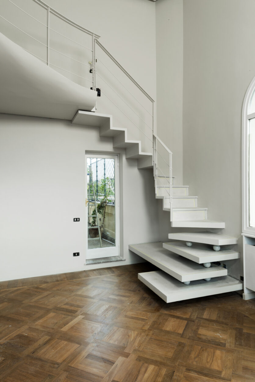 Il ballatoio è staccato dalla parete di fondo e, mediante l’uso di una doppia linea di led luminosi nascosta nella sezione, appare staccato anche dalla parete cui è di fatto ancorato. Le due librerie a tutta altezza misurano la totalità̀ dello spazio e ne scandiscono il lato più lungo. La scala propriamente detta è elemento indipendente; gli ultimi gradini sono piani più̀ ampi che si aprono a ventaglio sbarcando a terra ma senza mai toccarla. Ogni elemento è riconoscibile per sé stesso e staccato dai limitrofi. L’effetto è di galleggiamento. Gli spessori dei piani sono realizzati con vasche di alluminio riempite di micro cementi a grana fine, chiari in pasta e finiti a resina.