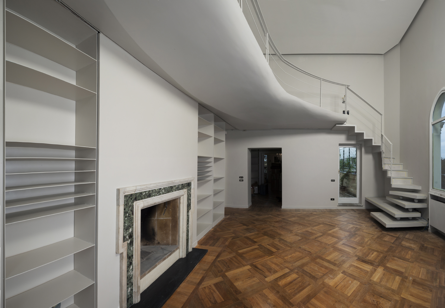 Il progetto di ristrutturazione dell’architetta Carmen Andriani riguarda la torretta del villino Calgiati, posta alla sommità̀ del villino, a snodo fra gli ambienti domestici alla base e due grandi terrazze a livelli diversi. Il progetto si coagula nel disegno della nuova scala , del ballatoio superiore e dell’accesso alle due terrazze , oltre a evidenziare la doppia altezza di circa sei metri attraverso due librerie verticali in ferro. Il ballatoio è in forma di scafo schiacciato, realizzato con tecnica nautica: sagome di ferro in successione hanno fasciato la struttura preesistente ed hanno sagomato il tessuto non tessuto applicato a più̀ strati ed alternato a resine, secondo la tecnica nautica di realizzazione degli scafi.