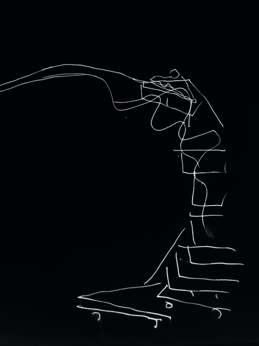 La ringhiera realizzata anch’essa su disegno, è sdoppiata nei suoi elementi verticali, ripartita da cavi orizzontali che si infittiscono via via, gemmando una foglia metallica (la stessa utilizzata per la grande porta di ferro di separazione dell’ambiente dal resto della casa). Il mancorrente, metallico e piatto, si conclude, senza toccare la parete di fondo, con un grande semicerchio in ferro, arricciato su sé stesso, una sorta di ‘capriccio’ di vaga memoria floreale e astratta. La scala non serve solo per salire da un piano all’altro ma accompagna il movimento ascensionale del corpo nello spazio, quasi fosse una danza leggera sospesa da terra.