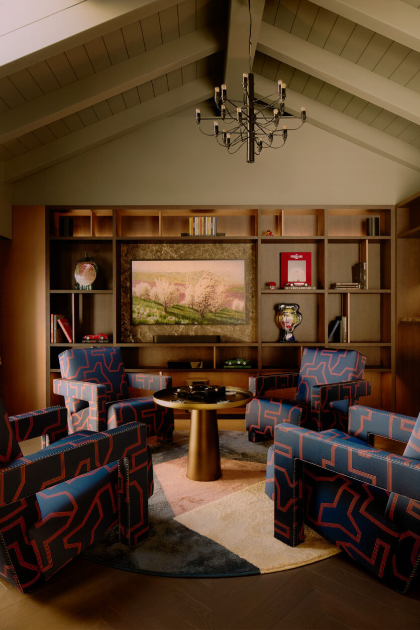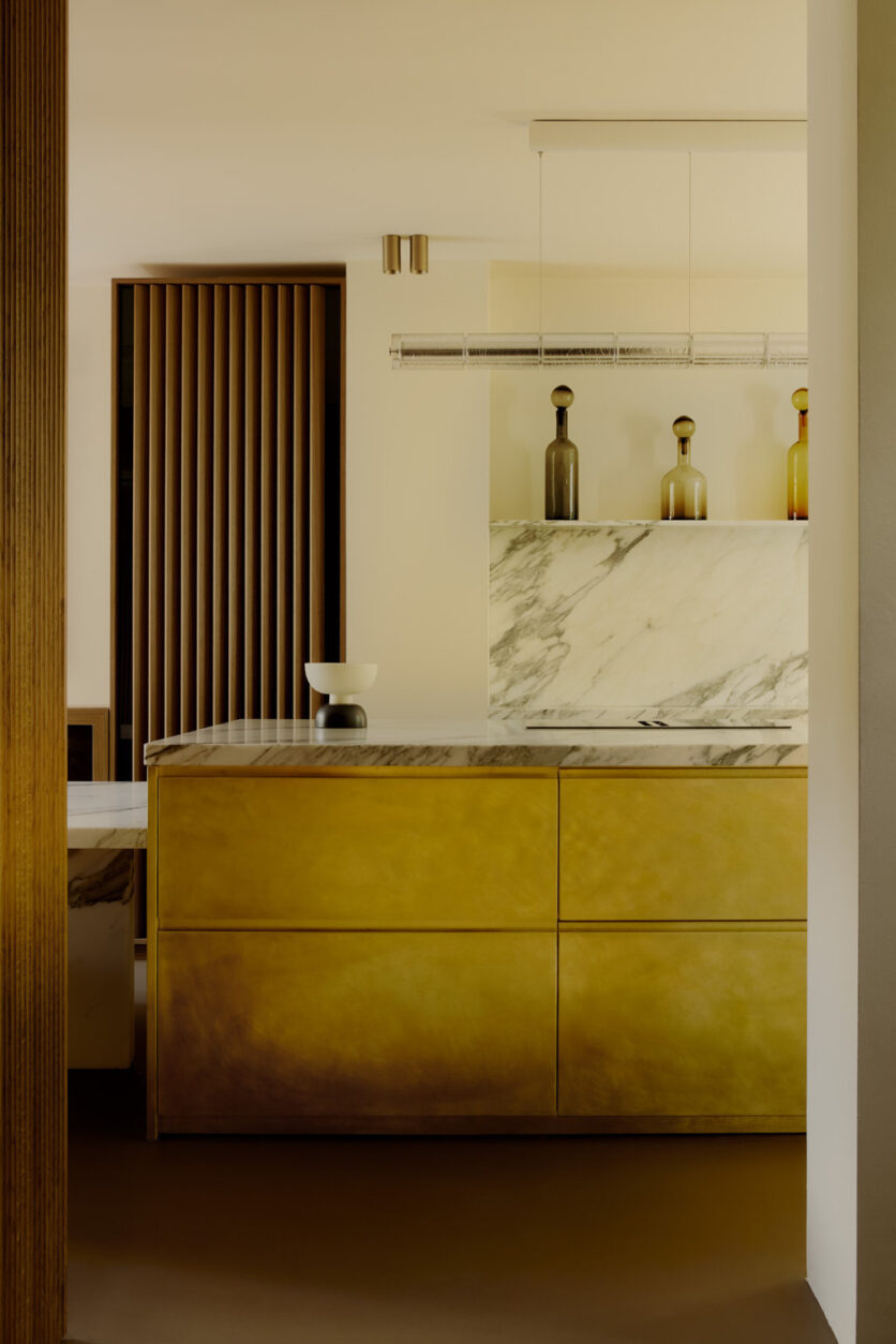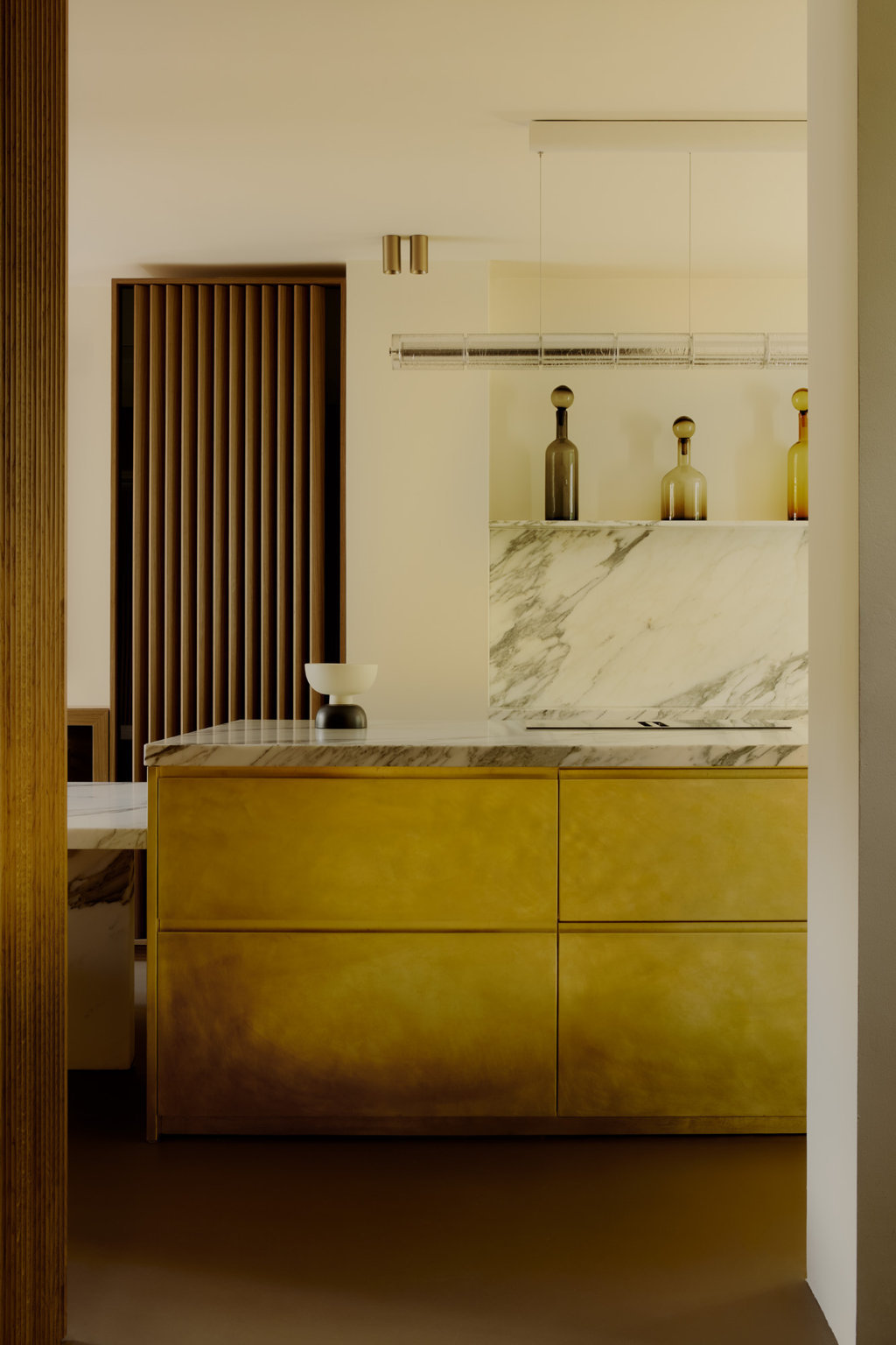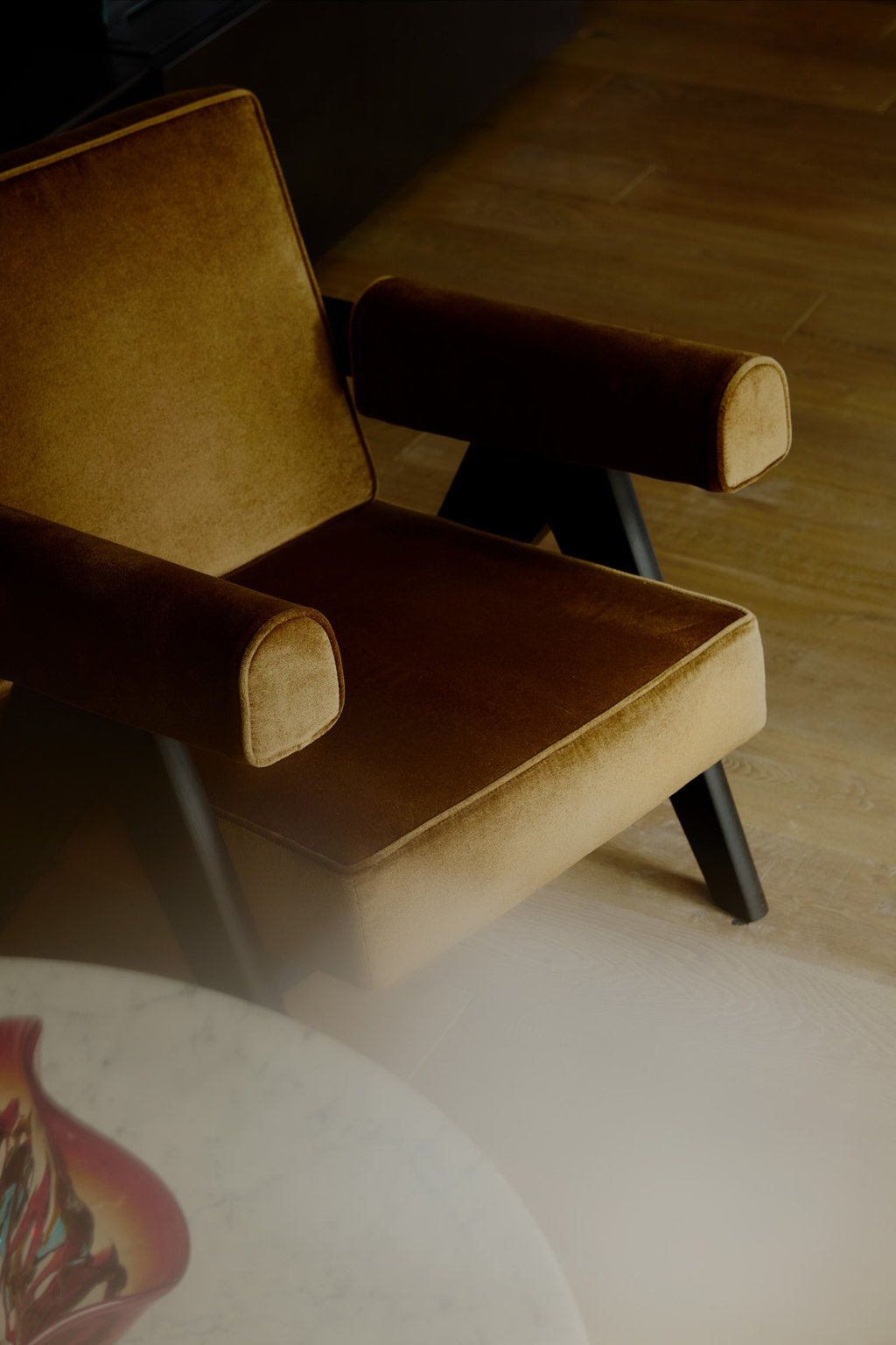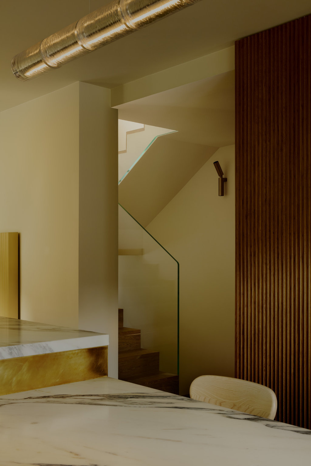 Inside, a bespoke approach prevails: honey oak boiserie, custom-made furnishings, and a tailored kitchen in natural brass with Luce di Carrara white arabesque marble countertops. The layout is spread over four levels: on the ground floor, a fully equipped gym with Technogym machines; on the first floor, the living area with kitchen, dining room, and a guest bedroom; on the third floor, the master suite with travertine bathroom and a second guest room; on the top floor, a cigar room overlooking the terrace, furnished with Cassina armchairs upholstered in Dedar fabrics, wooden blinds, and a bar with integrated hi-fi within the bookcase.