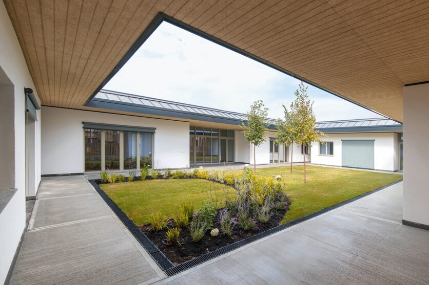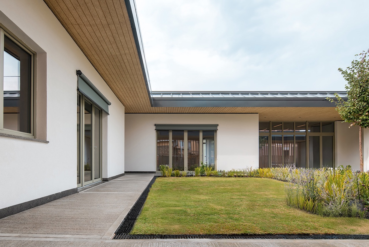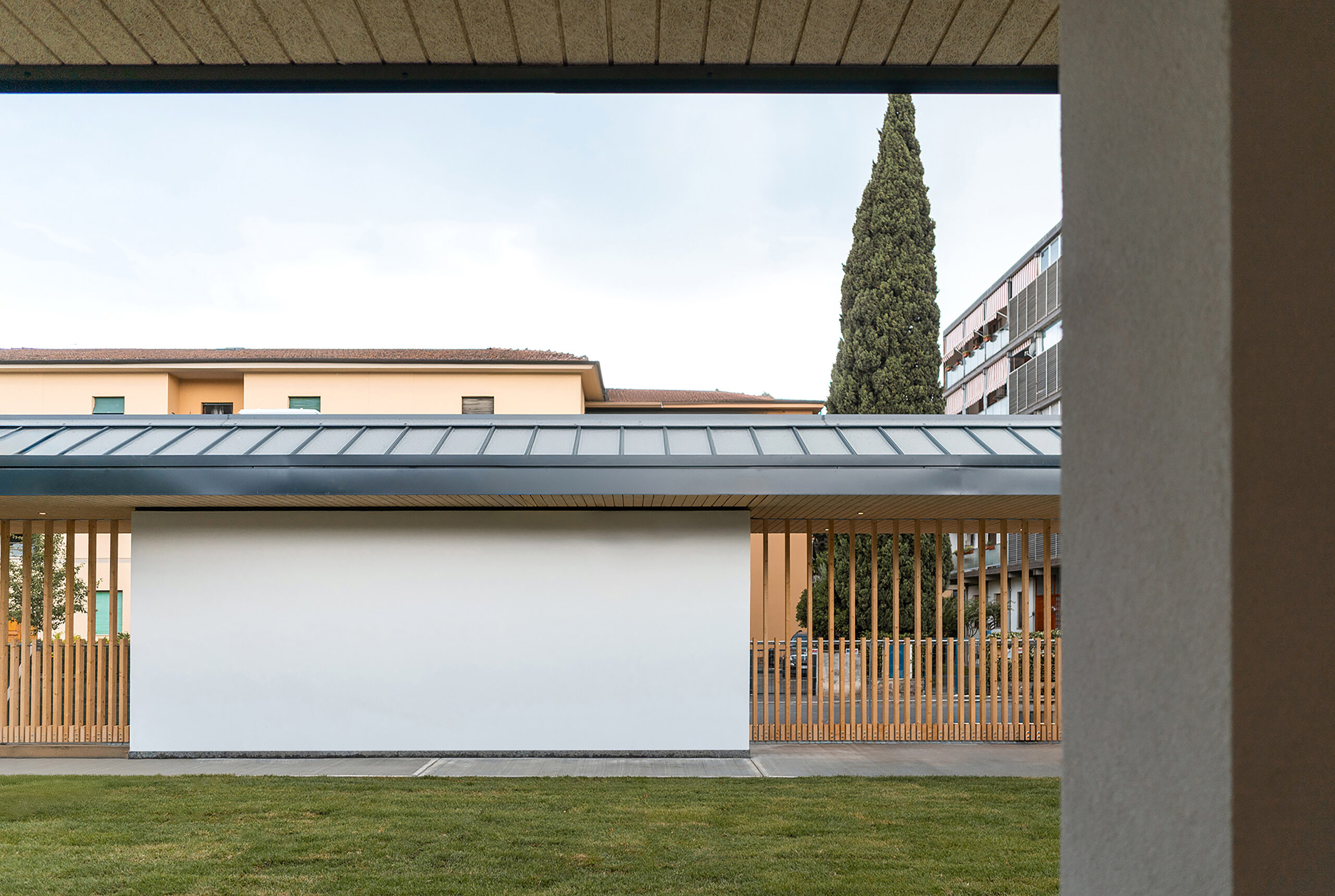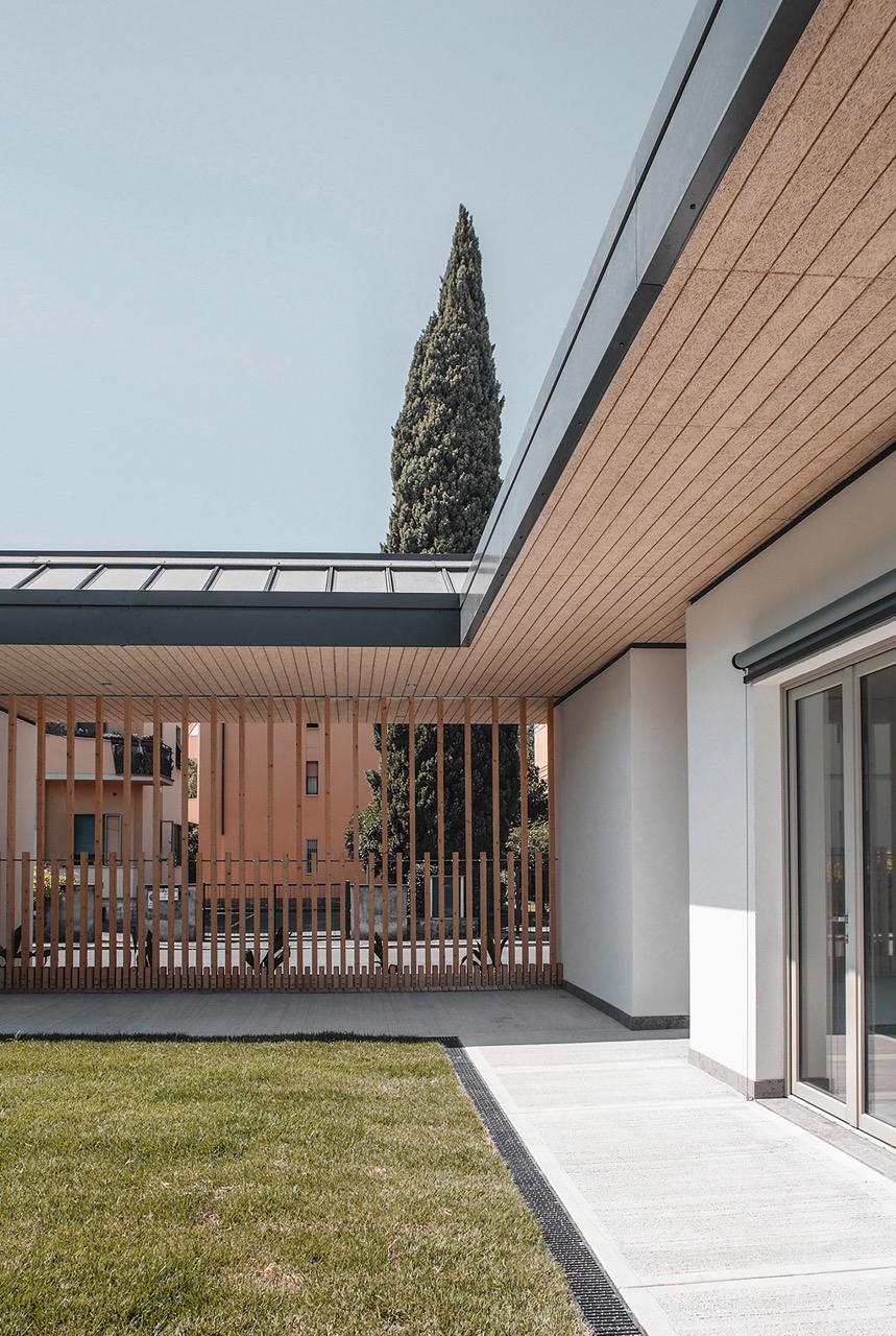 Built on the former site of the Via Tartini powder magazine, the new structure is conceived as a single-story urban device that houses two mirror-image nurseries organized around a pair of central courtyards. Its planimetric design, based on a glulam timber structure, ensures flexibility, environmental quality, and high energy performance. The two educational units share several technical and communal spaces—such as the kitchen and a multifunctional atrium—designed to become a true community center open to the neighborhood.