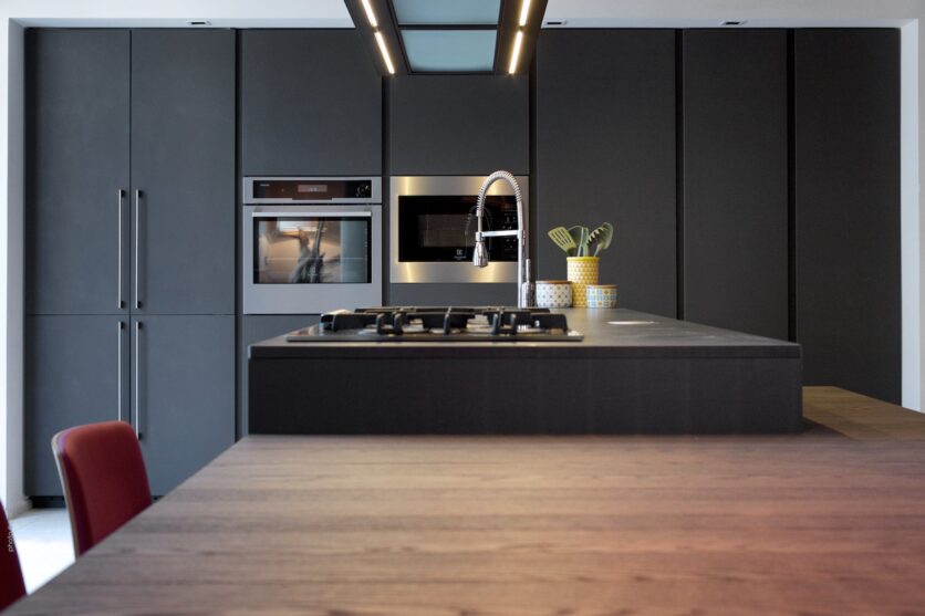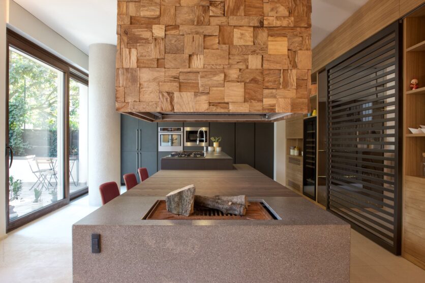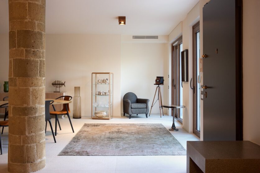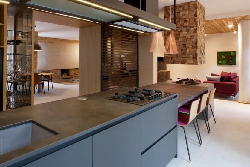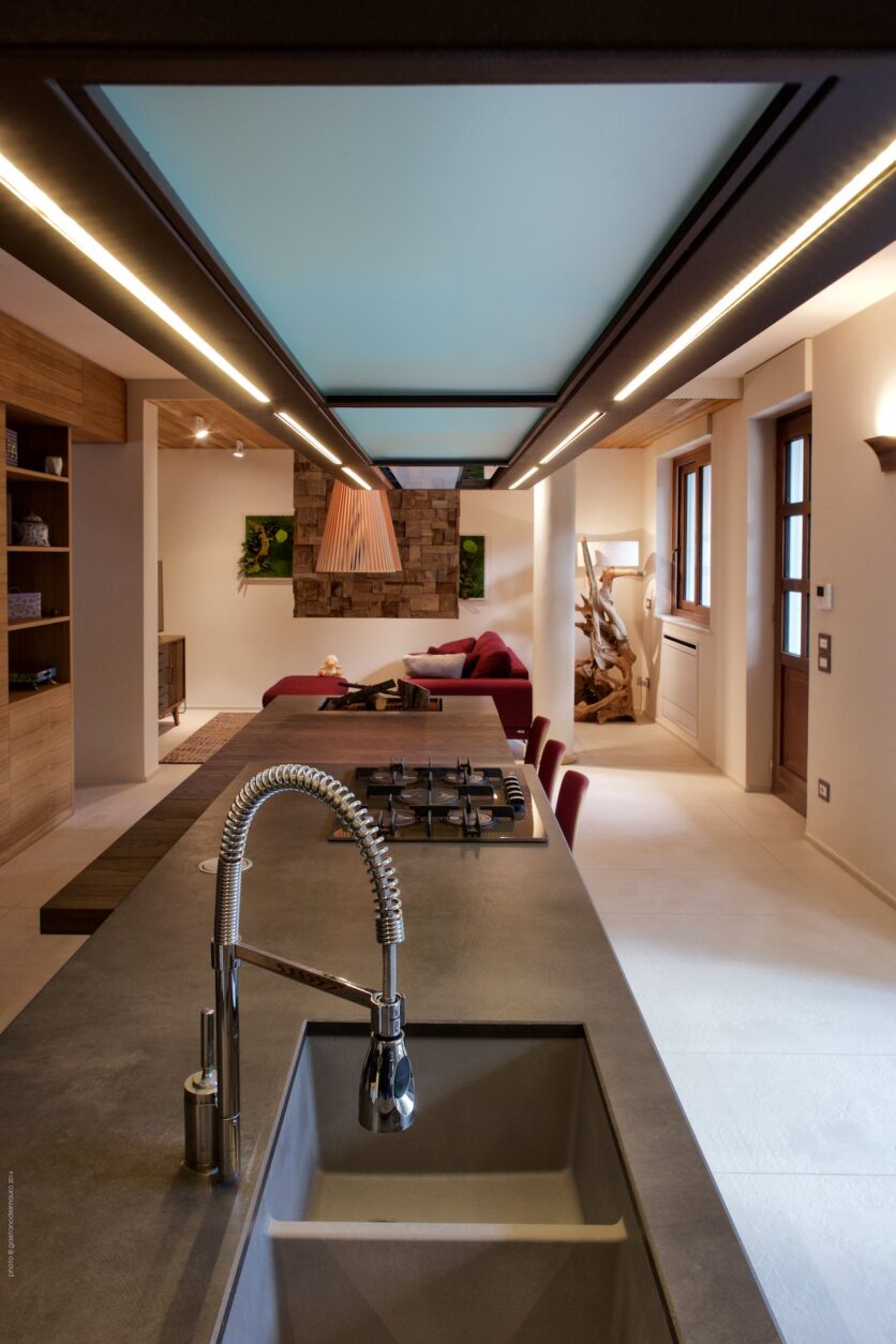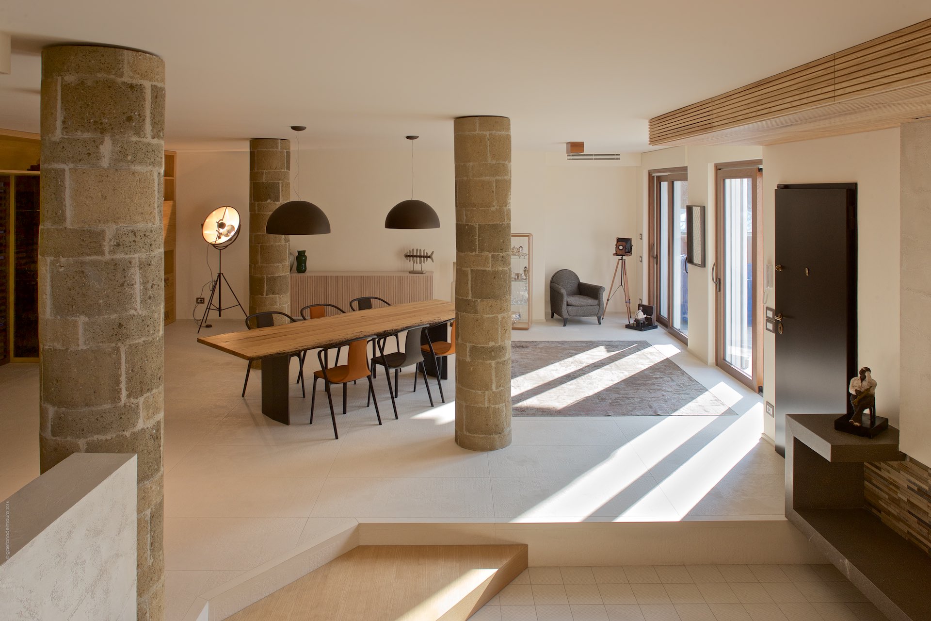The kitchen and living area merge into a single scenic island: a kerlite preparation counter dialogues with the ash oak dining table, resting on a Piasentina stone base that integrates a retractable glass fireplace. Resin storage units and a bespoke iron hood complete the composition, beneath a wooden false ceiling that defines the TV area. A horizontal wooden boiserie conceals the service areas and leads to a wellness space of rare intensity, where slate, stone and a Finnish sauna create a sensory retreat. The material palette—stone, iron, tuff and natural wood—softens the original coldness and envelops the house in muted tones of beige and grey.