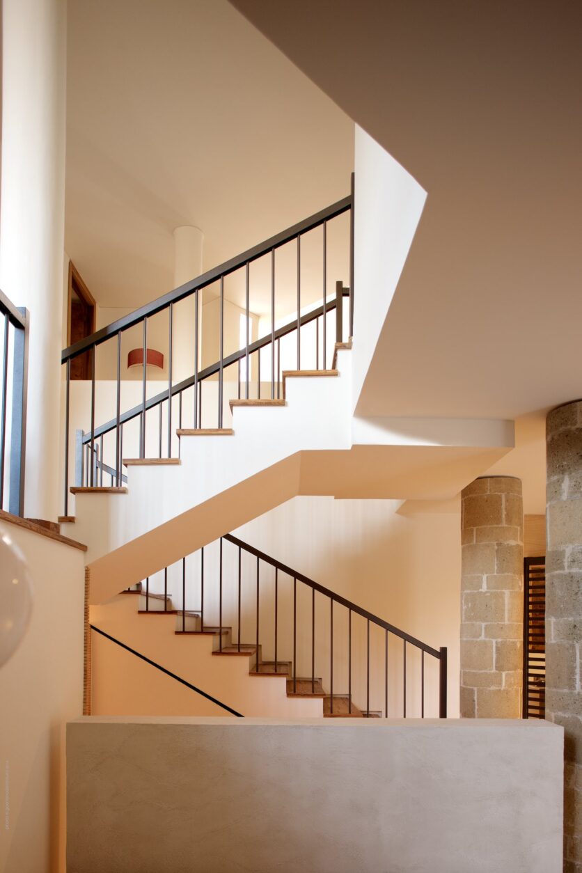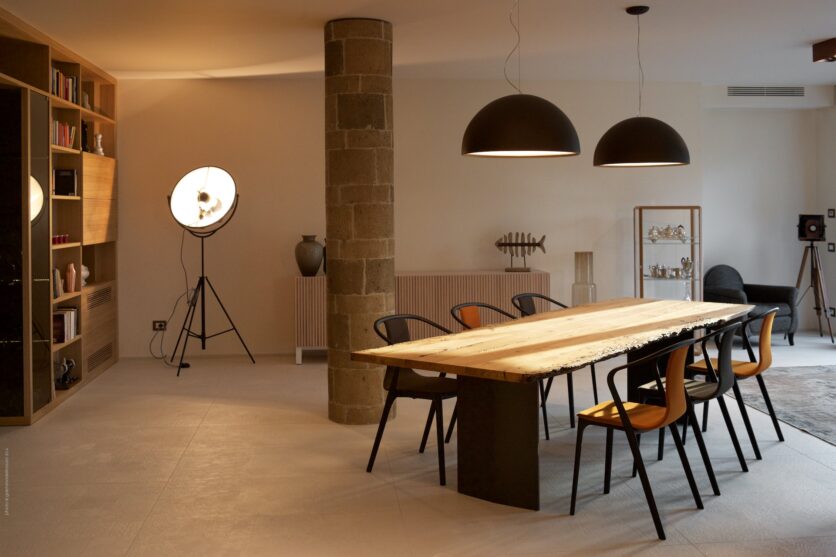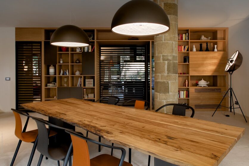 On the ground floor, large gres slabs weave visual and material continuity: the low reliefs of their surface vibrate under natural light and guide the gaze across a 200 sqm living area, punctuated by tuff-clad columns and anchored by a central table in iron and reclaimed briccola wood. Here, a slightly sunken conversation area, paved with azulejos, gathers around the intimacy of a fireplace framed in Piasentina stone, salvaged wooden slats and iron details. A concealed screen, descending from the wooden ceiling, transforms the space into a TV room, while a long double-sided oak partition with a smoked glass bar filters, connects and multiplies the possibilities of daily life.