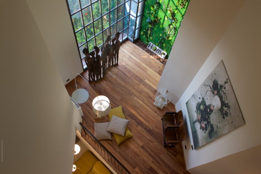 The intermediate level becomes a visual and functional hinge: reclaimed parquet flooring, a wall of stabilized greenery and a large iron window flooding the space with natural light define the core of the project. The iron staircase leads to the sleeping area, where the design works through subtraction, allowing the warmth of materials to emerge: teak parquet, briar doors, travertine finishes.