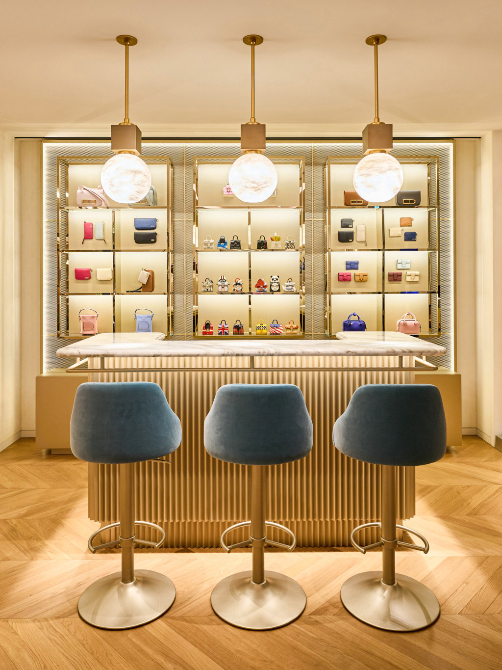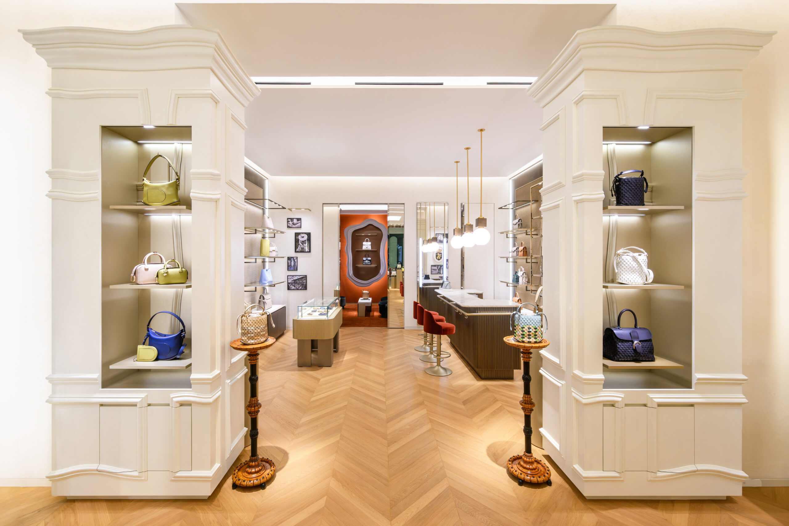 Le facciate, scandite da motivi geometrici come scacchiere e losanghe, si caratterizzano per dettagli in oro lucido e contrasti materici, mentre le vetrine ospitano allestimenti che dialogano con il design e l’arte. A Gwangju, ad esempio, l’esposizione richiama il Modular Revolving Bookcase di Claudio Salocchi degli anni ’60, segno della volontà di fondere retail e cultura visiva. Gli interni si articolano in foyer, atelier con area bar e VIC room, dove il prodotto è protagonista come un’opera d’arte. A Shanghai pannelli in marmo creano scenografie eleganti, mentre a Bangkok il ritmo visivo della vetrina in ottone spazzolato e pannelli retroilluminati introduce a spazi raffinati arricchiti da installazioni dell’artista Filippo Falaguasta. La VIC room di Gwangju, rivestita in tonalità rosso-terracotta, diventa un ambiente avvolgente e sensoriale; a Bangkok la sala è caratterizzata da una parete scultorea ondulata in carta da parati Delvaux Alter Ego.