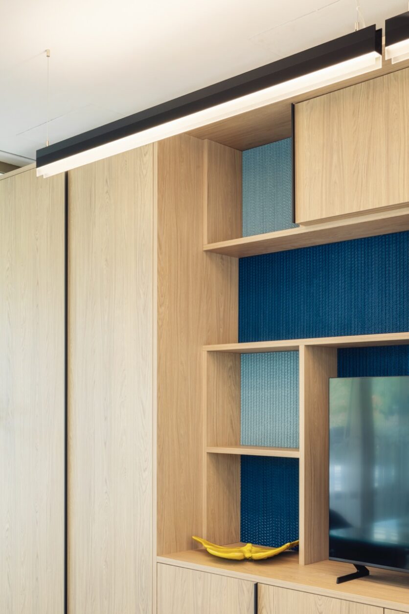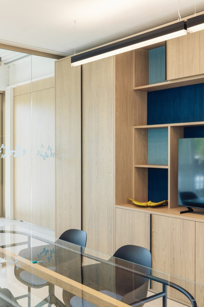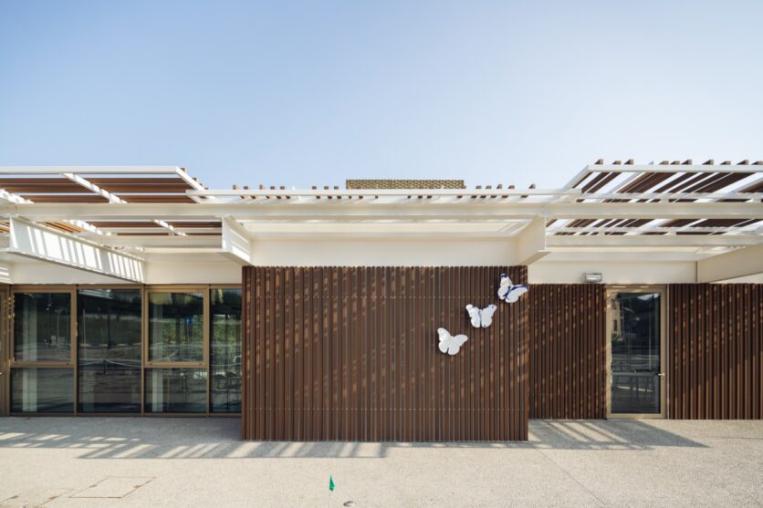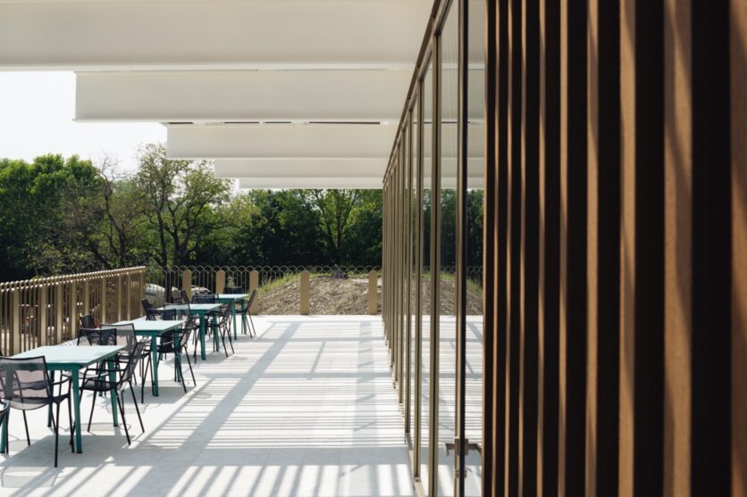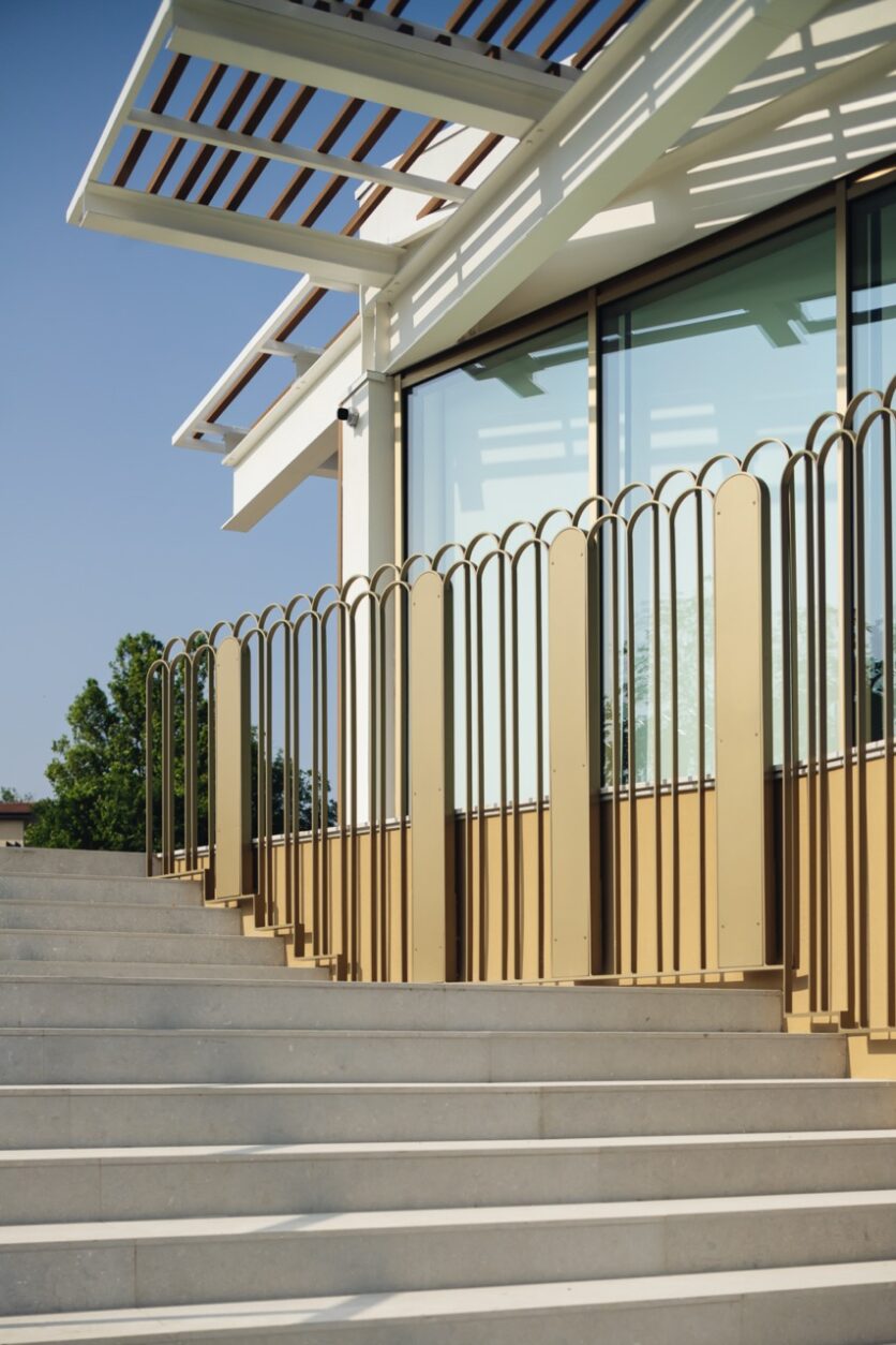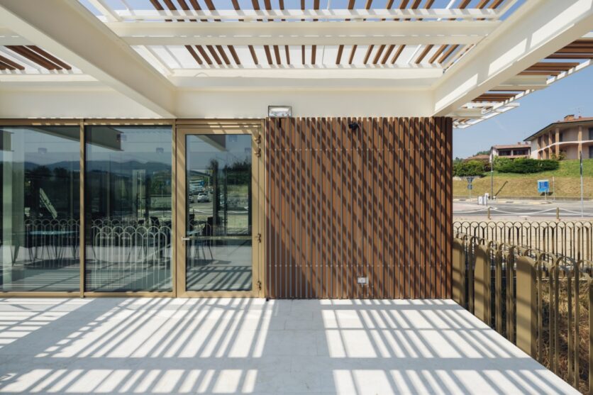 Il progetto si sviluppa su due livelli sfalsati, di cui uno parzialmente interrato, secondo un impianto semplice e compatto: un rettangolo di circa 25×13 metri. Al piano terra, la terrazza e il portico definiscono la relazione tra interno ed esterno, aprendo lo spazio verso il Parco dei Melograni. I materiali – vetro, legno pre-composto, acciaio verniciato color champagne – costruiscono una pelle vibrante, dinamica, che alterna trasparenze e schermature. La leggerezza è reale, è un’architettura che si costruisce sulla permeabilità e sulla relazione, non sullo sguardo autoreferenziale. È l’architettura che si fa racconto e ascolto.