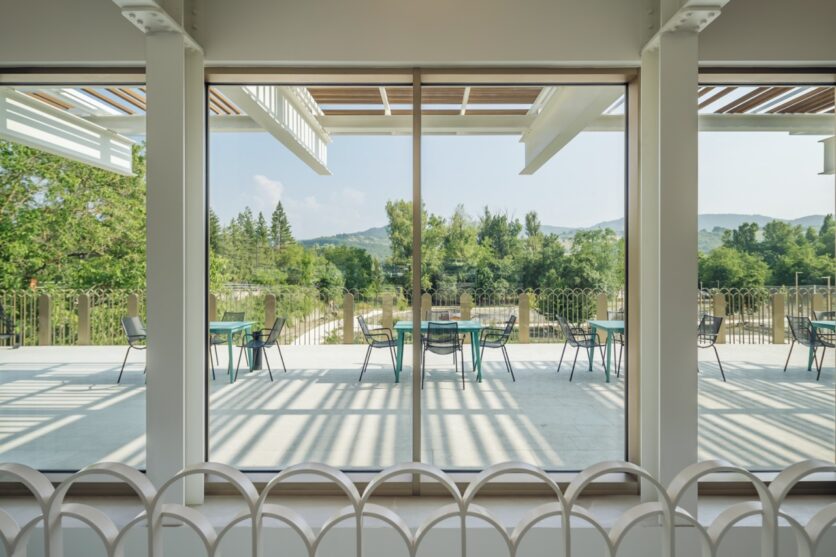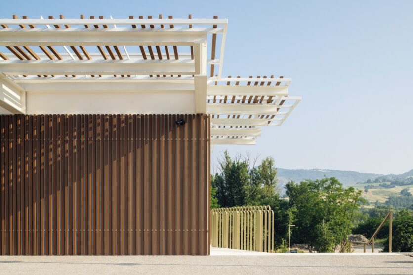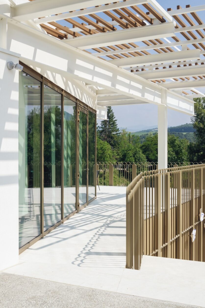 Al centro della composizione, il portico assume un significato meta-progettuale: non è solo protezione o passaggio, ma spazio intermedio che invita all’incontro. Una soglia generosa che incoraggia la socialità, la partecipazione civica, l’emersione del pensiero. È l’inizio di un dialogo, è lo spazio in cui si può sostare senza necessariamente entrare. «In un luogo come questo, che ha una vocazione sociale e culturale, era essenziale costruire un gesto che fosse insieme accoglienza e promessa.» sottolinea l’architetto.