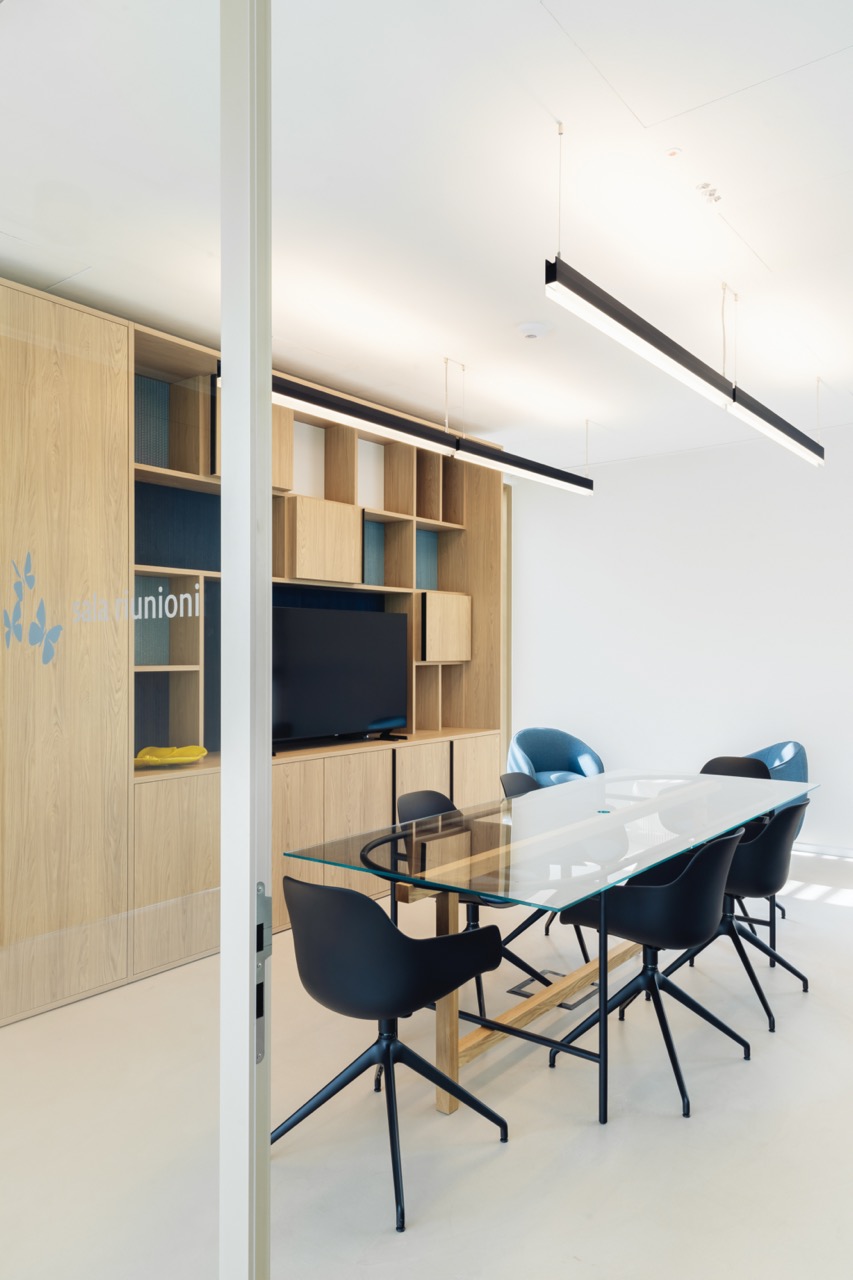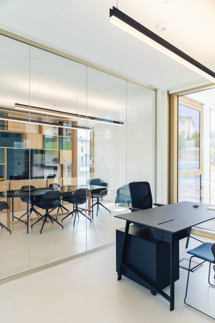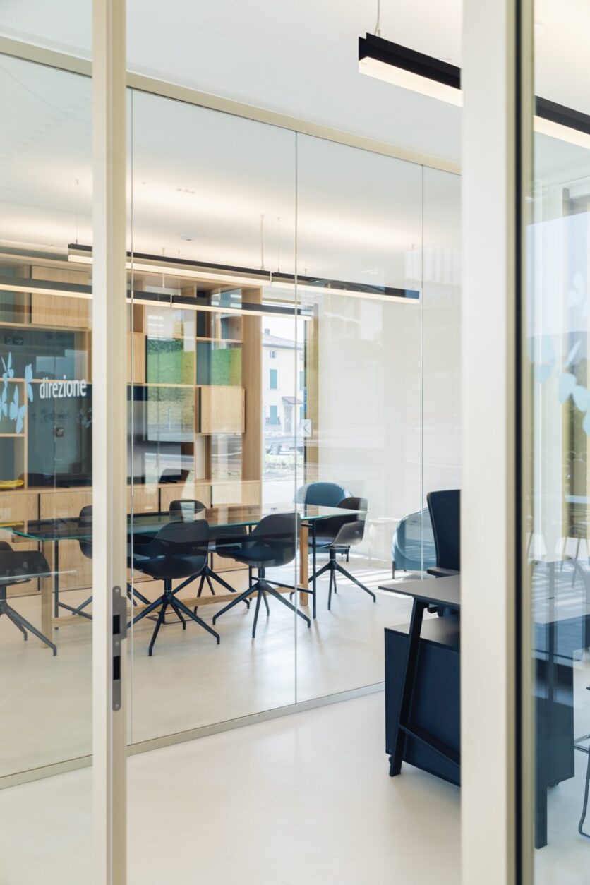 Gli interni, trasparenti e continui, ospitano un auditorium, uffici, sale riunioni e uno spazio polifunzionale. Nulla ostacola la vista tra l’ingresso e il parco: l’architettura diventa così diaframma tra comunità e paesaggio, tra appartenenza e possibilità.