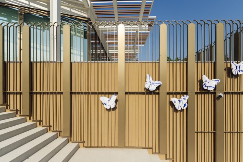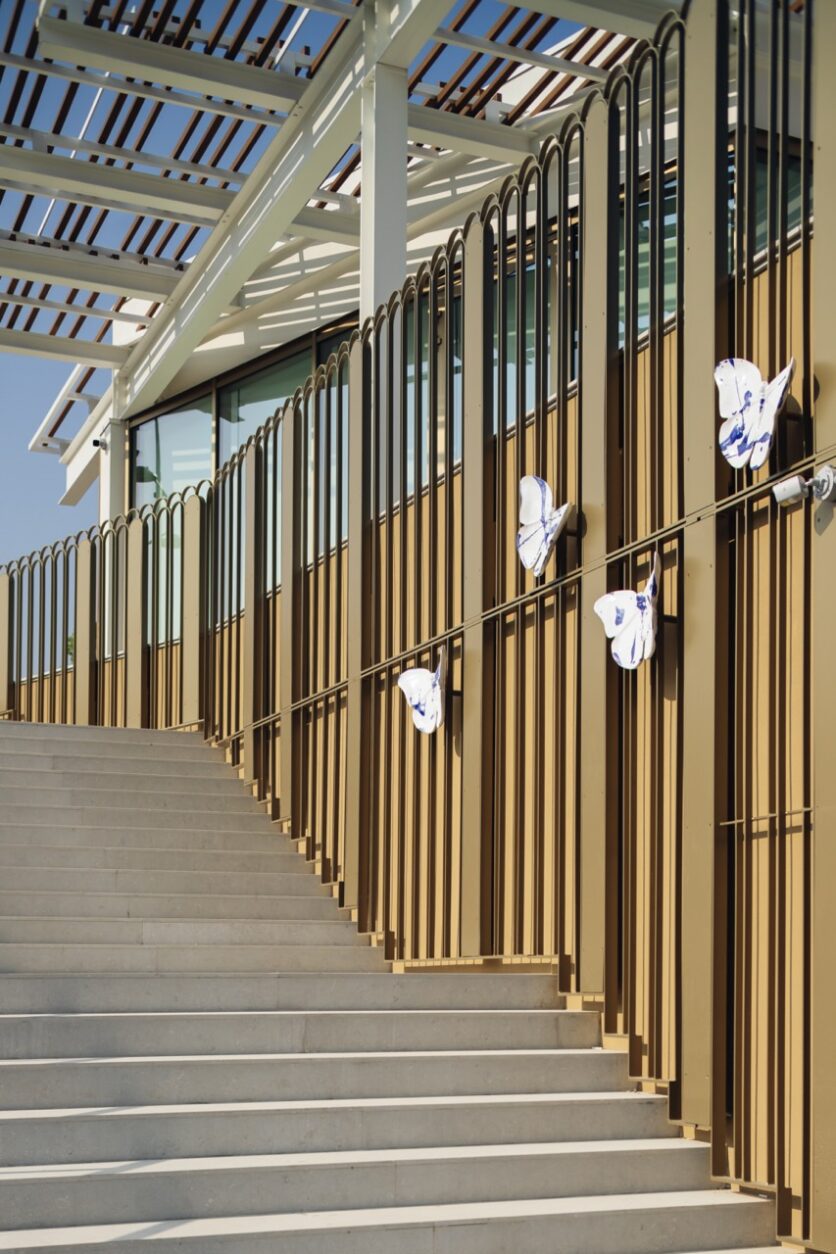 Tre farfalle in ceramica bianca e blu, posate sulle facciate dell’edificio, richiamano l’immagine di un volo appena interrotto. Sono il simbolo della Fondazione e della sua identità visiva ma anche una dichiarazione poetica: l’architettura, come il gesto filantropico, si misura con il tempo, la fragilità, la bellezza. “Non volevamo fare un’architettura che impattasse il territorio, ma un’architettura che fosse già parte del territorio.” afferma l’architetto Alfonso Femia. Le farfalle in ceramica sono realizzate da Danilo Trogu e si inseriscono nel percorso del Bestiario Mediterraneo, che accompagna da anni la ricerca poetico-materica di Femia. In questo caso, più che ornamento, sono un segno tangibile di cura e appartenenza.