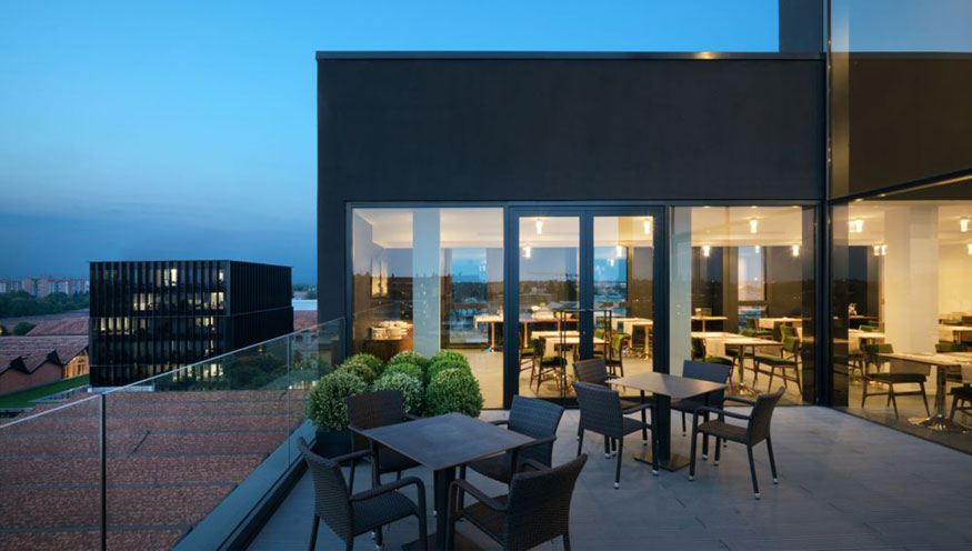 On the façade itself, the alternation of windows indicates an analytic rigour that is echoed in the development of the internal spaces, conceived as a linear and essential design. The spaces are home to every guest’s dreams: rooms with a purity of geometries and materials envelop the visitor in an aura of sophistication. On the roof there is a large panoramic terrace which thanks to the inclusion of a restaurant is open to non-residents. Here, full height windows clearly show the city’s magical lights and become the perfect backdrop for an attractive, ever-changing landscape.