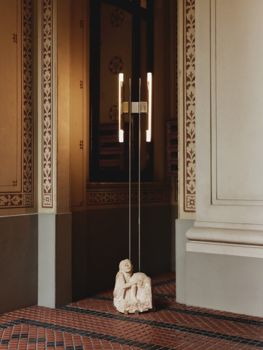 Nella mitologia italica, GIANO è raffigurato con due volti, presiede ai passaggi, sia fisici che simbolici, e alla tensione mutevole tra conflitto e pace. Questo pezzo traduce tale figura in un’installazione luminosa. Due lampade STELE interconnesse emettono luce in direzioni opposte, evocando il duplice sguardo di Giano rivolto al passato e al futuro.