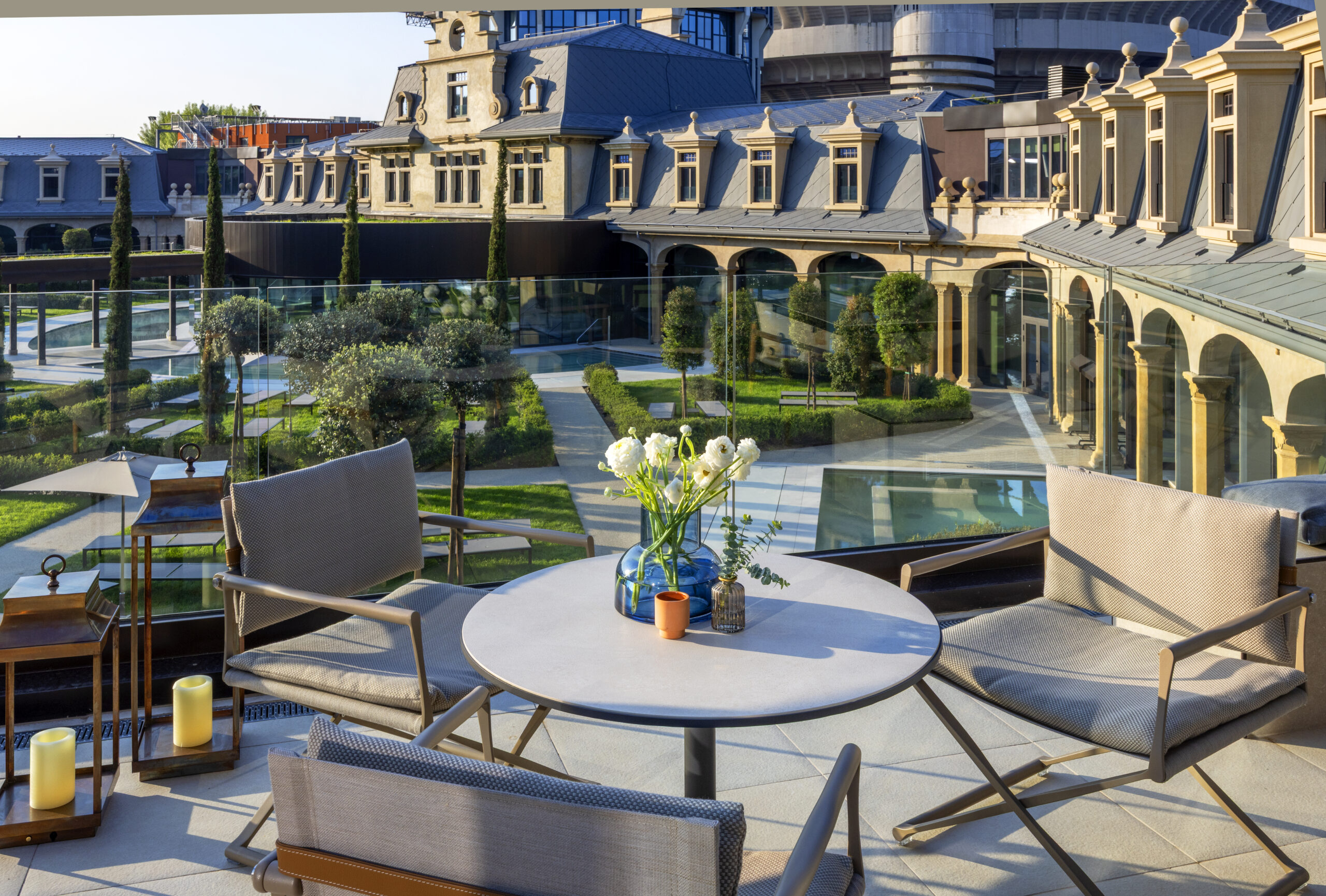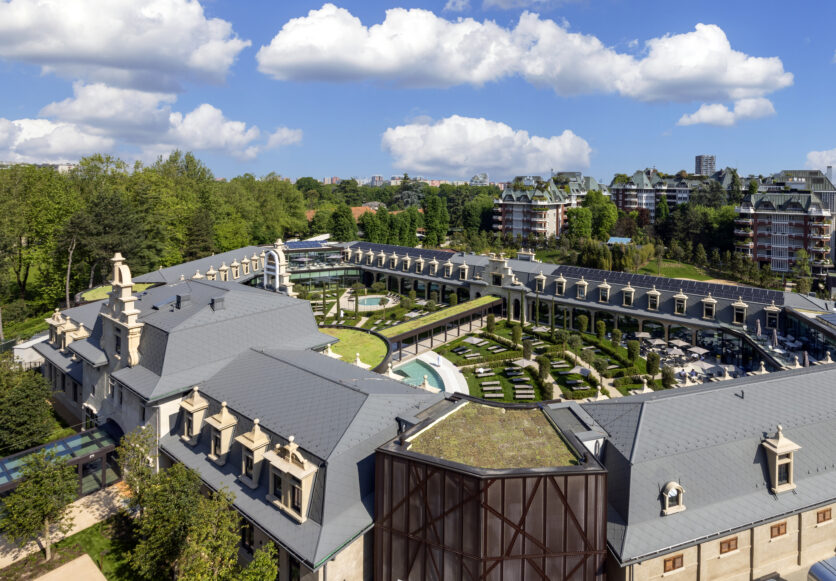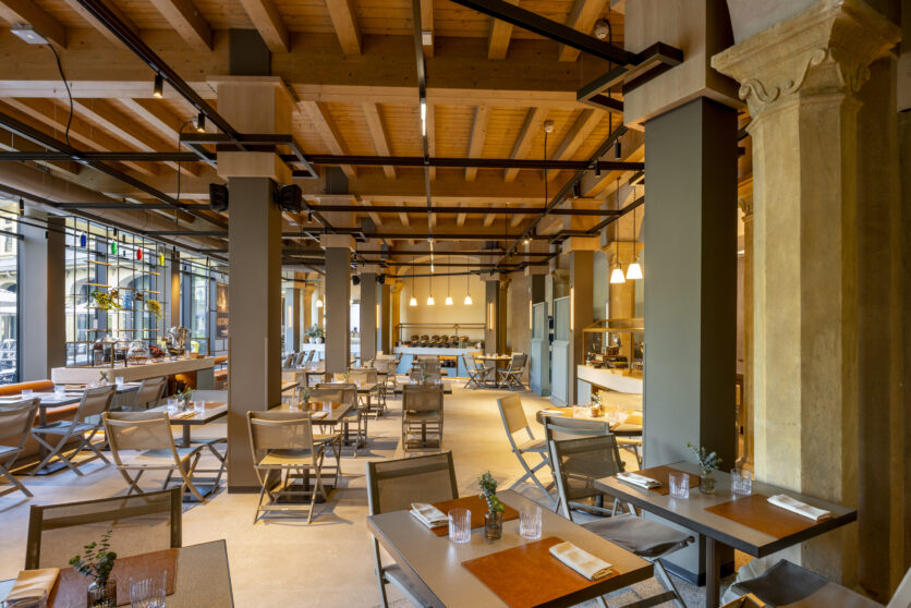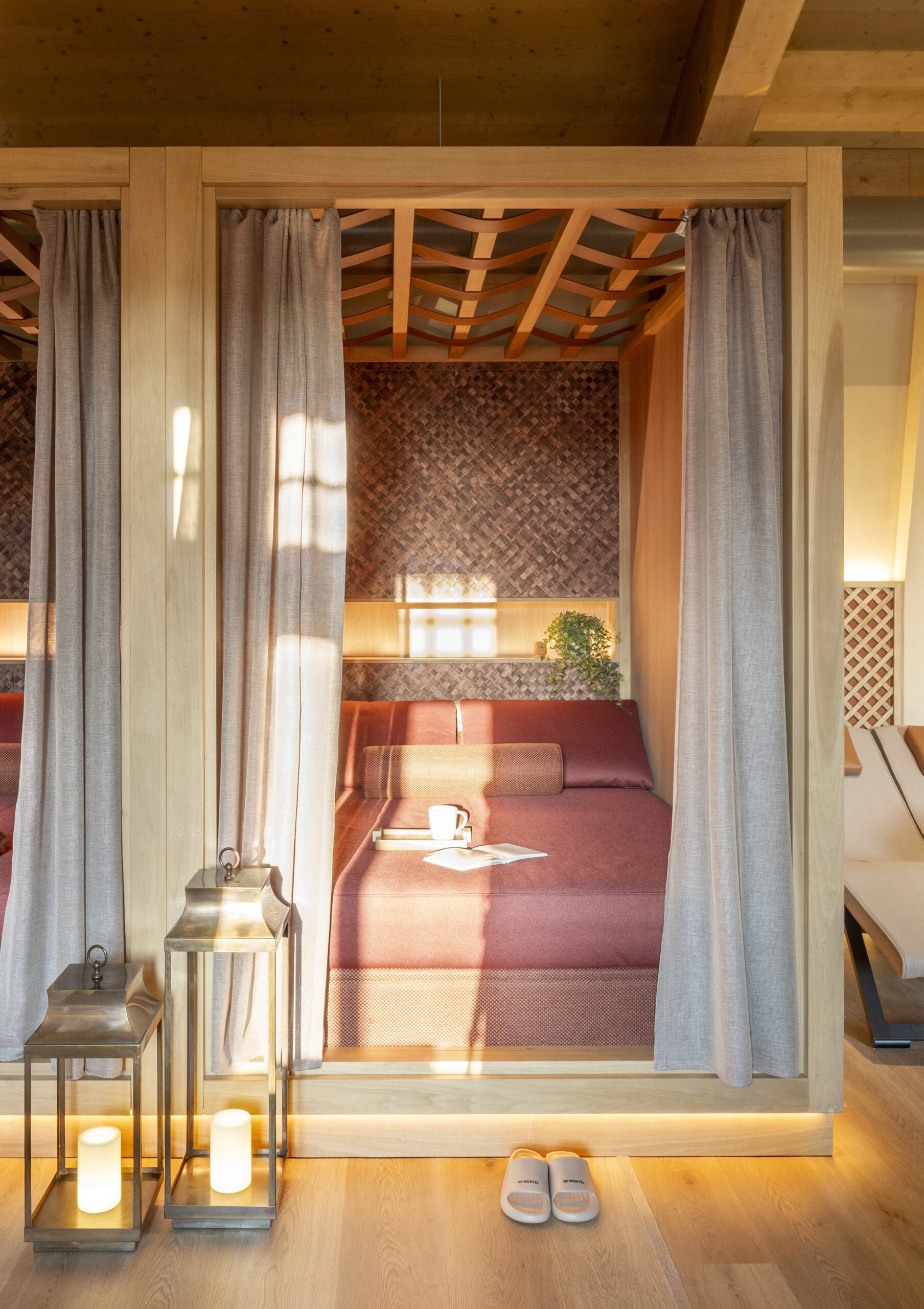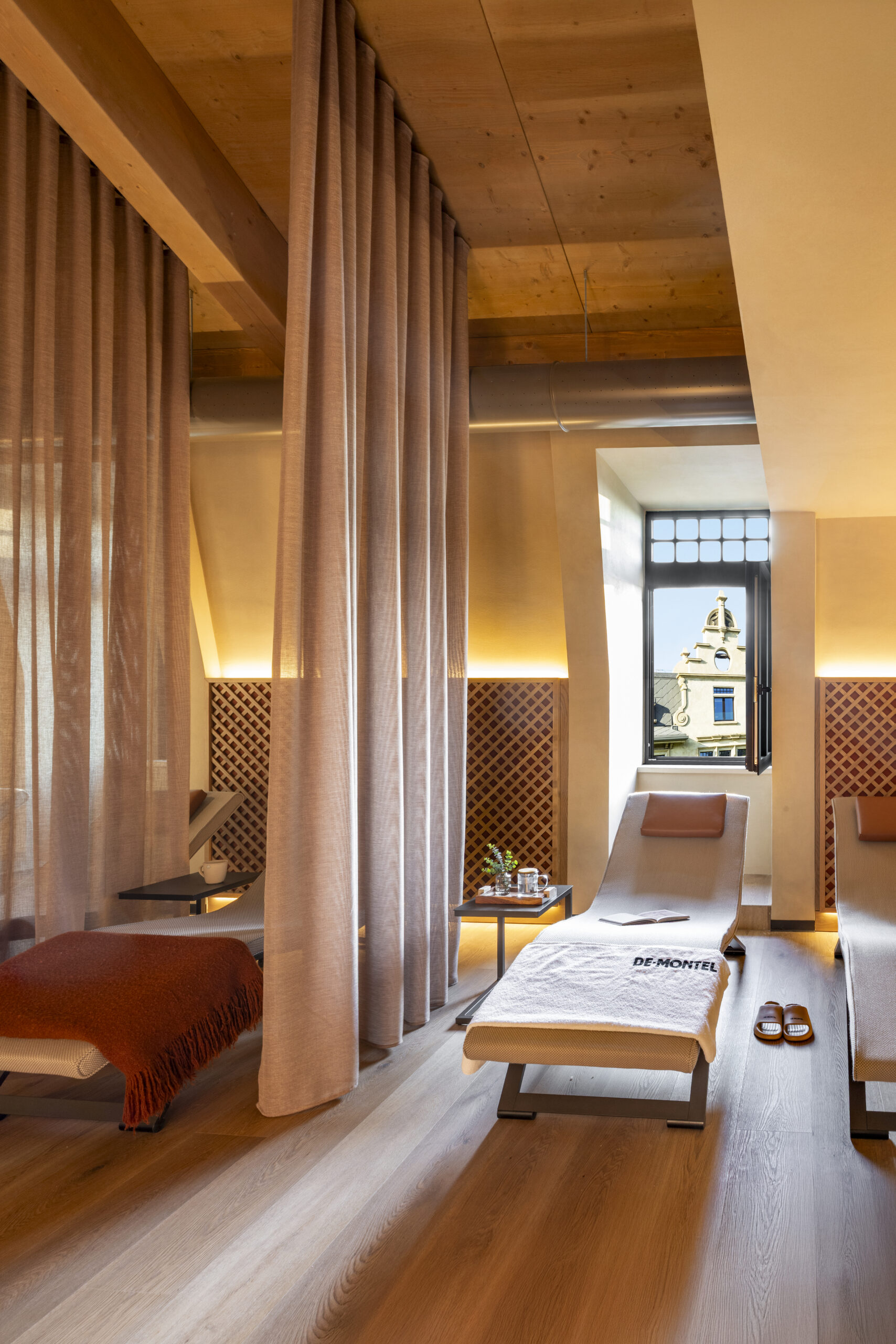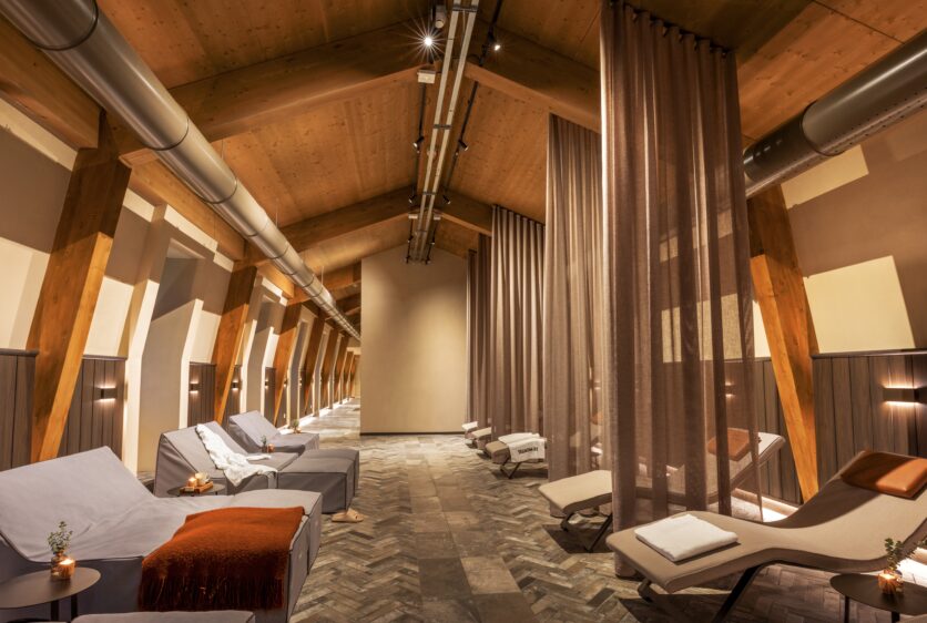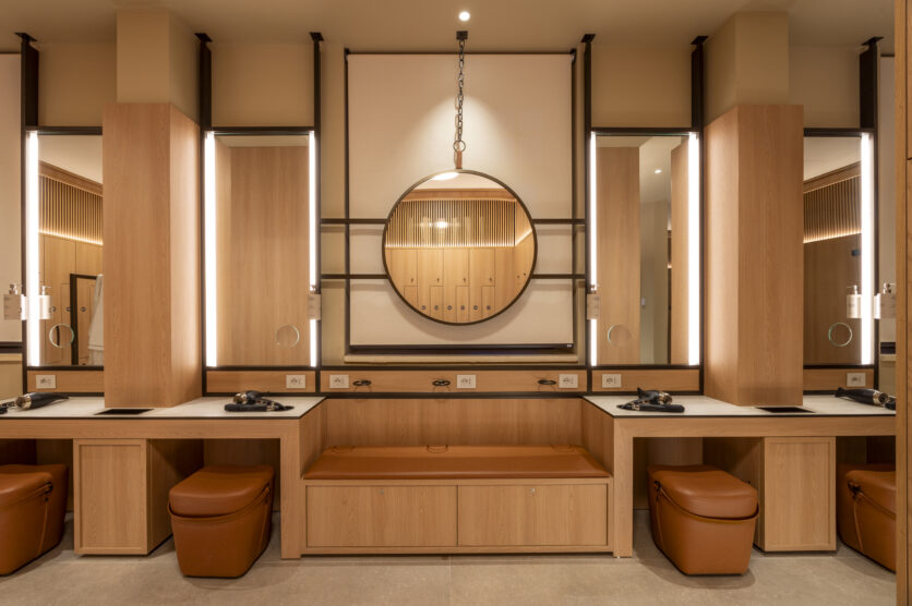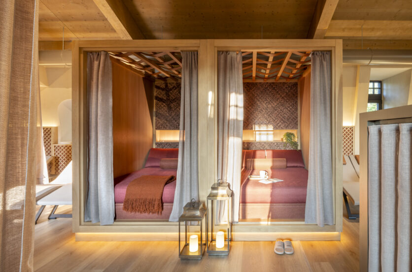 L’organizzazione distributiva segue una chiara gerarchia esperienziale. Il piano terra è interamente dedicato al percorso benessere: vasche termali, saune, hammam e aree relax si aprono verso la corte-giardino e il parco, stabilendo un dialogo continuo tra interno ed esterno. Gli spogliatoi, concepiti come vera soglia del rito termale, reinterpretano i box delle scuderie come spazi di preparazione, dotati di postazioni beauty e armadietti personalizzati. Al primo piano, le sale relax con capriate lignee a vista si affacciano sul verde, mentre il bagno di vapore e le cabine trattamenti introducono un’atmosfera più intima e raccolta. Le cabine singole utilizzano tonalità chiare, laminati effetto rovere e piani in travertino; quelle di coppia adottano cromie più scure e pattern dorati ispirati alle vetrate storiche degli abbaini, definendo un gradiente percettivo tra pubblico e privato. Le aree F&B, pensate come terrazze interne con tralicci vegetali e sedute leggere, completano l’esperienza proponendo spazi conviviali che evocano l’immagine di un giardino urbano fruibile in tutte le stagioni.