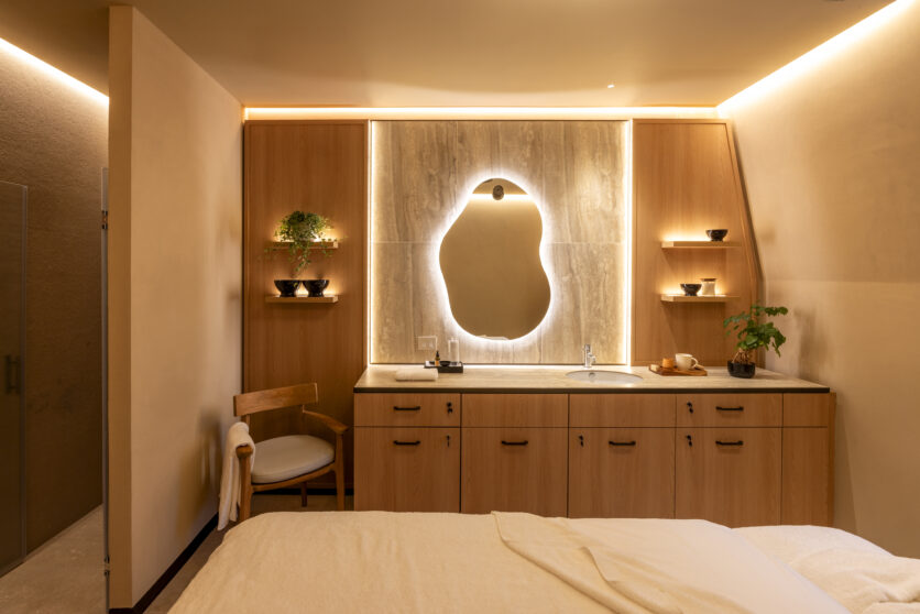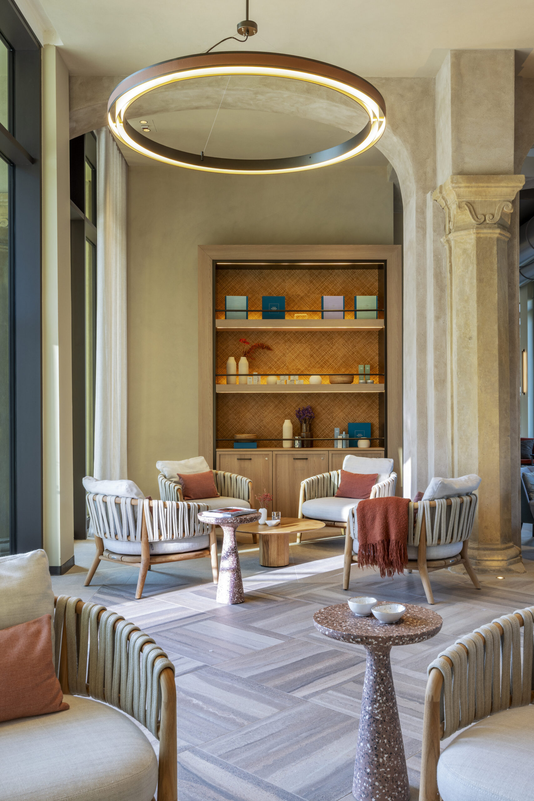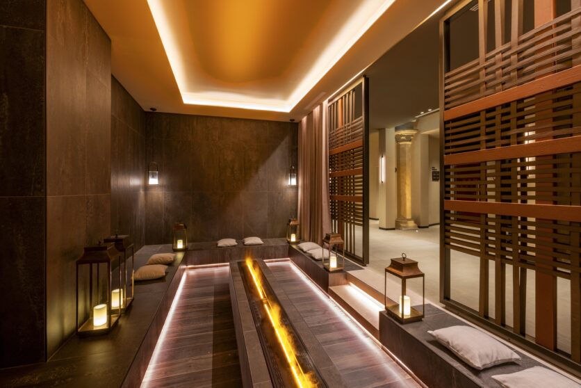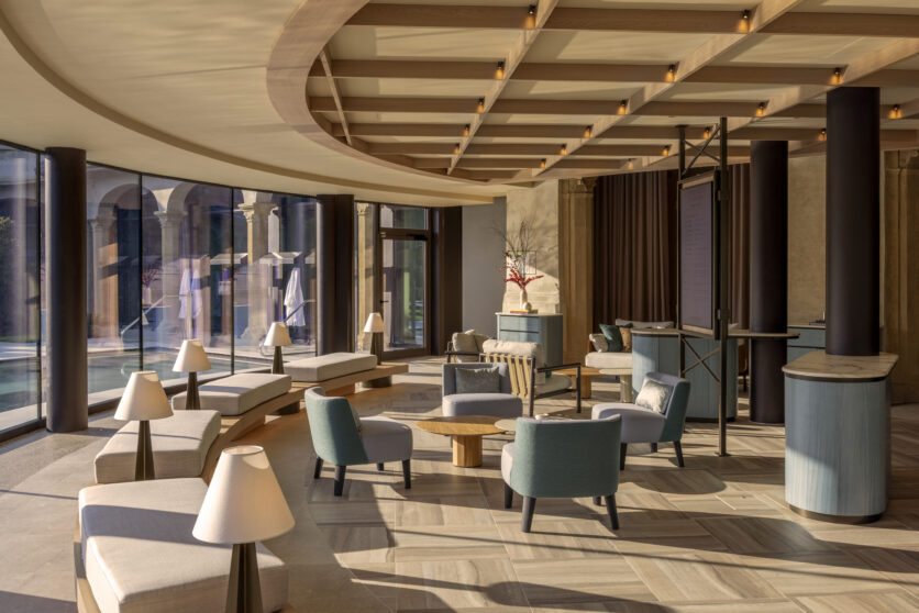 Il concept elaborato da THDP si struttura su tre direttrici progettuali: la matrice Liberty dell’edificio, la memoria delle scuderie e il percorso dell’acqua termale come motore sensoriale del progetto. Questi tre livelli si intrecciano in una strategia di interior design che traduce il racconto storico in elementi tangibili: materiali, luci, arredi e dettagli su misura diventano dispositivi narrativi capaci di guidare l’utente lungo l’intero percorso. L’ispirazione Liberty si esprime attraverso ferri battuti, vetri lavorati e linee sinuose, reinterpretati in chiave contemporanea. Le citazioni non si limitano al decoro, ma diventano grammatica compositiva: l’illuminazione bespoke, progettata appositamente per il complesso, traduce la leggerezza e la raffinatezza dello stile originario in sistemi luminosi che amplificano la qualità percettiva degli ambienti. Parallelamente, il passato equestre dell’edificio viene evocato con un approccio misurato e astratto. Sedute su misura con texture che ricordano il cuoio delle briglie, ganci per accappatoi modellati sulle forme di staffe e morsi, catene e cinghie integrate nei corpi illuminanti: ogni dettaglio restituisce l’anima delle antiche scuderie, senza ricorrere a citazioni letterali ma attraverso un linguaggio materico e funzionale. L’acqua, estratta da un pozzo artesiano a 396 metri di profondità, diventa il vero elemento generatore del progetto. L’esperienza termale è costruita come un percorso che accompagna l’utente dalla superficie fino alla dimensione più intima e immersiva del benessere.
