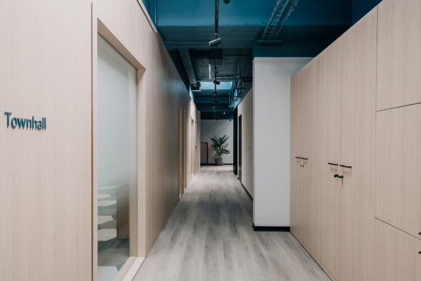 La materia diventa così uno strumento fondamentale nella definizione degli interni. Boiserie, pavimentazioni in vinile color rovere, soffitti a vista trattati con tonalità cromatiche e rivestimenti tessili coordinati contribuiscono a costruire un linguaggio spaziale stratificato che bilancia calore e contemporaneità. Il risultato è un ambiente di lavoro accogliente e dinamico, pensato per accompagnare le attività quotidiane con un’atmosfera vivace ma equilibrata.