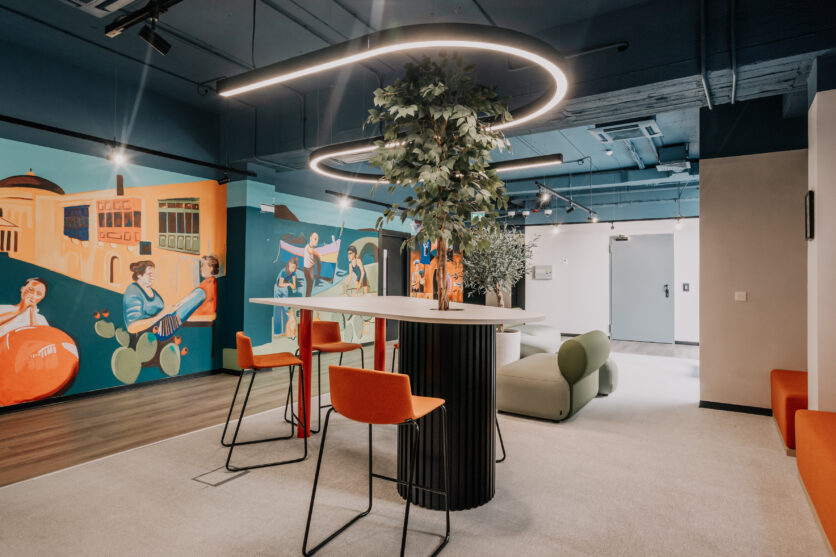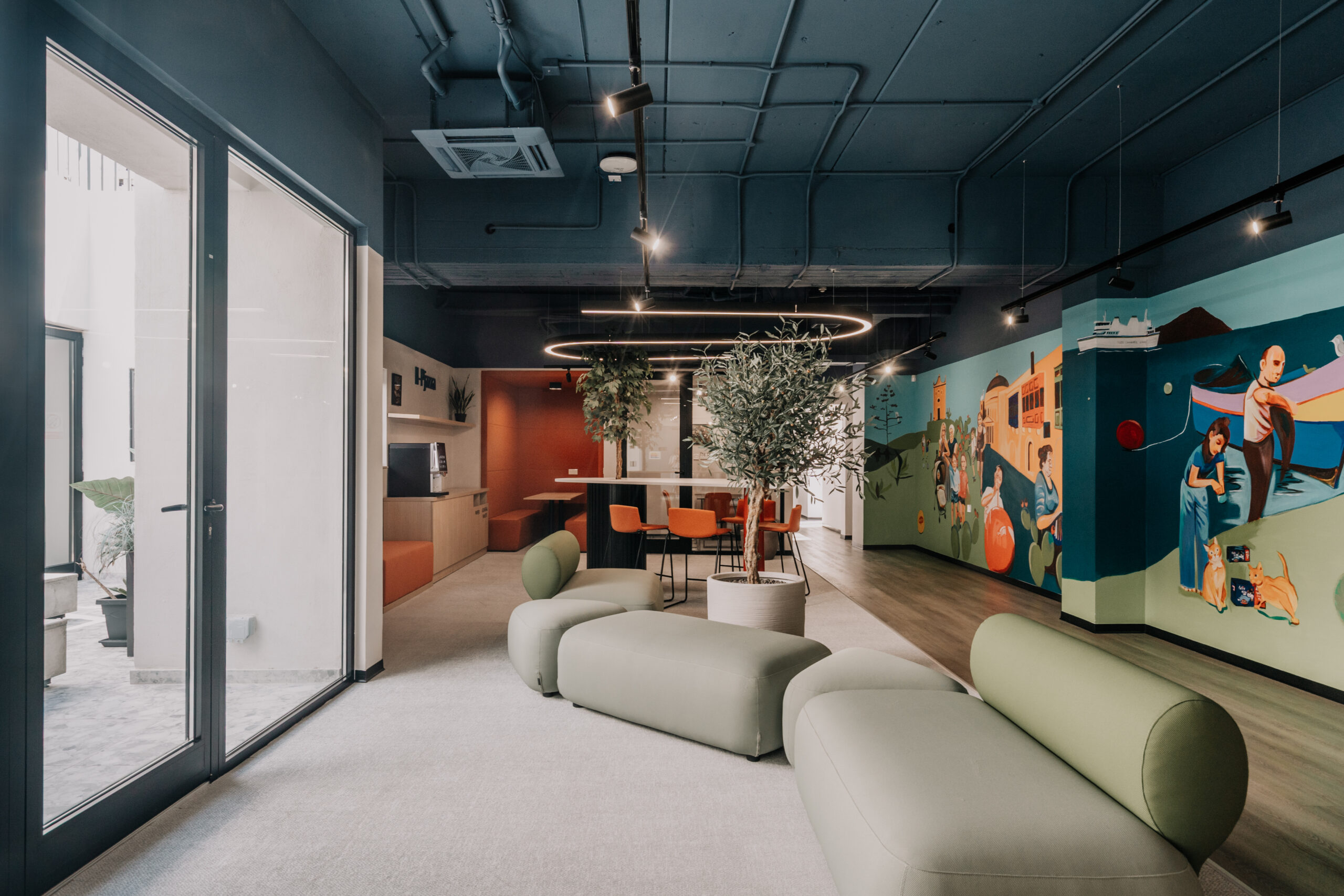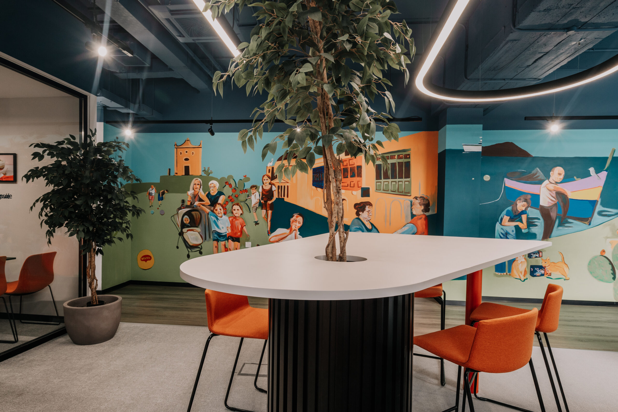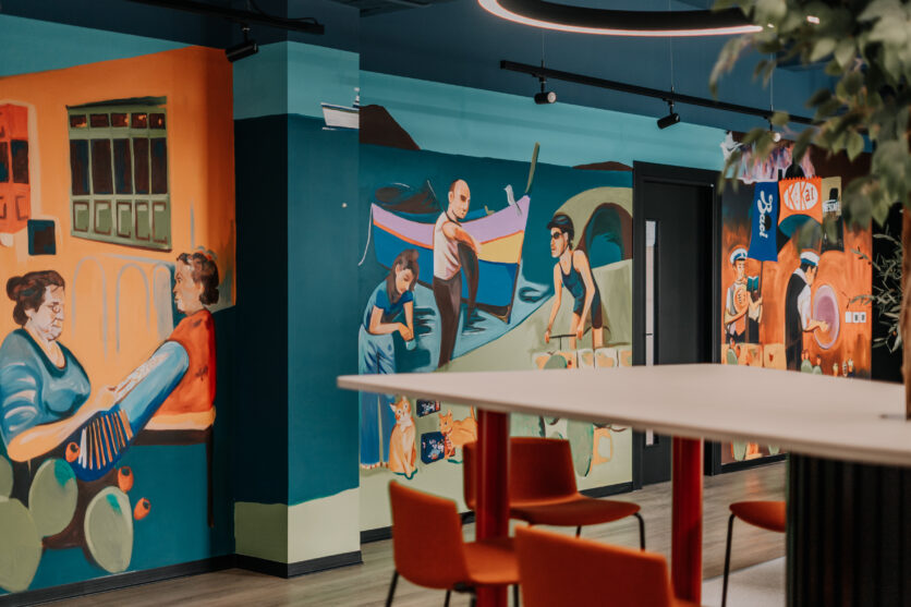 Un murale dipinto a mano stabilisce un legame visivo tra Nestlé e l’isola, mentre il bancone della reception e una parete scenografica reinterpretano l’estetica delle tradizionali piastrelle maltesi e le texture della pietra calcarea locale. Questi elementi contribuiscono a radicare lo spazio nel suo contesto geografico, costruendo una narrazione che intreccia cultura aziendale e memoria del luogo.