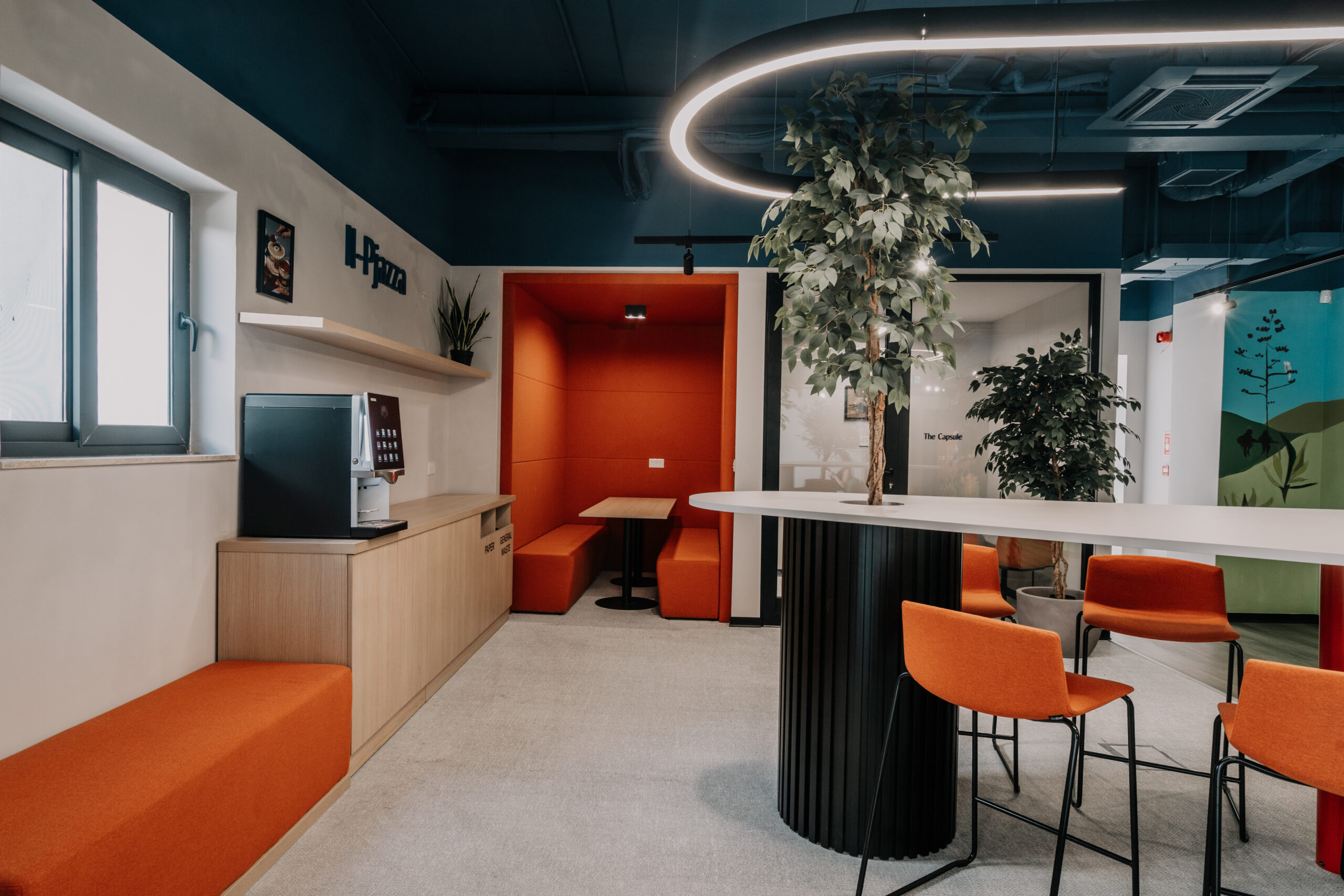 Il layout introduce una gamma articolata di ambienti destinati a diversi modi di lavorare. Cabine chiuse, aree open space, sale riunioni e uffici privati offrono ai dipendenti la possibilità di scegliere il contesto più adatto alle proprie esigenze operative. Ogni zona è caratterizzata da un’atmosfera distinta, favorendo concentrazione, collaborazione e creatività attraverso una diversità spaziale calibrata.