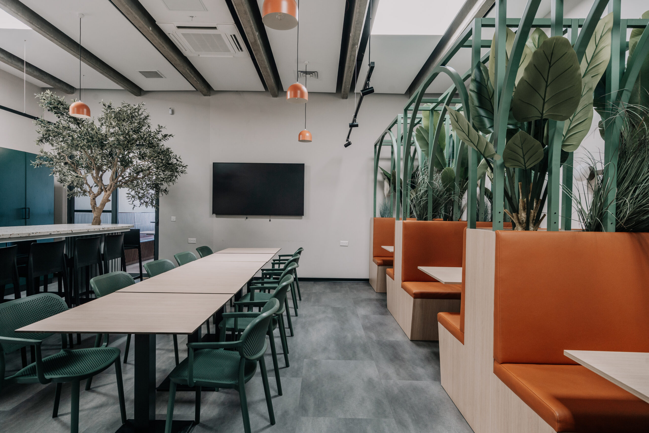 Il progetto attribuisce inoltre grande importanza alla presenza della vegetazione, utilizzata come dispositivo spaziale e atmosferico. Nei cortili degli uffici sono state introdotte strutture di seduta in cemento con fioriere integrate, mentre nella mensa cabine con fioriere incorporate creano spazi semi-raccolti pensati per pause, riunioni informali e momenti di collaborazione.