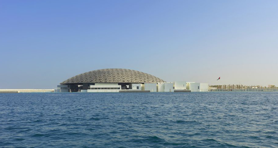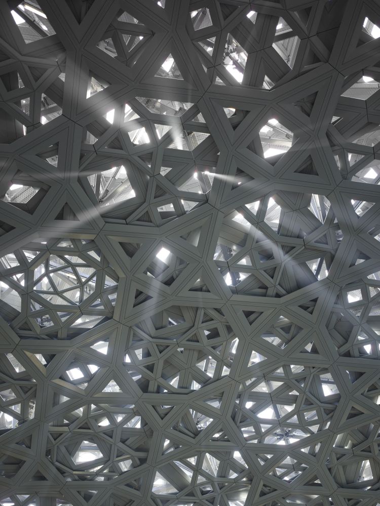 The steel dome of the Abu Dhabi Louvre is the expression of the perfect conclusion: a disc that rests lightly on top of the “museum village on the sea”, a cupola that reinterprets the lines of the traditional mosques while managing to add a touch of magic with its perforations through which the rays of sunlight penetrate and transform the Louvre into a dreamlike space; at night the museum becomes a natural planetarium with its stars created by the voids of the dome.