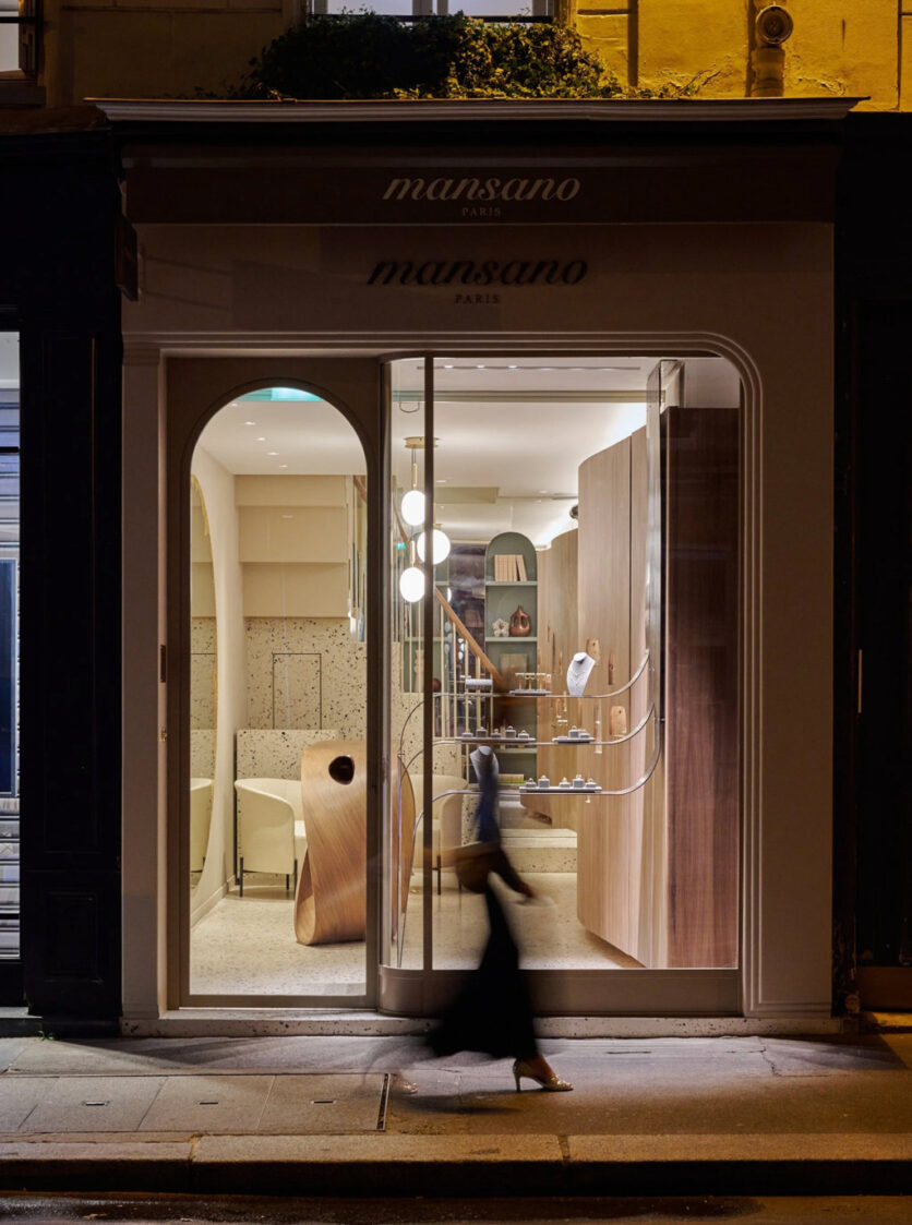 Located at 81 Rue du Bac, the Mansano boutique doesn’t announce itself loudly. It reveals itself slowly, like a secret. Designed by Clément Blanchet Architecture, the space, defined by the organic freedom of its forms, feels like an architectural extension of the jewelry it houses.