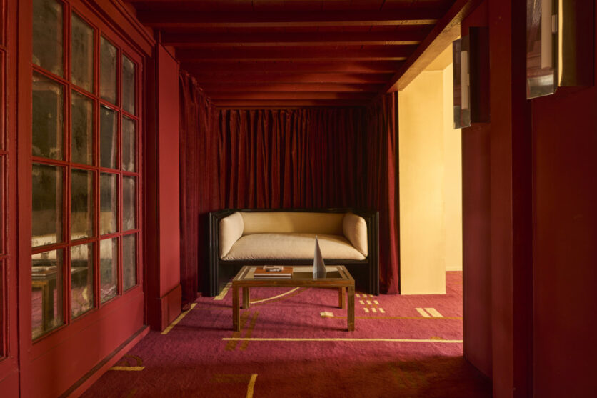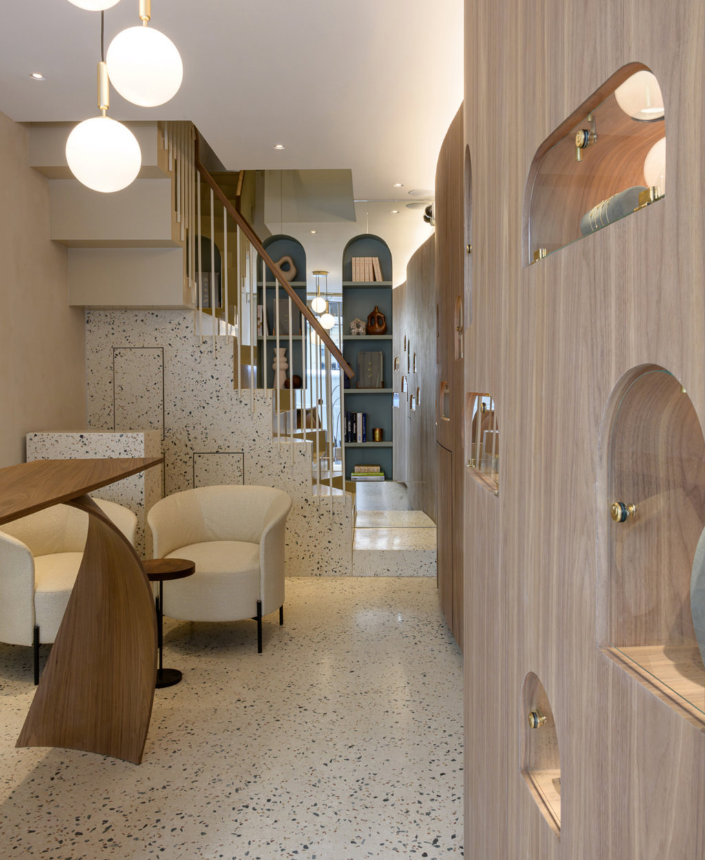 Adopting a reversal of the usual design process, the intervention privileges materials, terrazzo, walnut, and brass, allowing materiality to guide spatial expression, anchoring the result to the exaltation of the brand’s tactility and exclusivity through excellence in craftsmanship, durability, tradition, and modernity. A wave-like walnut wall unfolds rhythmically alternating a fluid composition of curves and countercurves, welcoming the exhibited pieces into its carved niches, echoing their soft geometries and creating a synergistic dialogue between object and environment. The gesture resonates with the curves of a central sculptural piece by Pierre Renart. Mirrors amplify depth blurring the boundary between inside and outside, between spectacle and intimacy. The city outside is absorbed, refracted, and reintroduced. A monolithic terrazzo staircase leads to an upper floor, where soft lighting and enveloping furnishings define a more intimate and cozy world. Works of art punctuate the space, not as decoration, but as moments of respite. They introduce surprise, companionship, and narrative layers, complementing the exclusivity and exquisite originality that distinguish the collection.