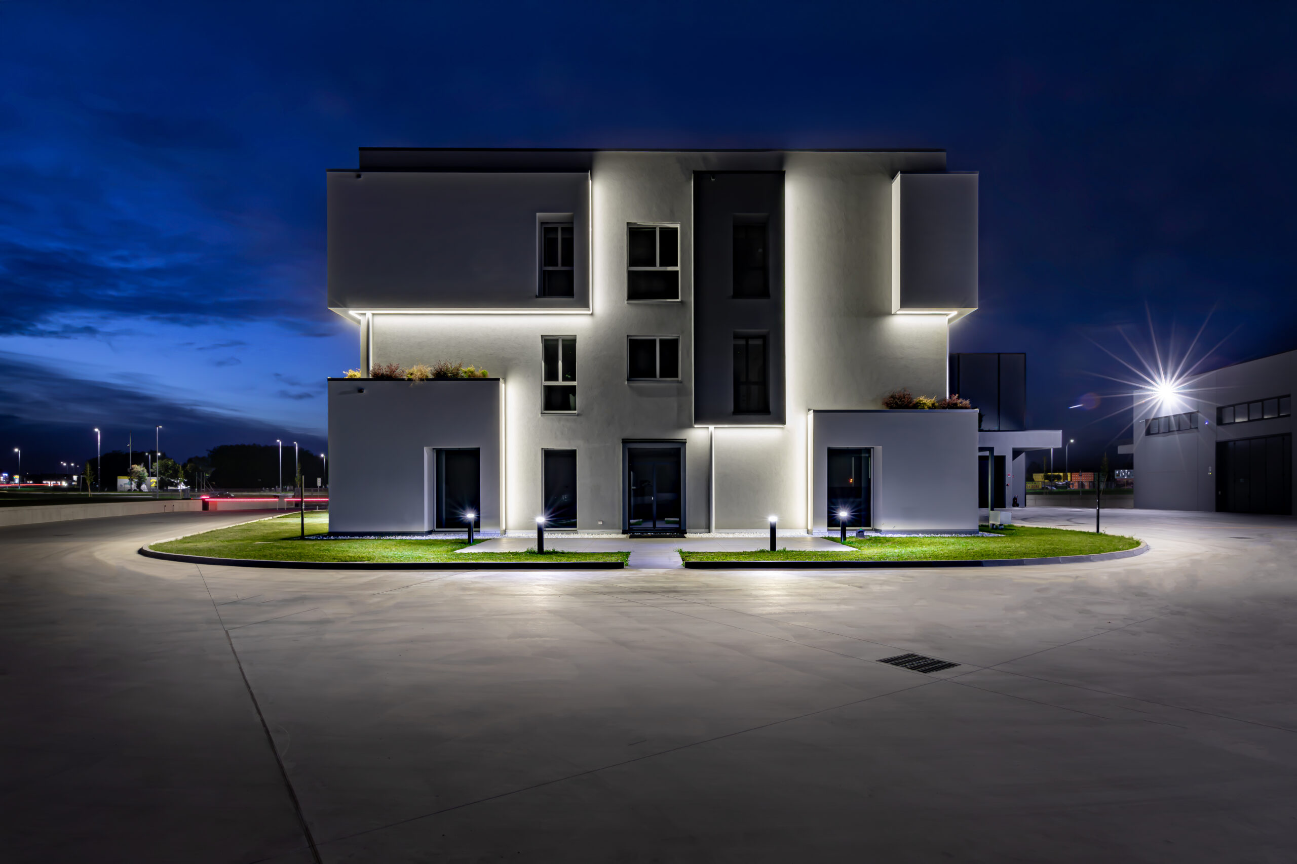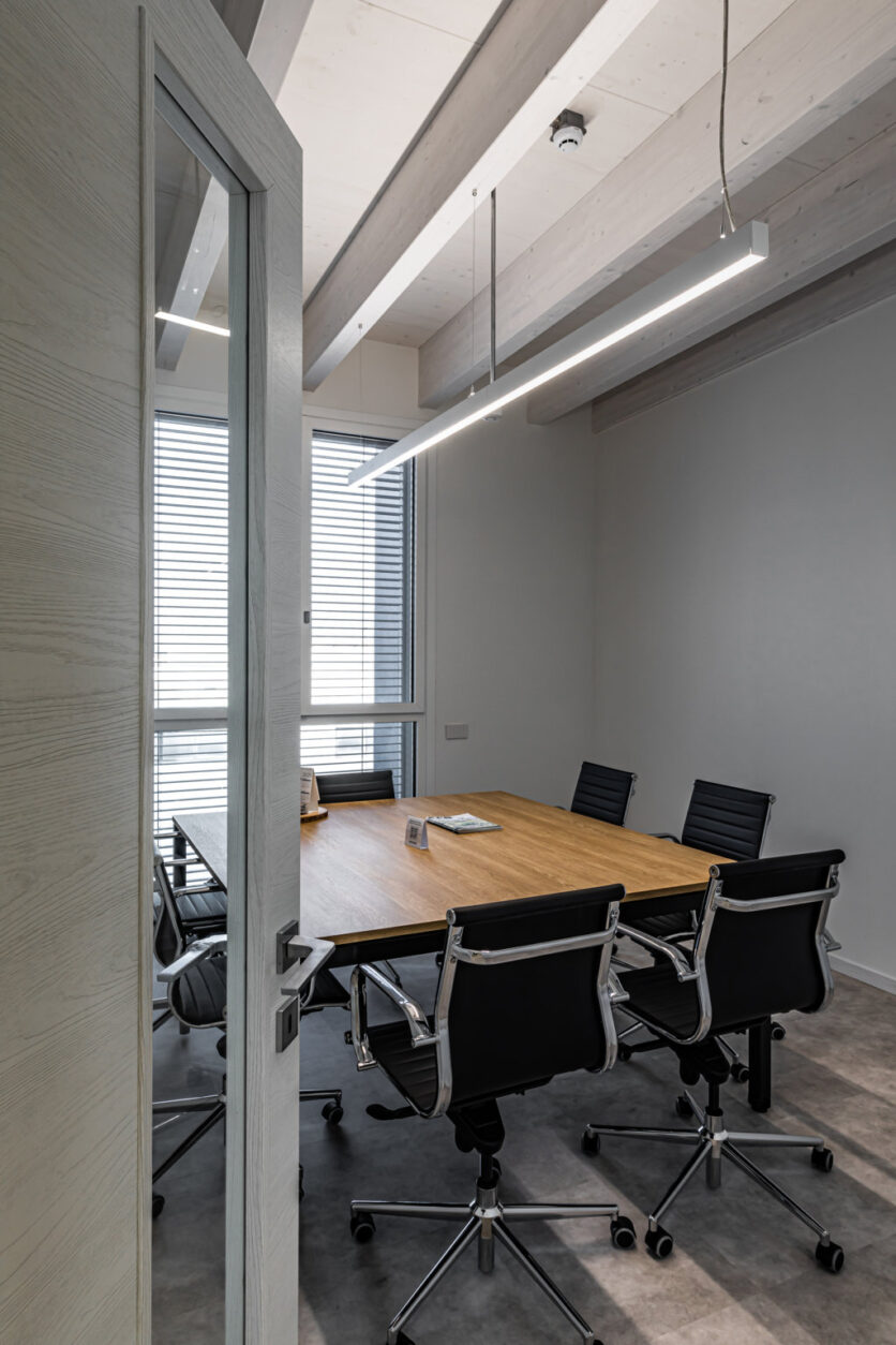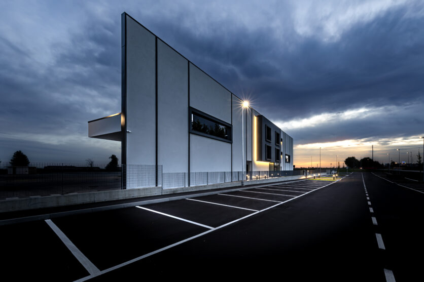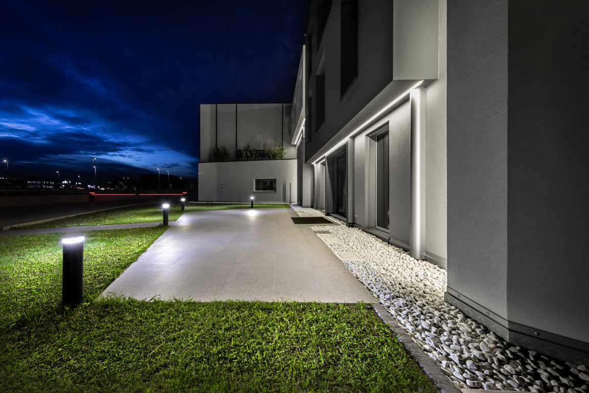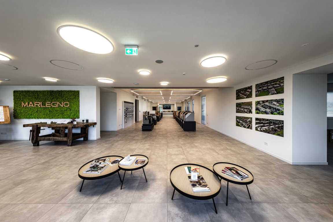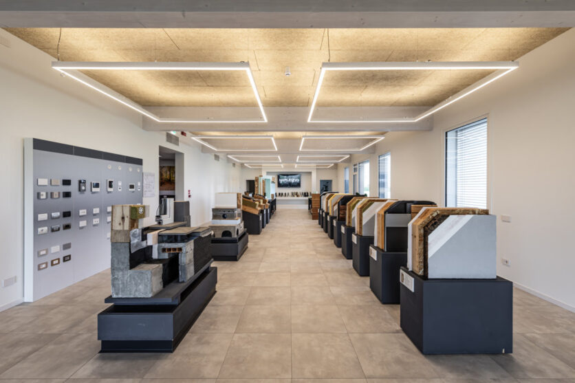 Un ruolo centrale è affidato al progetto illuminotecnico, sviluppato con prodotti PERFORMANCE iN LIGHTING, che ha contribuito a valorizzare spazi e funzioni con soluzioni in grado di garantire efficienza energetica e qualità visiva. Le aree esterne sono percorse da una luce controllata e priva di dispersioni verso l’alto grazie ai bollard INDEX+, vincitori dell’iF Design Award 2025, che contribuiscono alla tutela del cielo notturno. Gli ingressi si distinguono invece per composizioni sospese e a soffitto degli apparecchi SL713PL ROUND LED e SL713AB ROUND LED, capaci di creare scenografie luminose accoglienti e di forte impatto. Lo showroom e gli uffici beneficiano di configurazioni personalizzate delle canaline luminose SL764+ PL e SL787+ PL, sviluppate attraverso il configuratore LIGHT PERFORMER: nello showroom queste forme delineano geometrie quadrangolari che sottolineano i prodotti esposti, mentre negli spazi operativi la luce diretta sostiene il lavoro quotidiano e quella indiretta valorizza la trama del legno a soffitto.