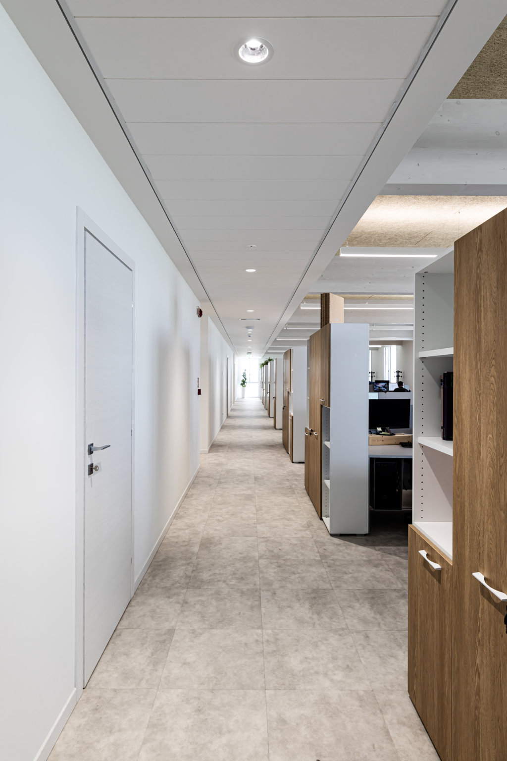 Nelle sale riunioni la flessibilità è assicurata dagli apparecchi PLATO 600 MP integrati nei controsoffitti, che permettono di modulare l’illuminazione a seconda delle attività, mentre i corridoi trovano continuità luminosa in downlight dalle diverse dimensioni come ELIA AL e DL ROUND MIDI. A garantire sicurezza e comfort nelle aree di passaggio e nelle scale intervengono gli apparecchi WL260 SQUARE, installati a parete o soffitto. L’intero intervento è stato sviluppato attraverso una modellazione BIM parametrica che ha facilitato il coordinamento tra architettura, impiantistica e progettazione illuminotecnica, permettendo di verificare rapidamente le interazioni tra gli elementi e di raggiungere standard elevati in termini di sostenibilità energetica e qualità esecutiva.