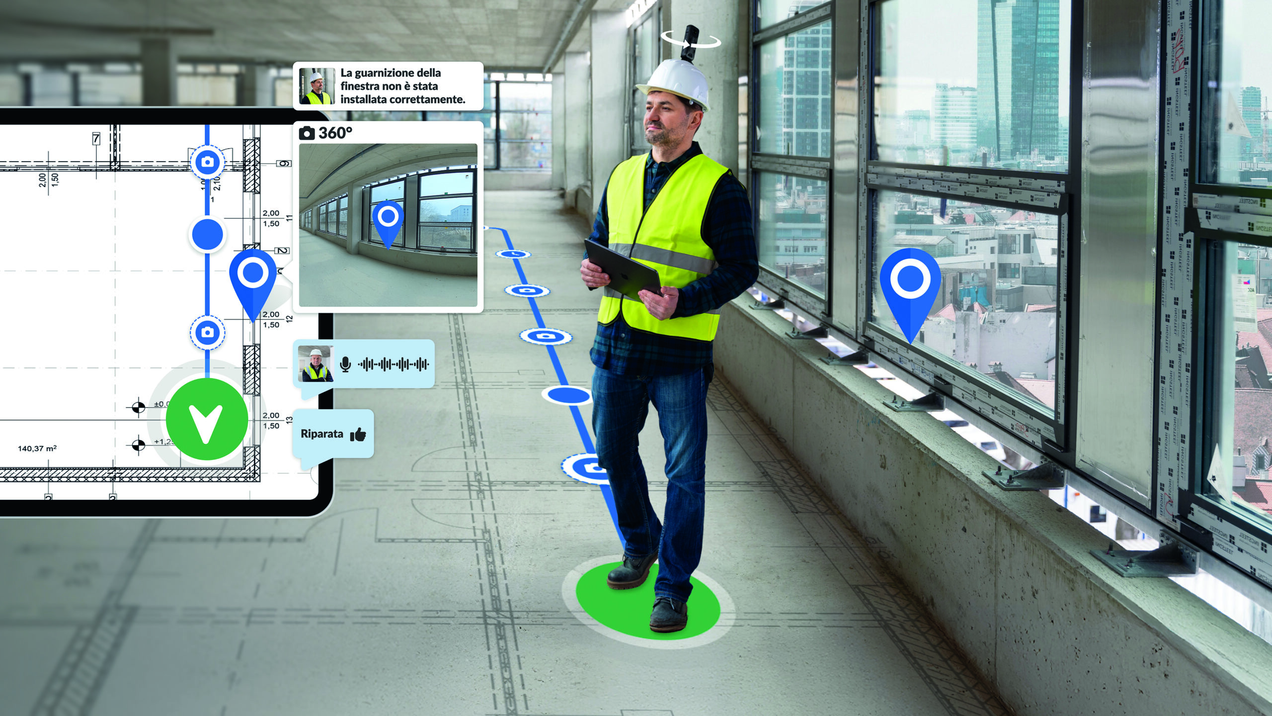 In questo scenario si colloca SiteView, funzionalità di visual documentation sviluppata da PlanRadar per acquisire immagini a 360° durante i sopralluoghi in cantiere. Attraverso algoritmi di visione artificiale e tecnologia SLAM, le immagini vengono automaticamente allineate alle planimetrie 2D, generando una documentazione visiva geolocalizzata e puntuale dello stato di avanzamento dei lavori. Il sistema consente anche di confrontare immagini rilevate in momenti differenti, facilitando l’individuazione di progressi o scostamenti rispetto alle previsioni. La creazione di basi dati visive accurate e verificabili rappresenta un presupposto fondamentale per valorizzare i processi di automazione e abilitare applicazioni concrete di AI.