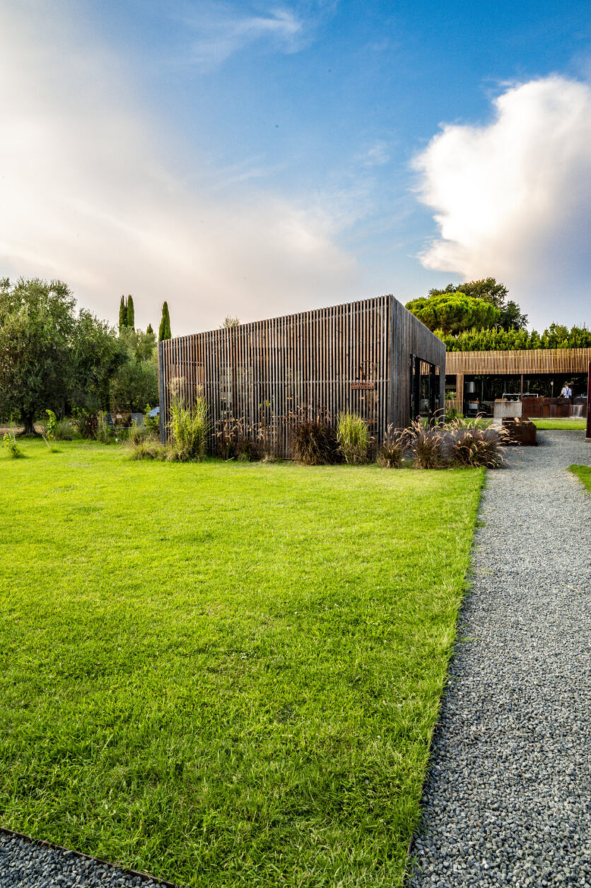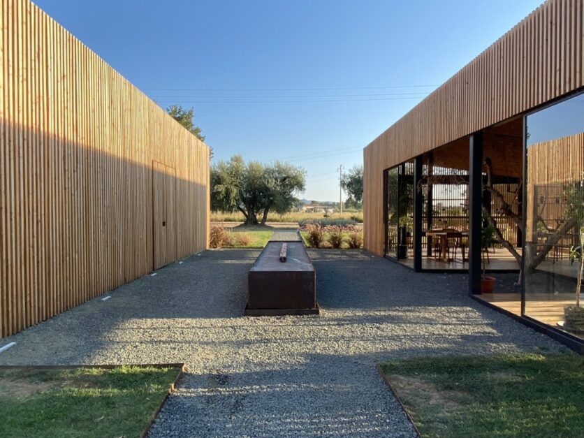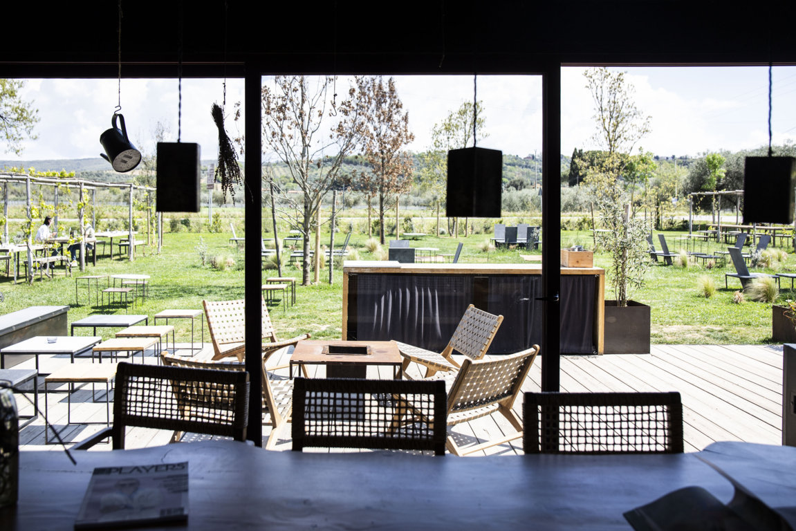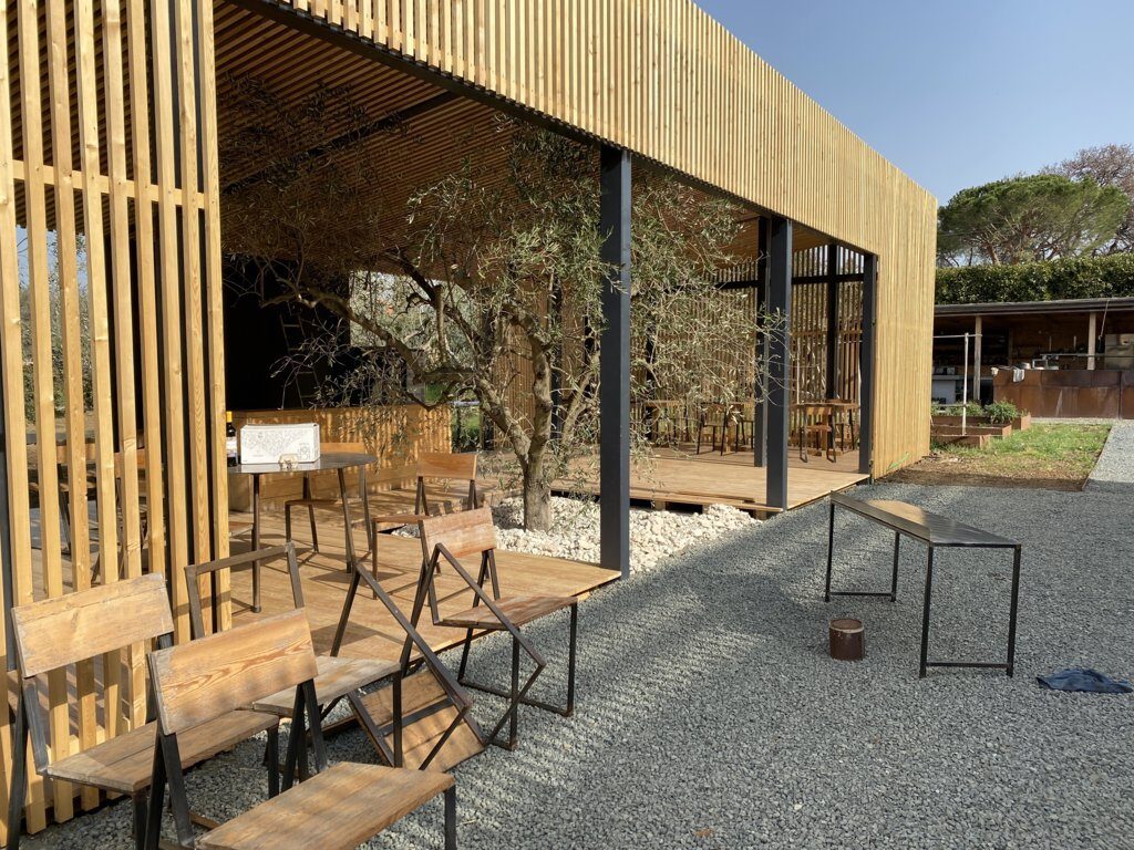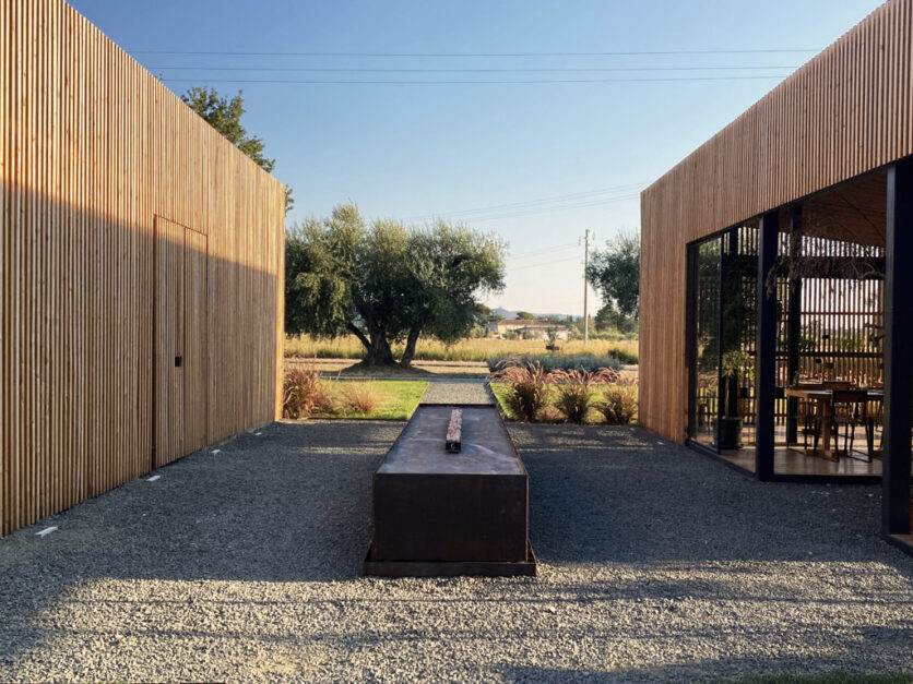 After an initial phase marked by a DIY setup, the couple entrusted the Florentine practice q-bic with reimagining the Podere’s spaces through an architectural language designed to harmonize with the surrounding landscape. The intervention focused on the two culinary identities of the estate: Bolgheri Green, an informal bistro and tapas bar, and the new Osteria Ancestrale, a gourmet vegetarian restaurant.
