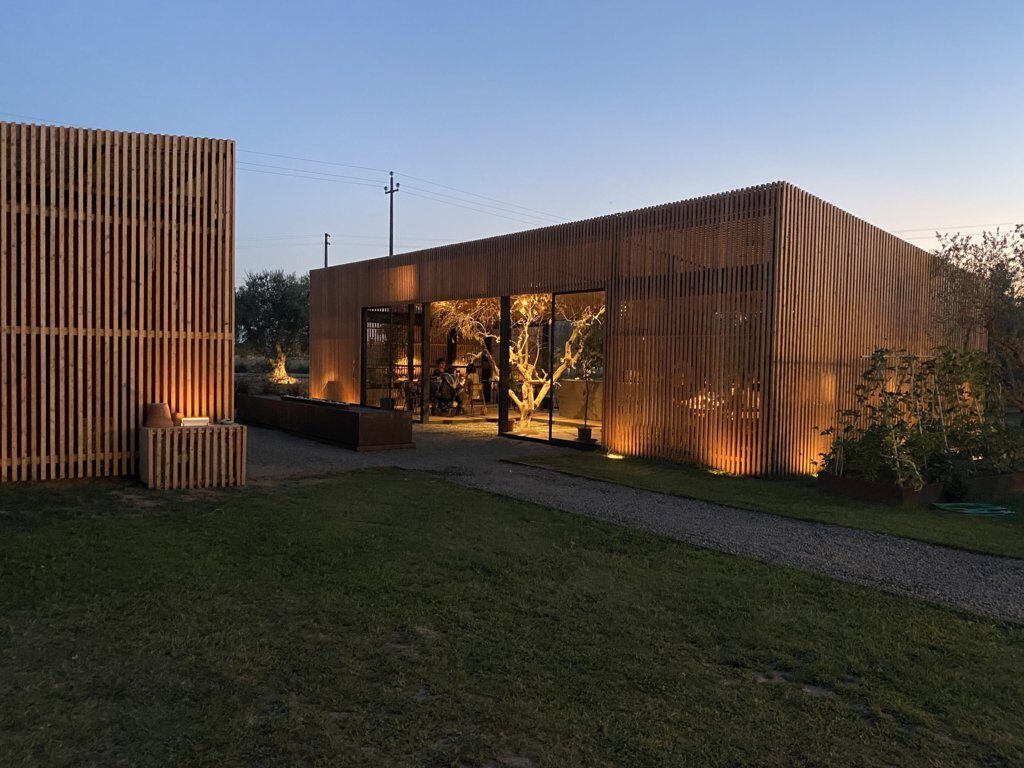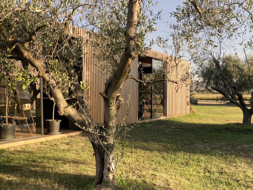 Wood serves as the guiding material, creating a visual continuity between the structures while ensuring a sustainable footprint and allowing the owners to take an active role in the construction process. Slatted walls, placed at regular intervals, frame views of the vineyards and olive groves, while shelving filled with in-house ferments and preserves narrates the farm’s zero-kilometer production.
