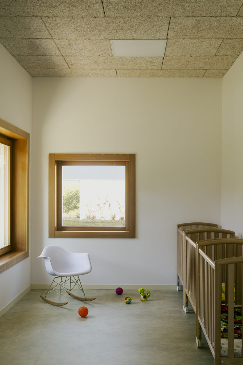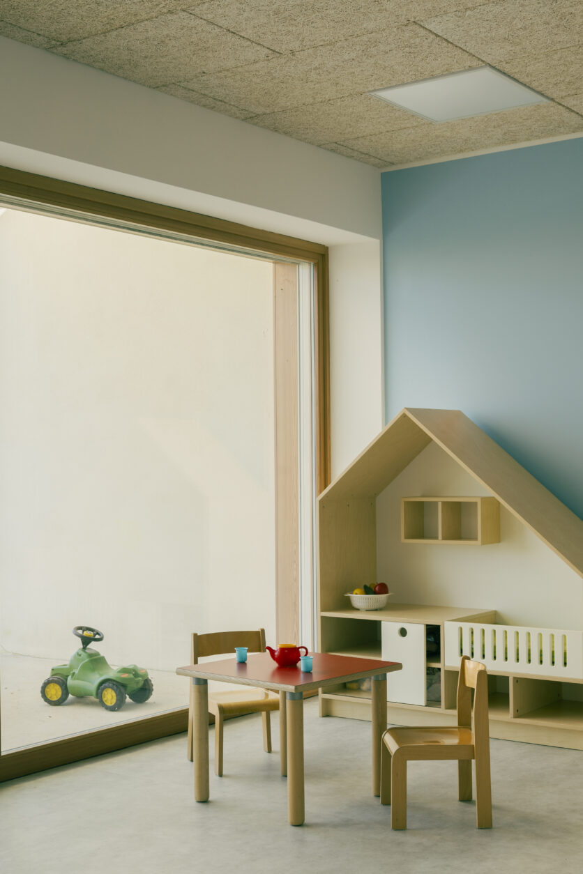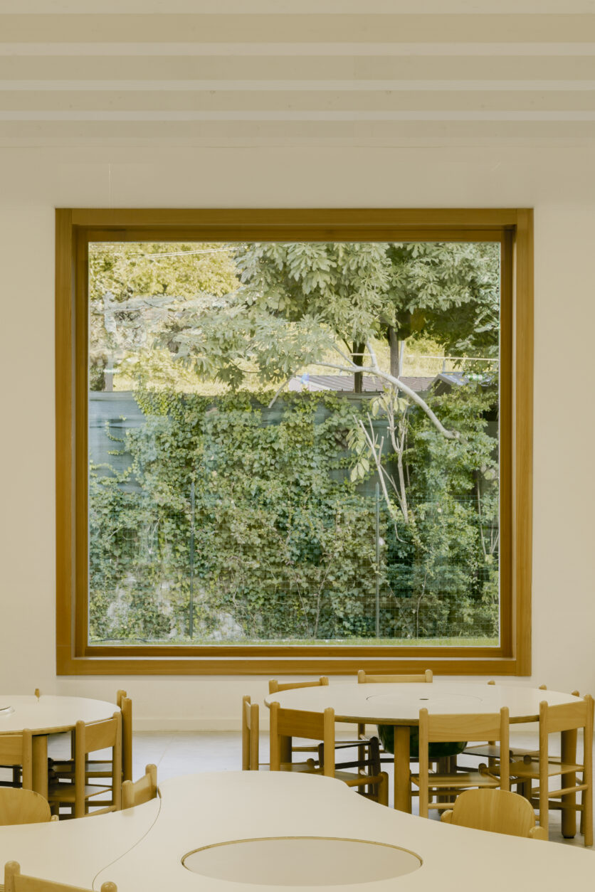 Gli ambienti interni sono progettati per stimolare benessere, curiosità e relazione. L’asilo nido si articola in tre sezioni indipendenti, ciascuna con accesso diretto al parco, rafforzando il legame tra apprendimento e natura. Il suo spazio centrale è caratterizzato da un controsoffitto a capanna, che richiama la forma archetipica della casa e contribuisce a creare un’atmosfera accogliente e familiare.