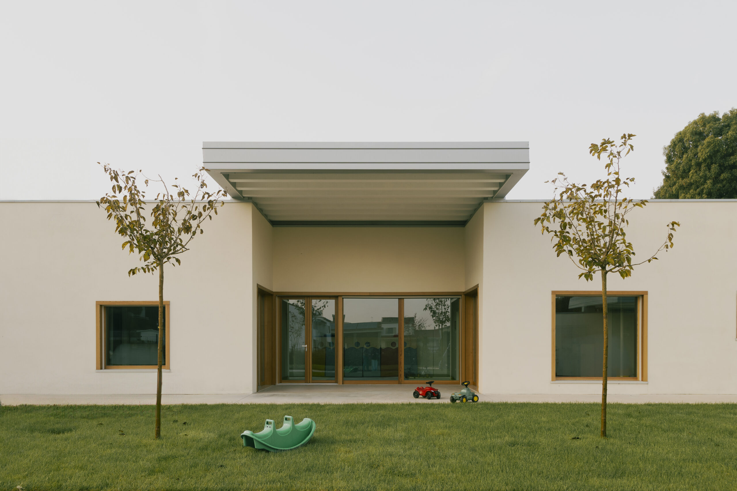 La scuola dell’infanzia si sviluppa attorno a un’ampia agorà centrale, dalla quale si diramano gli spazi verso i laboratori. Qui, un controsoffitto a botte e una palette cromatica vivace contribuiscono a creare un ambiente dinamico e stimolante, pensato per alimentare l’immaginazione dei bambini. All’esterno, il parco è arricchito da una struttura polifunzionale concepita come teatro all’aperto, destinato ad attività educative e momenti collettivi.