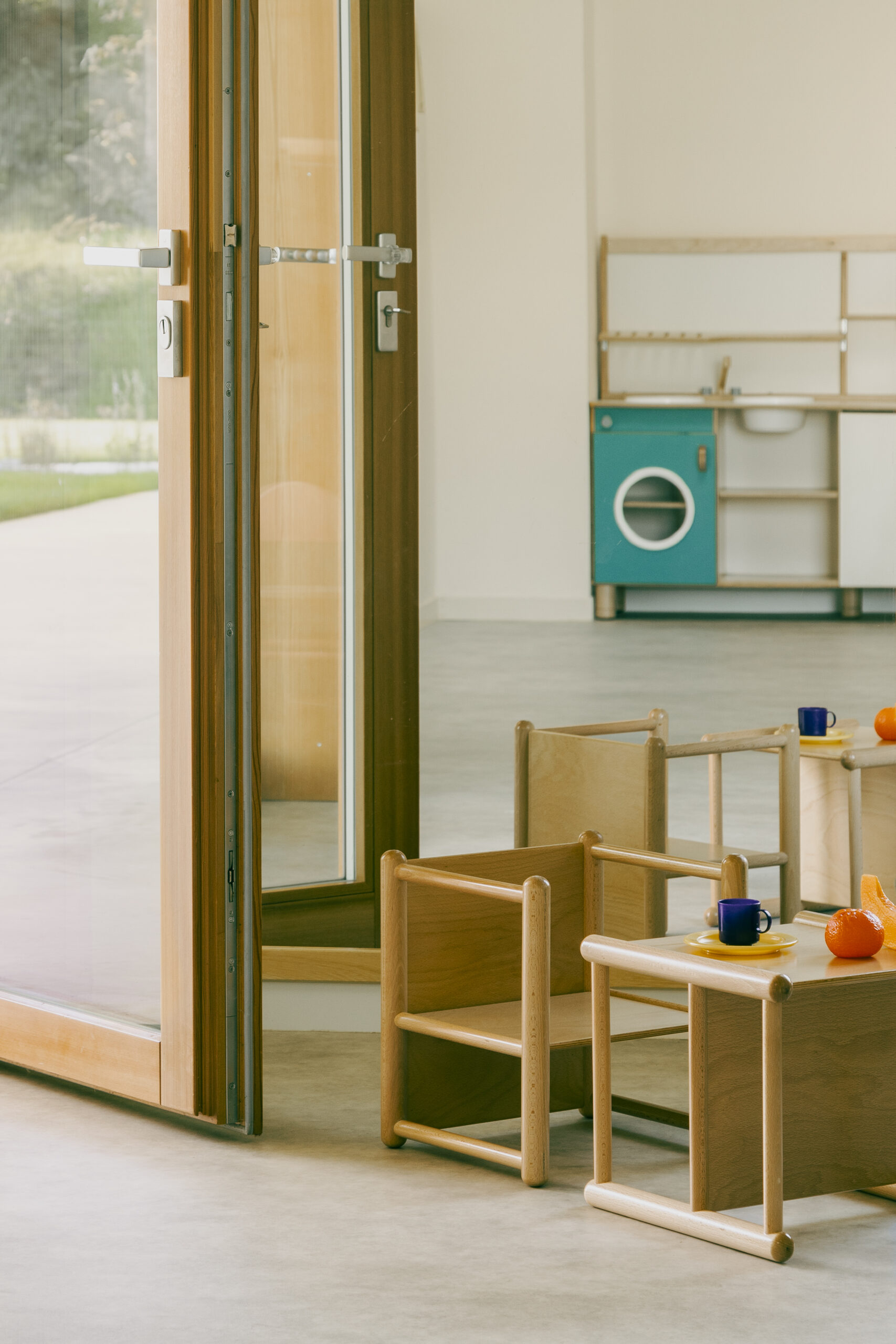 Gli ambienti interni sono progettati per stimolare benessere, curiosità e relazione. L’asilo nido si articola in tre sezioni indipendenti, ciascuna con accesso diretto al parco, rafforzando il legame tra apprendimento e natura. Il suo spazio centrale è caratterizzato da un controsoffitto a capanna, che richiama la forma archetipica della casa e contribuisce a creare un’atmosfera accogliente e familiare.