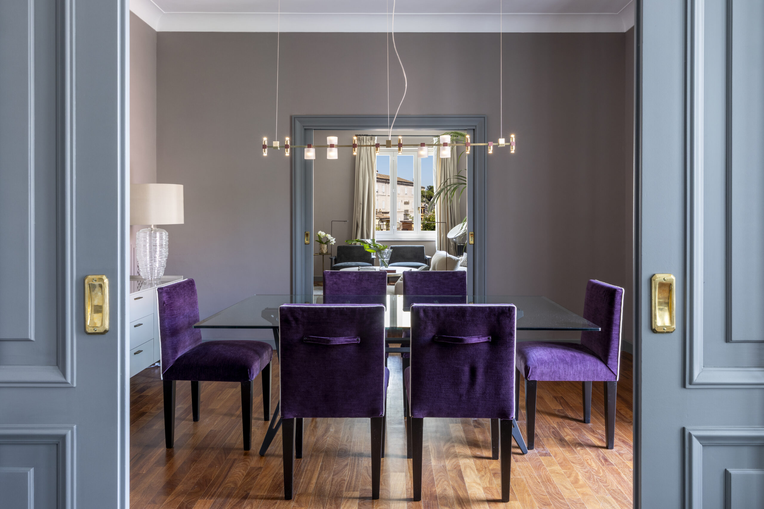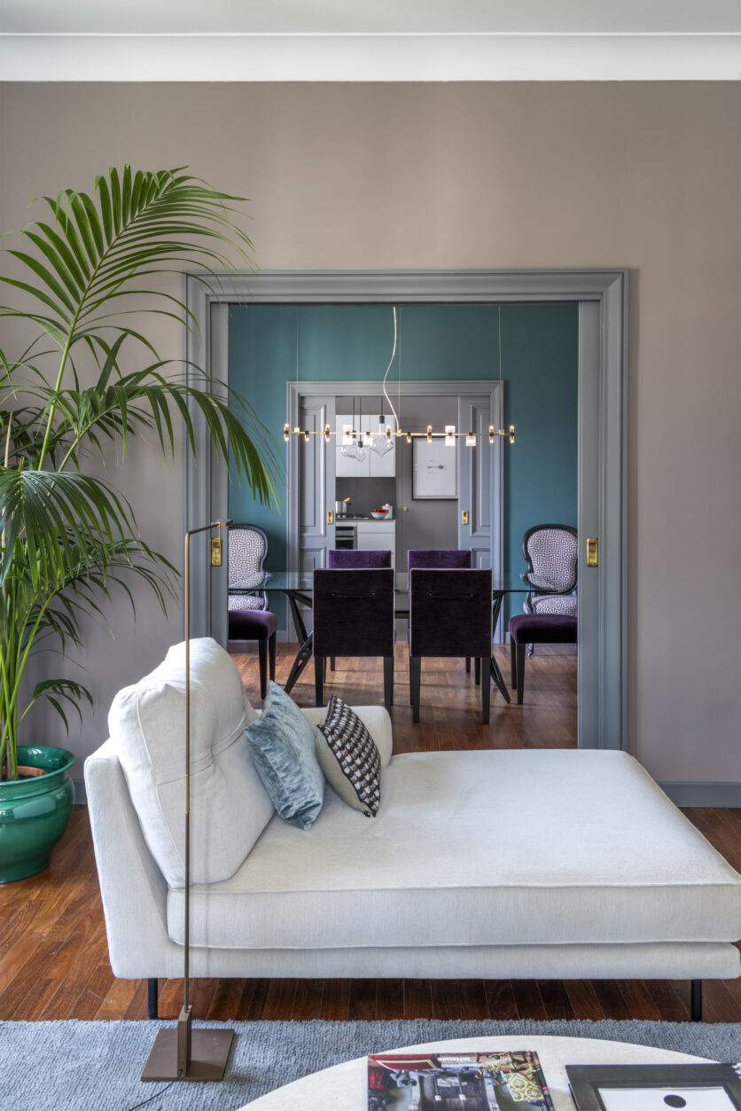 Throughout the interior, minimalism is punctuated by bold color accents – from aquamarine cushions to aubergine dining chairs – while cappuccino-toned walls alternate with deeper hues, forming a sequence of almost theatrical backdrops.