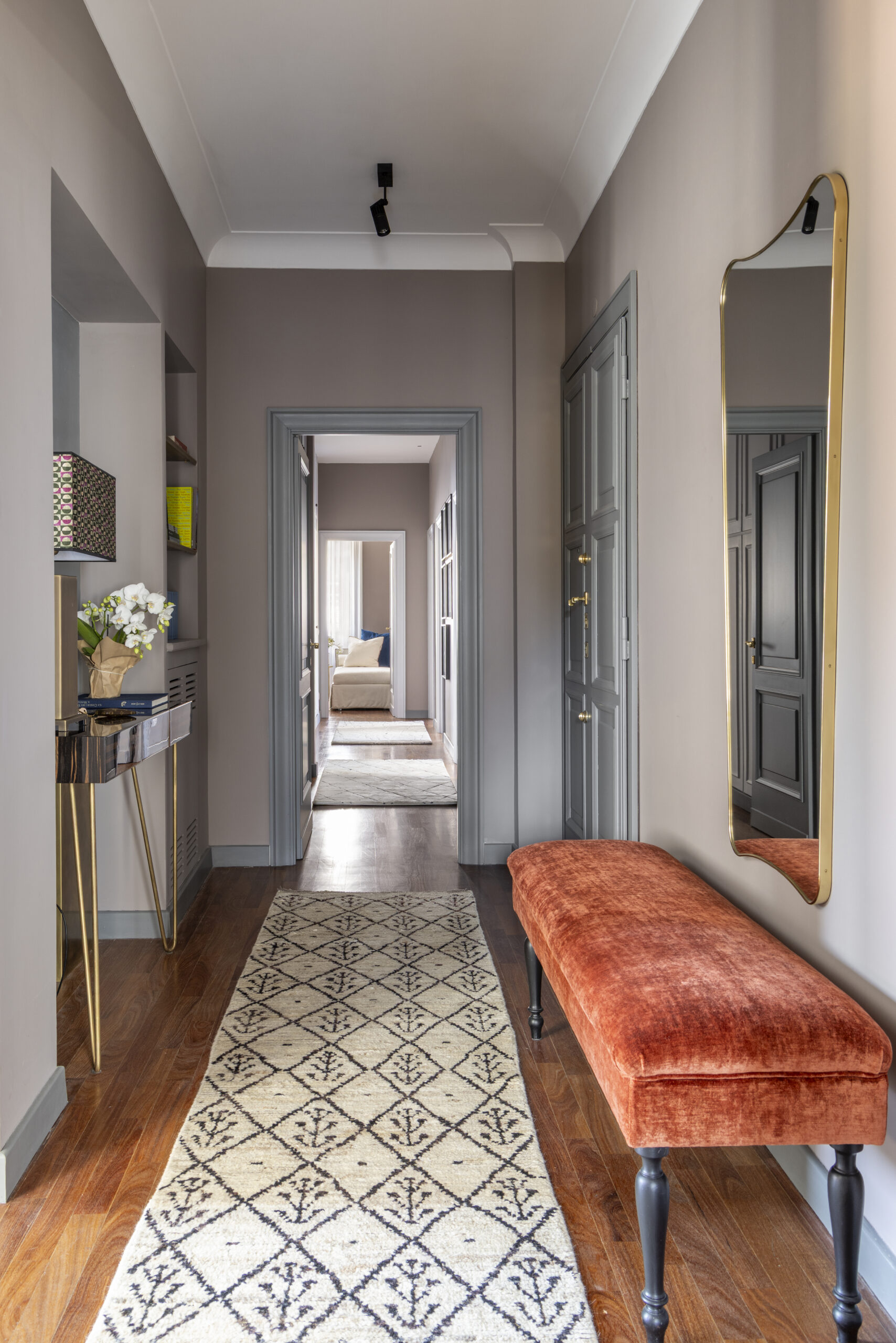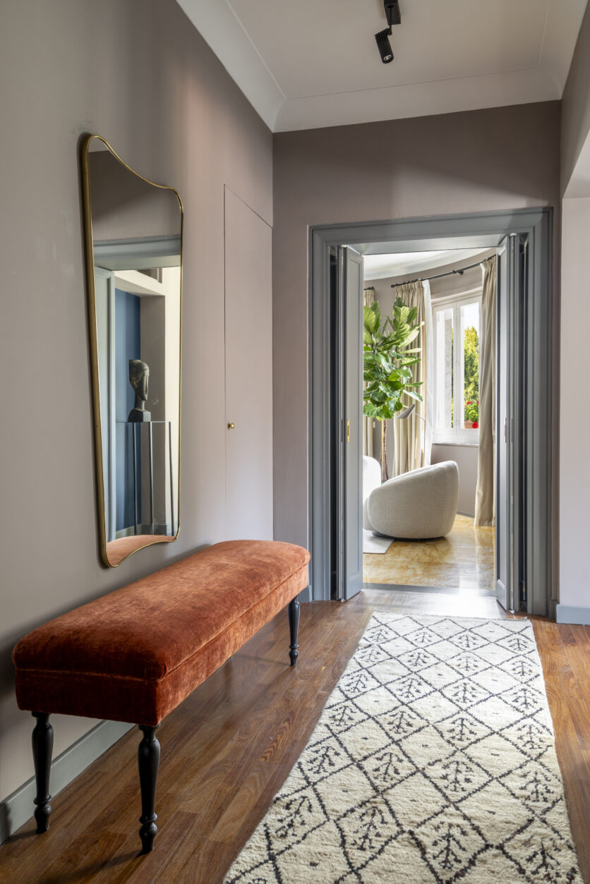 The project unfolds as a composition of refined minimalism, enriched by carefully calibrated eclectic moments. The entrance sets the tone: a mirror hangs above a vintage bench upholstered in rust-colored velvet, introducing the apartment’s sophisticated narrative.