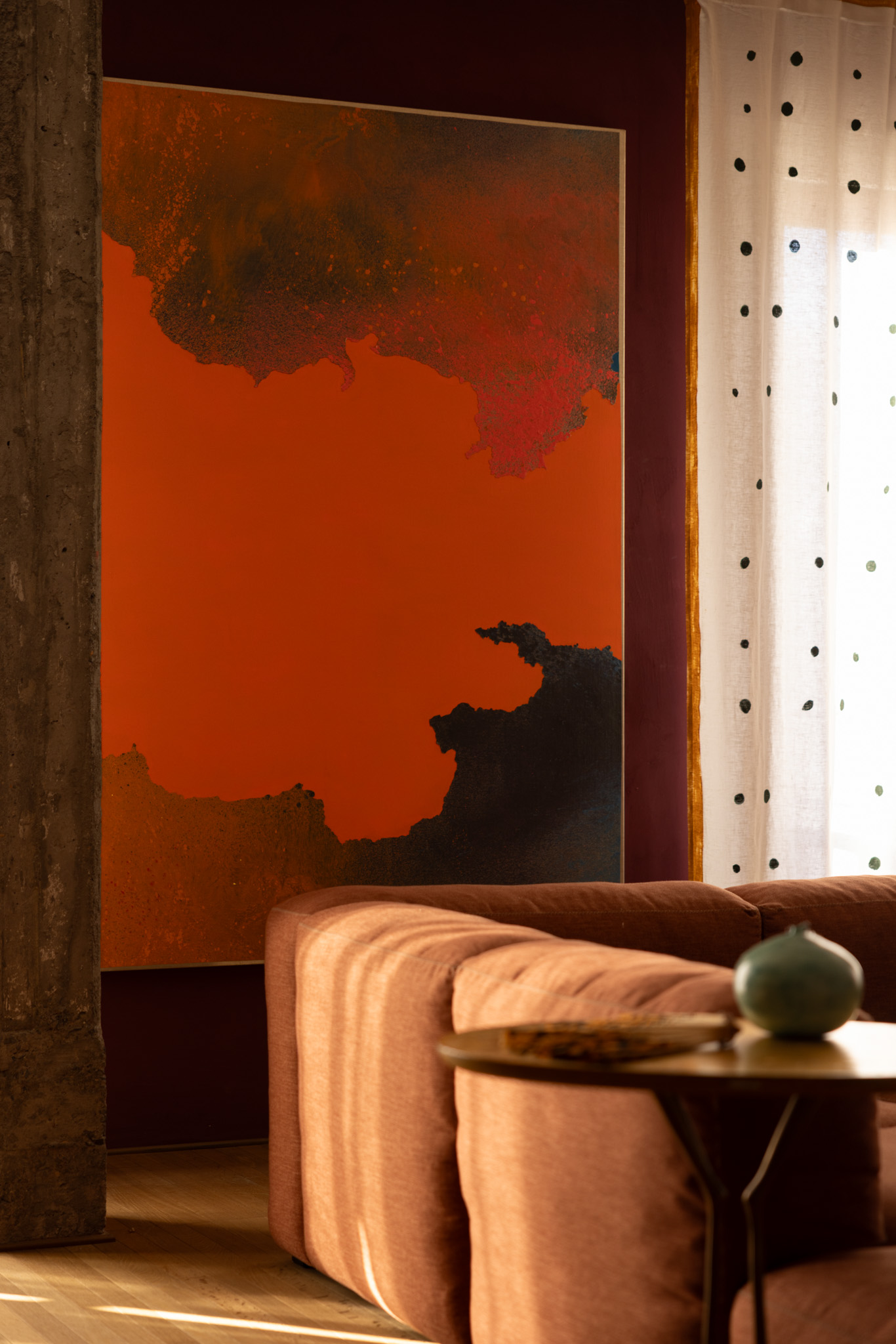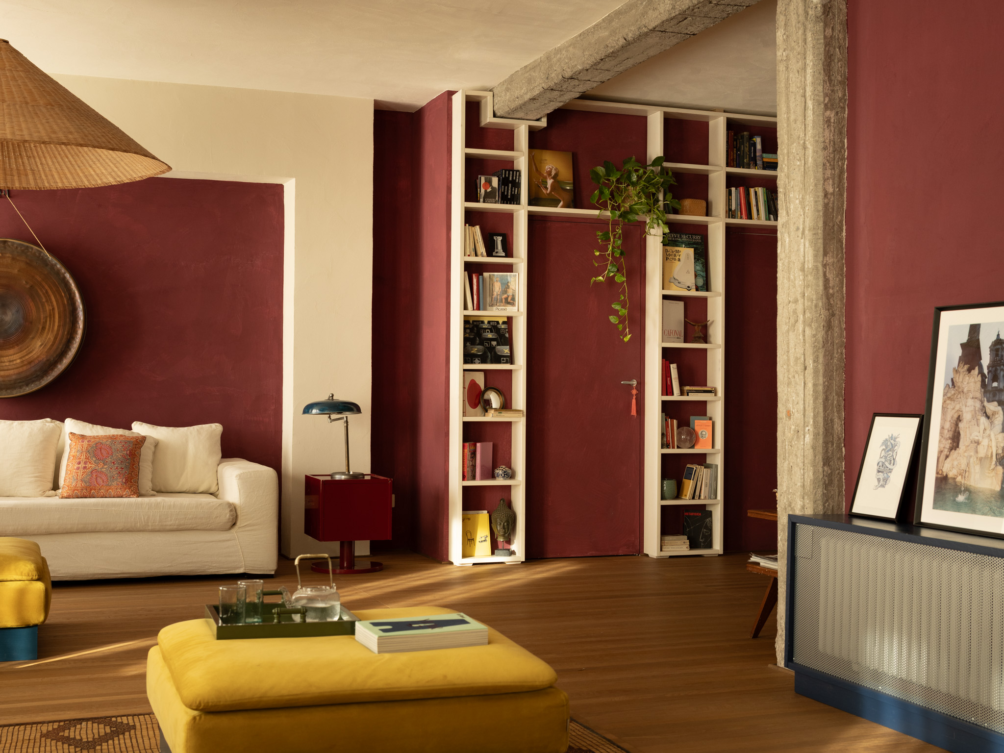 Furniture plays a fundamental role in defining the space, moving between mid-century pieces, contemporary design, and custom-made elements. This controlled heterogeneity generates a dynamic balance, in which each component contributes to the construction of a coherent yet non-uniform interior landscape. Works by young Italian artists and site-specific installations—such as decorative interventions on ceilings—further amplify this narrative dimension, turning the apartment into a true expressive platform.