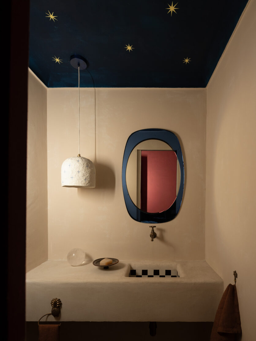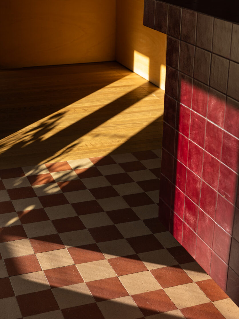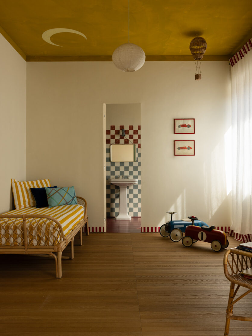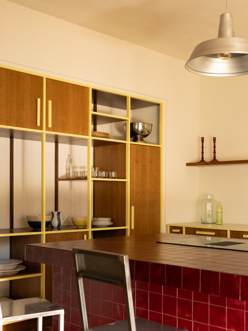 The selection of materials reveals a particular attention to the tactile and artisanal dimension of the project. The compacted stone flooring, arranged in a checkerboard pattern, introduces a visual rhythm that dialogues with vertical surfaces, while the kitchen island, clad in hand-painted tiles, becomes both a focal element and a narrative device. The large teak floorboards, extending throughout the rooms, establish a warm and continuous base capable of absorbing and reflecting the chromatic variations of the interiors.