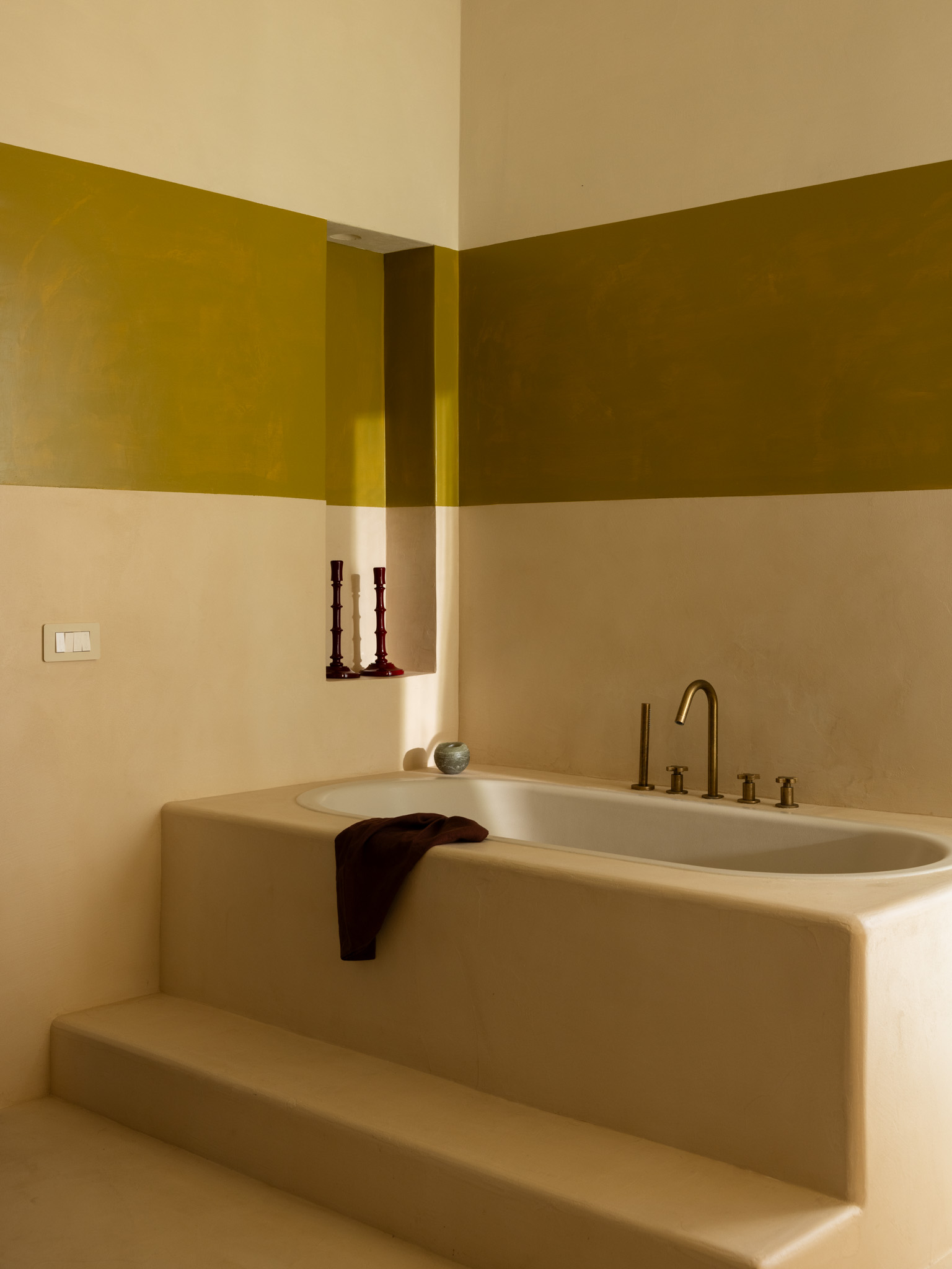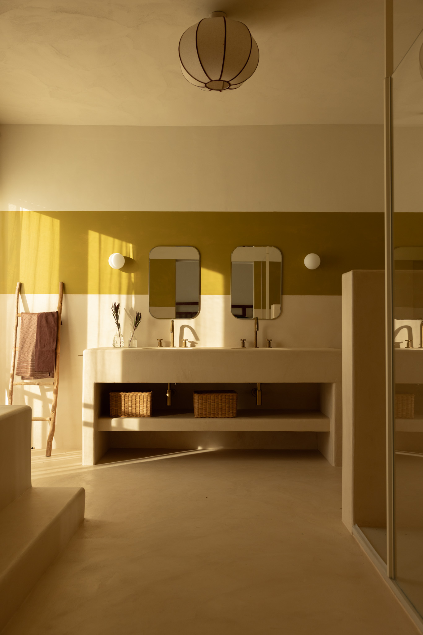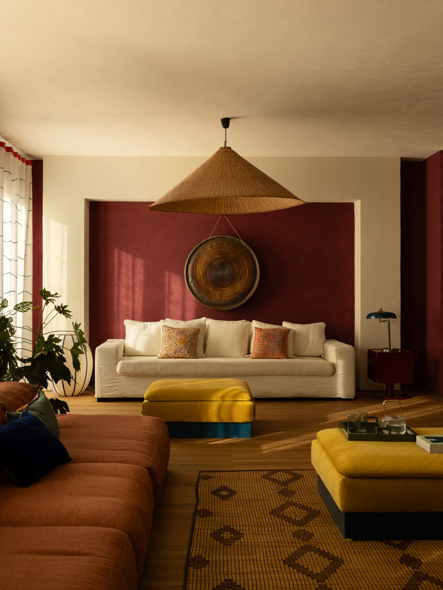 The selection of materials reveals a particular attention to the tactile and artisanal dimension of the project. The compacted stone flooring, arranged in a checkerboard pattern, introduces a visual rhythm that dialogues with vertical surfaces, while the kitchen island, clad in hand-painted tiles, becomes both a focal element and a narrative device. The large teak floorboards, extending throughout the rooms, establish a warm and continuous base capable of absorbing and reflecting the chromatic variations of the interiors.