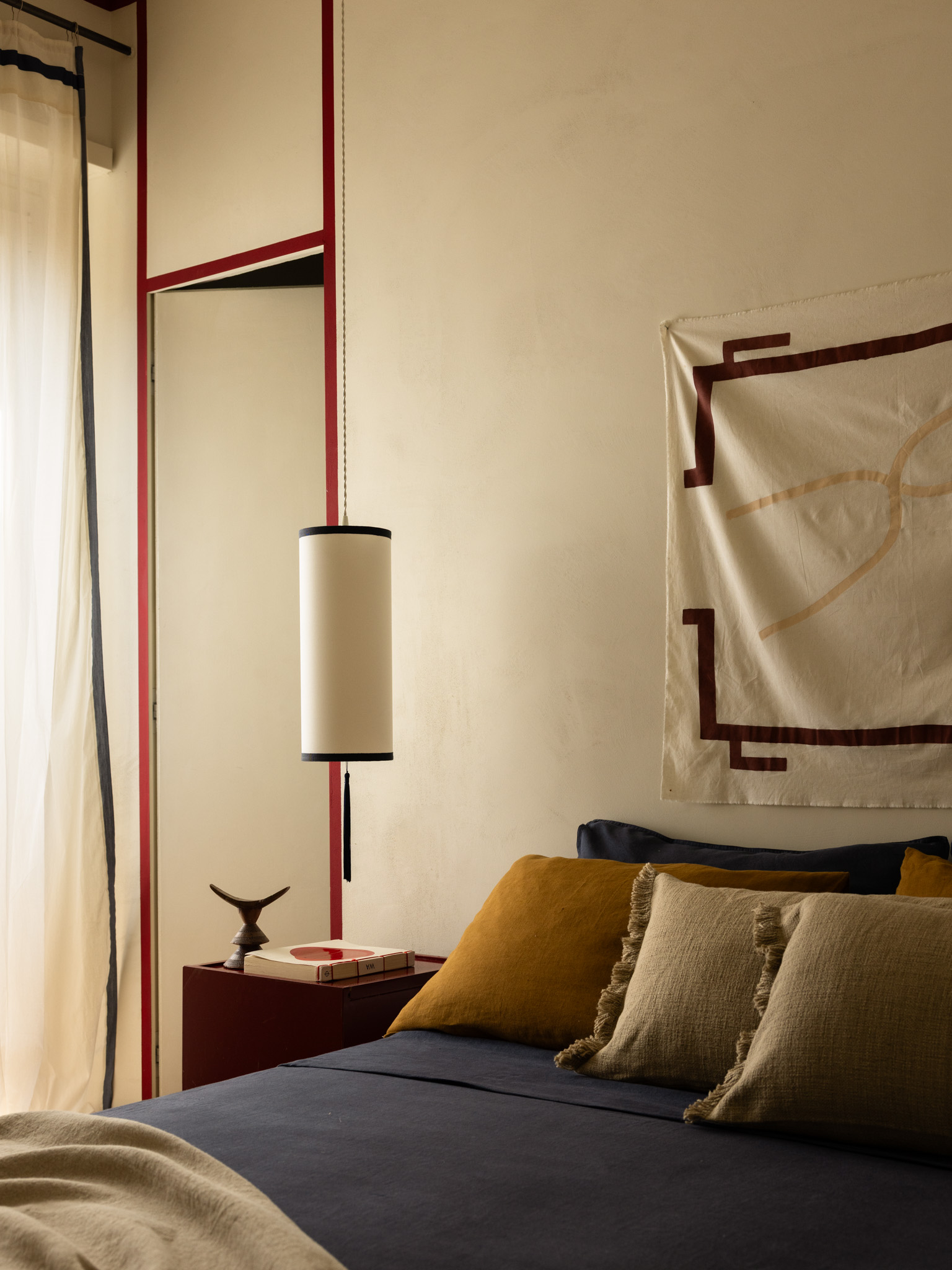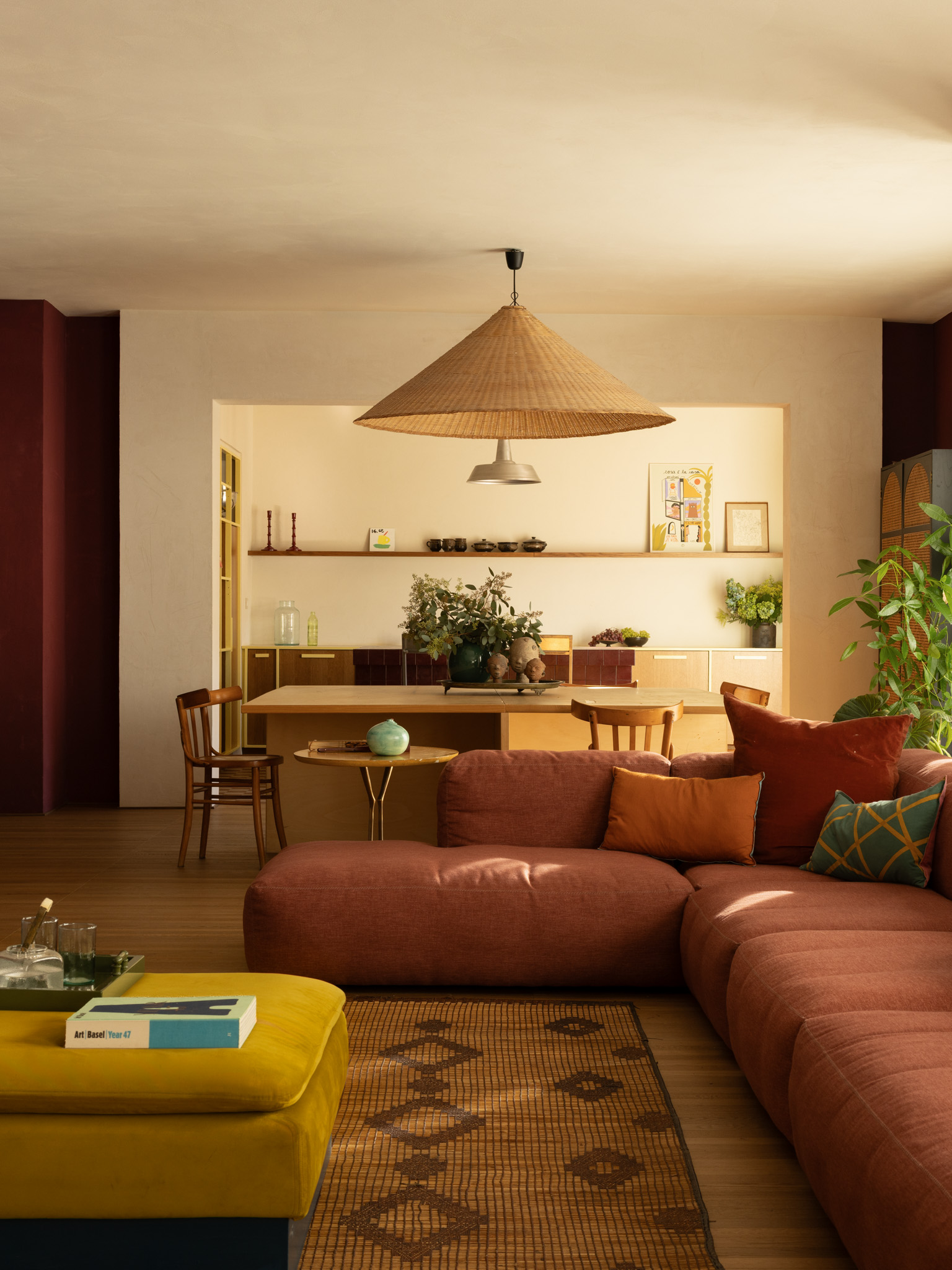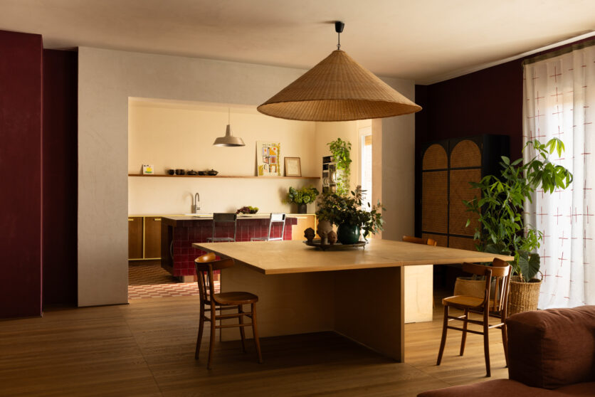 The heart of the project is the living area, conceived as a relational field in which kitchen and living room intertwine. Here, the design operates through the layering of materials, colors, and textures: the wood of the custom-made kitchen engages with the vibrant surface of the walls, immersed in a wine-red tone that lends depth and perceptual density to the space. Light, filtered and reflected by the surfaces, contributes to shaping a warm and enveloping atmosphere, in which the domestic dimension acquires an almost scenographic quality.