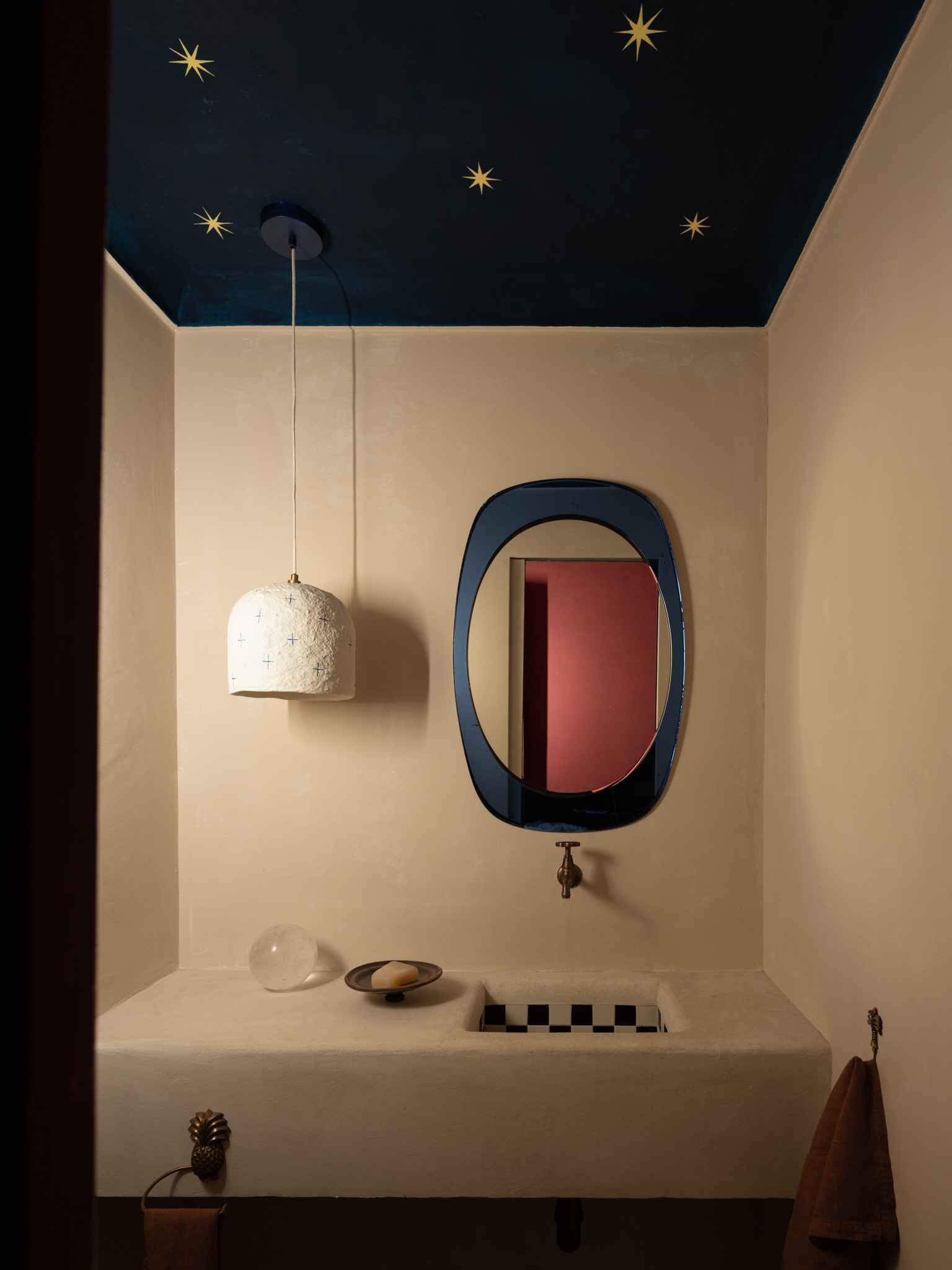 The sleeping area is organized as a more intimate and autonomous domain, accessed through a separate entrance that reinforces its sense of privacy. Here, the project emphasizes personalization through decorative interventions executed on site, transforming each space into a unique episode. Bathrooms and bedrooms thus become experimental fields, where surfaces and details contribute to the construction of a strongly identity-driven domestic narrative.