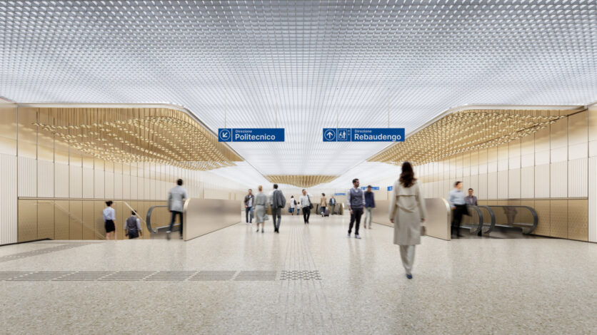 La stazione San Giovanni Bosco, lungo il nuovo parco lineare dell’ex Trincerone, si configura come un padiglione nel paesaggio: una struttura fuori terra, permeabile e attraversabile, che è al tempo stesso infrastruttura e spazio pubblico. L’identità interna è definita da un pattern ispirato alla croce, in riferimento all’ospedale vicino, rafforzando il legame tra architettura, funzione e contesto.