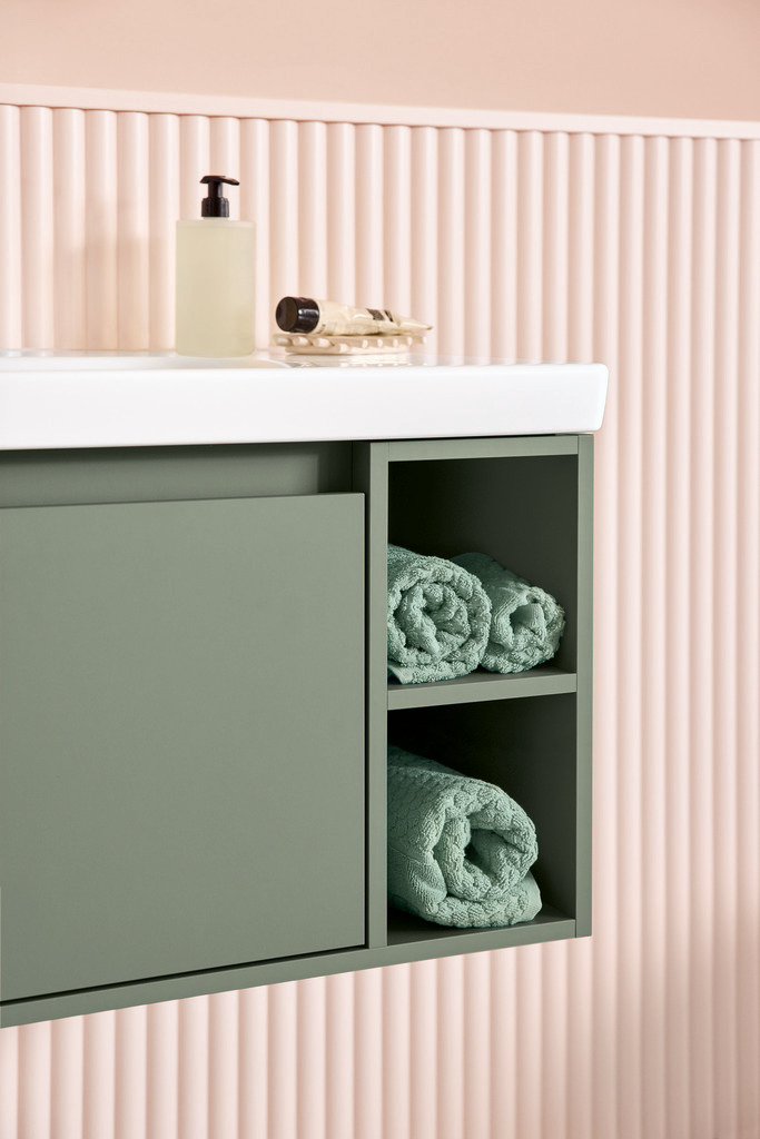The feeling of continuity and harmony is reinforced by the smooth transition between the washbasin and the cabinet, which feature smooth fronts and recessed handles to emphasise a clean and sophisticated aesthetic, capable of integrating into different contexts while maintaining a strong personality. Thanks to a range of modern colours for the cabinets and two finishes for the taps, Skyla lends itself to multiple stylistic interpretations, from Scandinavian minimalism to boho atmospheres, to pastel shades inspired by the most delicate Nordic design.